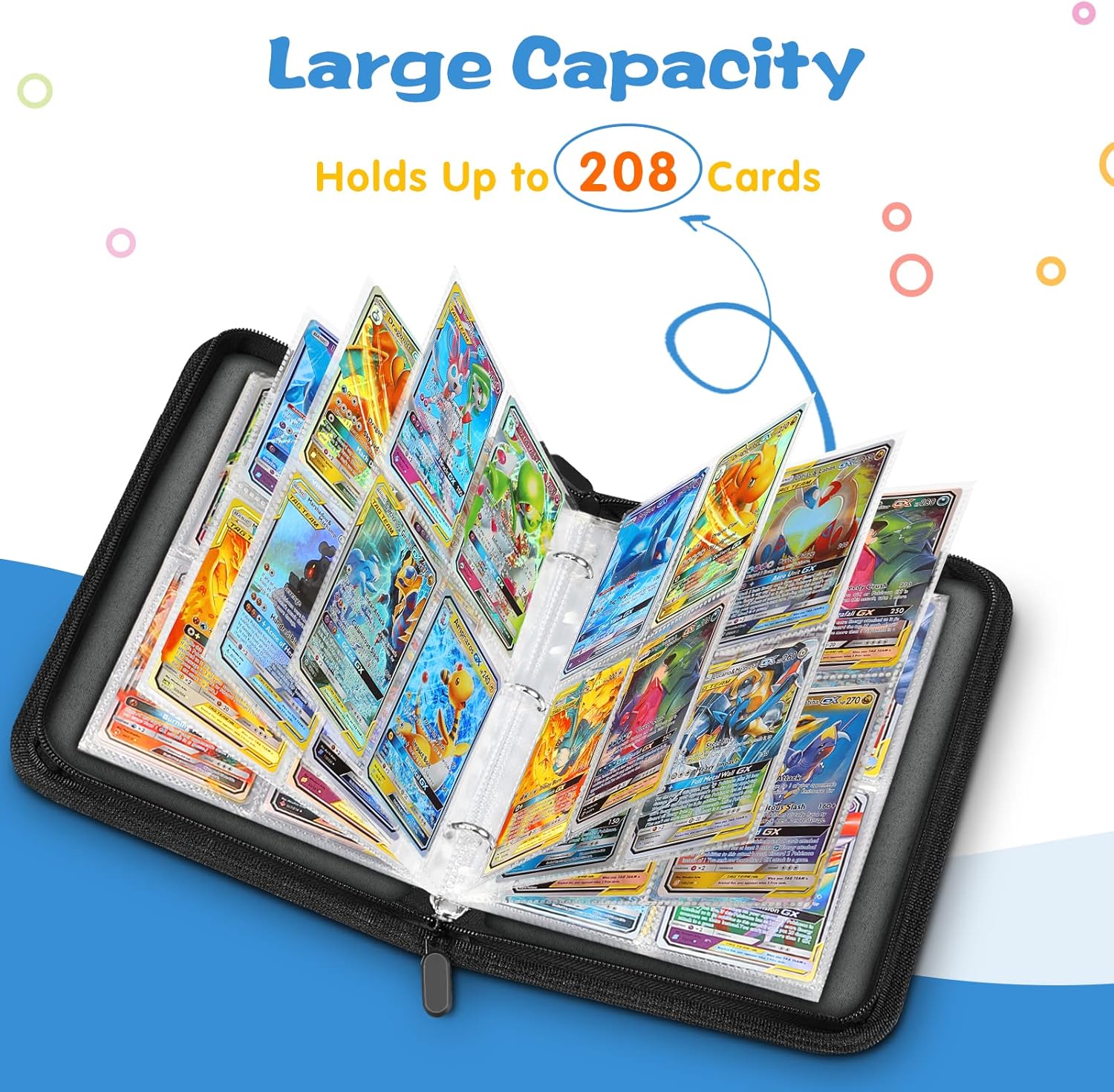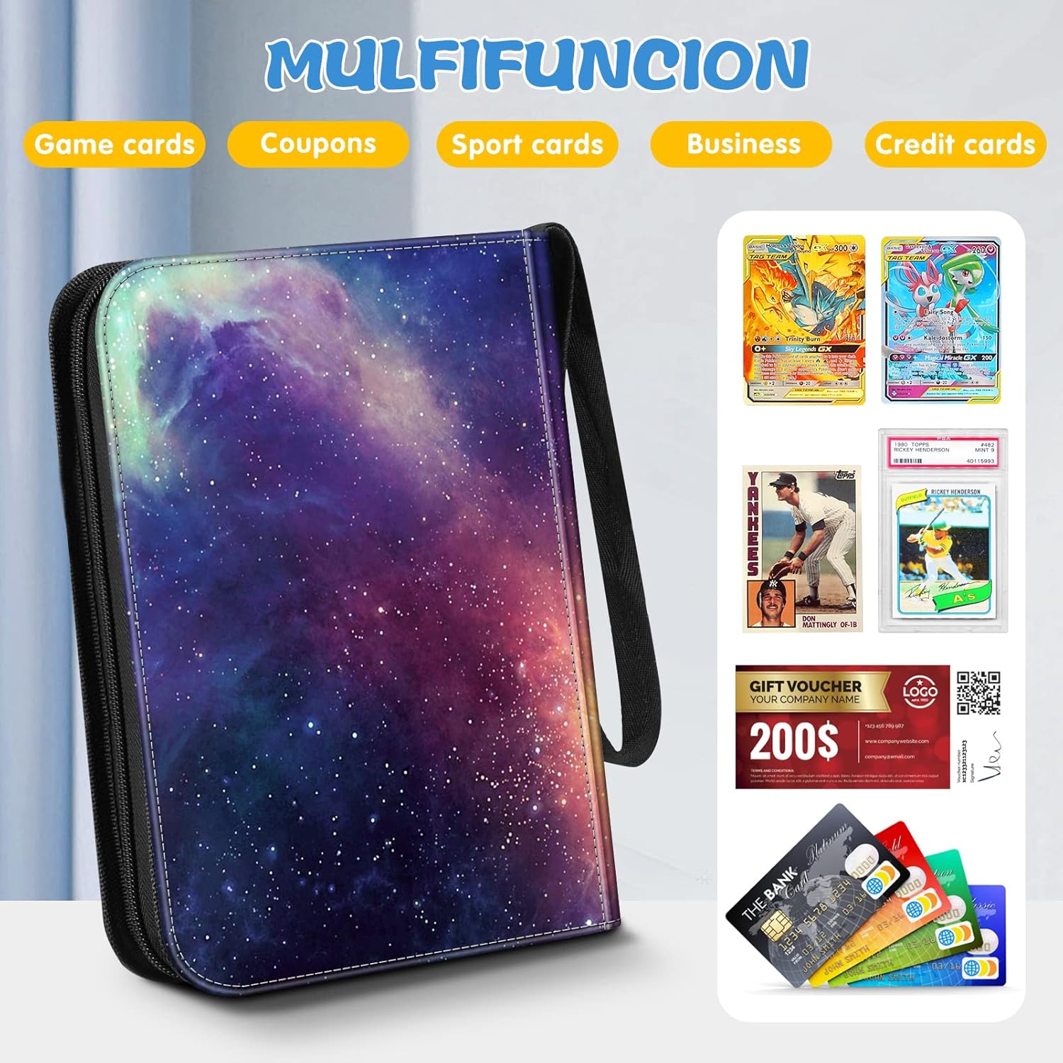 【Ampia compatibilità】 Compatibile con tutti i principali giochi di carte collezionabili come: carte TCG, gioco d'azzardo Joke, gioco di carte Monopoly, gioco di carte Phase 10, Magic the Gathering, Yugioh! Carte contro l'umanità, figurine di baseball, figurine di basket e molto altro. Grande capacità: 4 tasche per pagina, le carte possono essere riposte su entrambi i lati, incluse 52 buste rimovibili di alta qualità, possono contenere fino a 208 carte collezionabili. Materiale eccellente: l'album delle carte collezionabili è realizzato in poliuretano resistente. Le custodie per carte sono realizzate in materiale privo di acidi e non PVC. Design sicuro: l'elastico di alta qualità mantiene chiusa la cartella delle carte. Robusti anelli in metallo inossidabile mai eccessivamente estesi, chiusi molto bene, soddisfano le vostre esigenze di raccolta delle carte. Regalo perfetto: le nostre pagine di album di carte sono eleganti, è un regalo perfetto per collezionisti di carte, amici o bambini per il compleanno, la festa dei bambini, il Ringraziamento, il Natale e molte altre occasioni speciali.