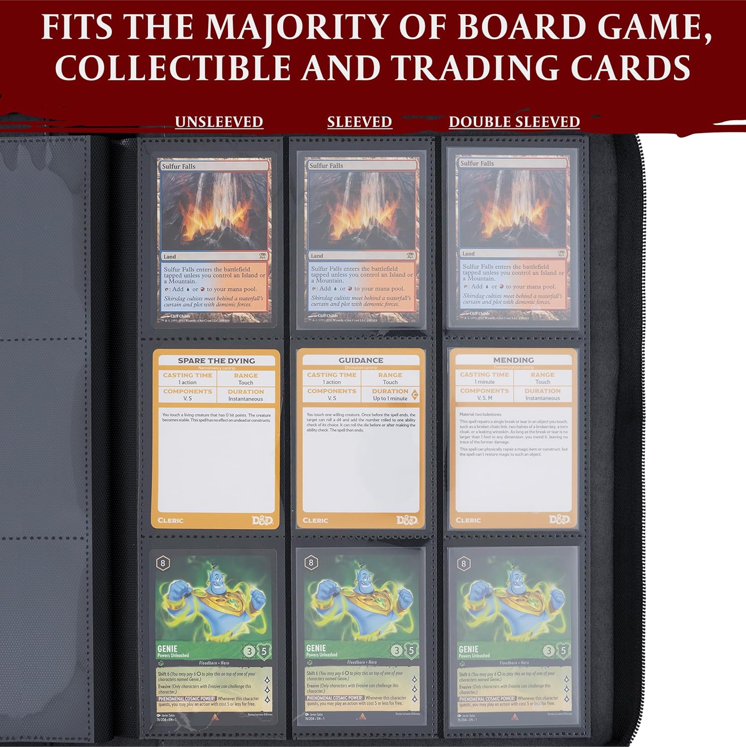 UNICO DAVANTI E RETRO IN ECOPELLE 3D: design antico libro magico dipinto a mano. Perfetto per Lorcana, MTG, Il Signore degli Anelli e molti altri tipi di carte collezionabili. COPERTURA E RETRO RINFORZATI: mantieni le tue carte al sicuro con una rilegatura rinforzata con cuciture e cerniera di eccellente qualità, che le rendono robuste, rassicuranti e impediscono che le tue carte si girino. BUSTE CON CARICAMENTO LATERALE A 360°: L'interno morbido protegge le tue carte dai graffi e il caricamento laterale ti consente di maneggiare facilmente le tue carte senza danneggiarle o comprometterne l'organizzazione. Funziona con carte senza maniche, con maniche e con doppia manica. DIMENSIONI TASCHE E LALBUM: Tasca porta carte: 6,8 cm x 9,7 cm - Formato cartella: 4,3 cm x 25,9 cm x 35,56 cm.