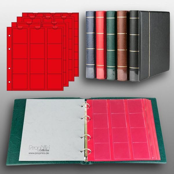 Rilegatura imbottita in pelle sintetica di alta qualità, decorazione in rilievo dorato con 4 fogli per diverse valute (12 scomparti fino a 44 mm, 20 scomparti fino a 34 mm, 30 scomparti fino a 26 mm, 48 scomparti fino a 17 mm) + 4 divisori rossi con finestra per etichettatura laterale, dimensioni esterne (chiuso): 220 x 230 x 40 mm (L x A x P) incl. 2 fogli protettivi Meccanismo ad anelli standard (45-65-45 mm)