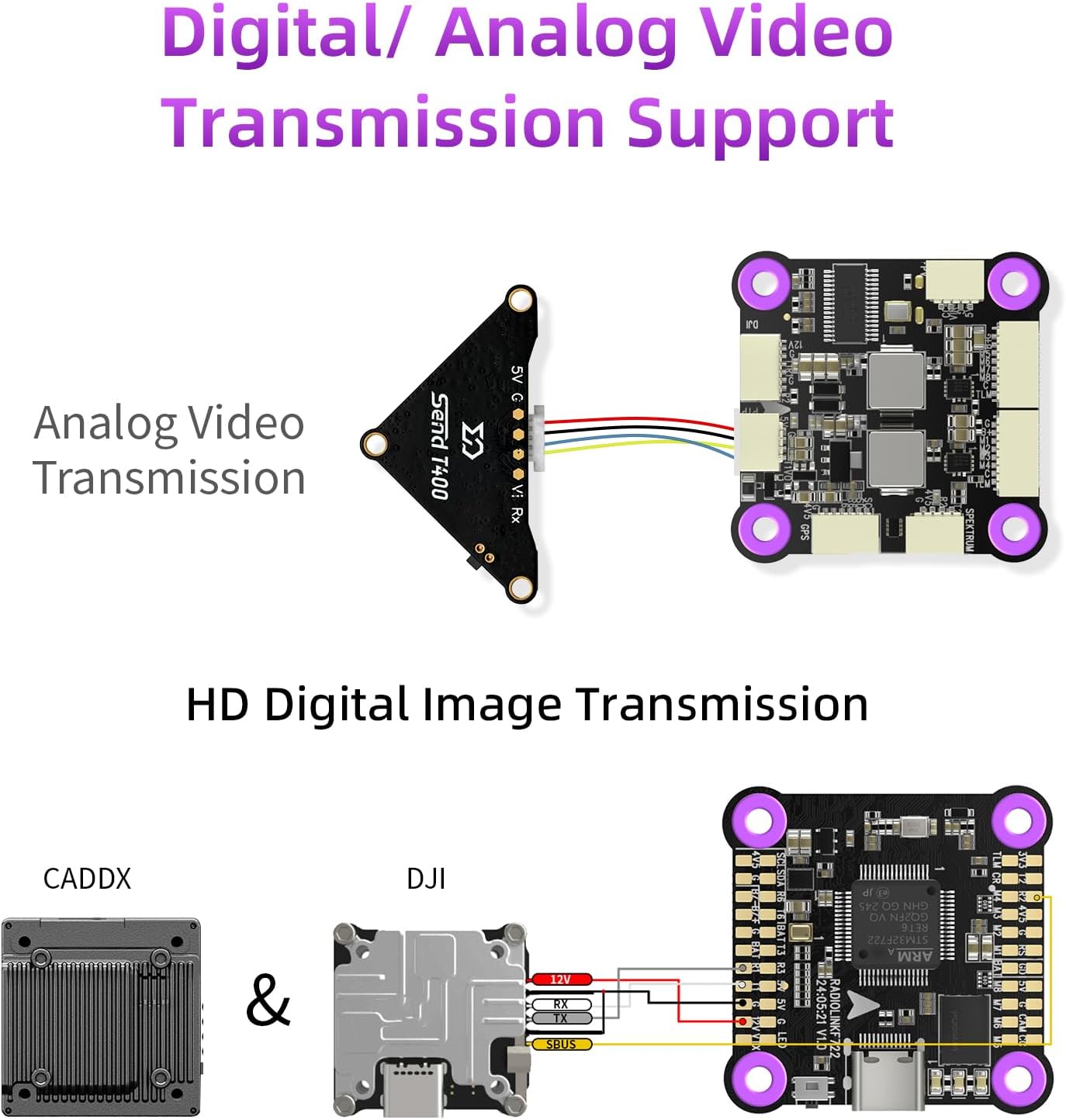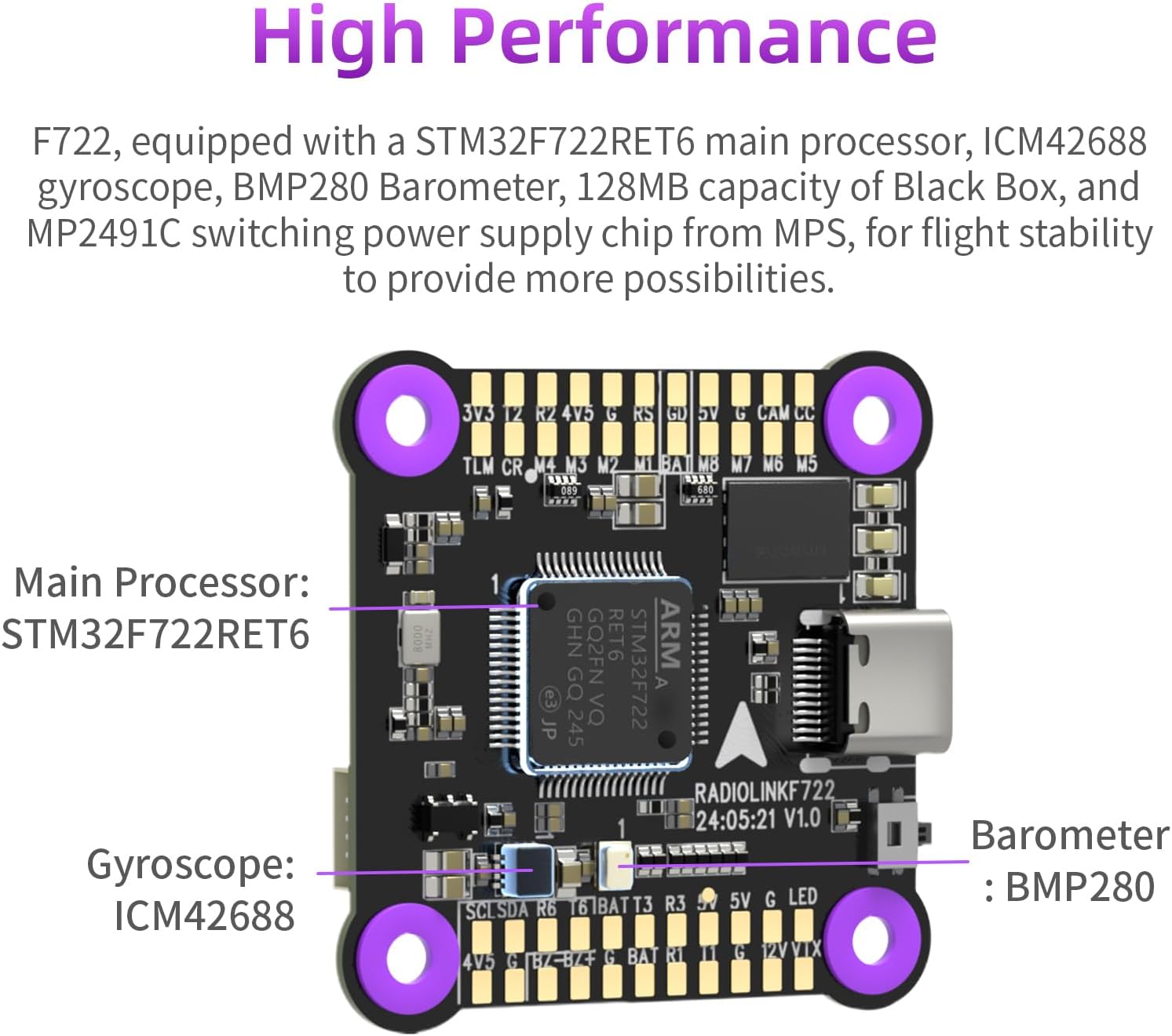 Alta configurazione: F722, dotato di un processore principale STM32F722RET6, giroscopio ICM42688, BMP280/DPS310, capacità di 128 MB della scatola nera e chip di alimentazione MP2491C di MPS. DJI/CADDX HD Digital Video Transmission Plug and Play: supporta DJI e CADDX ad alta risoluzione trasmissione digitale delle immagini Plug and Play. Multi-BEC integrato da 3,3 V/4,5 V/5 V/12 V. Un interruttore può essere impostato come interruttore BEC da 12 V, che viene utilizzato per accendere o spegnere l'alimentazione per la trasmissione delle immagini, in modo che i parametri del controller di volo come la potenza e la frequenza di trasmissione delle immagini possano essere regolati direttamente dal trasmettitore. 【Multiple Interfaces】Supporta fino a 8 canali di uscita ed è adattabile a un multirotore a 2-8 assi compresi i modelli X8. Una combinazione di interfaccia jack e pad di saldatura rende più conveniente collegare dispositivi esterni. Supporta l'elemetria delle informazioni ESC: supporta segnali DShot a due vie, OneShot e PWM. Modulo OSD integrato: F722 può visualizzare graficamente informazioni OSD come la direzione del volo e la posizione dell'aeromobile in tempo reale, senza la necessità di un modulo OSD esterno. Il pilota può registrare in modo intuitivo lo stato e le coordinate* dell'aeromobile in qualsiasi momento durante il volo di prima vista (FPV). Ottieni un'esperienza di volo più confortevole.