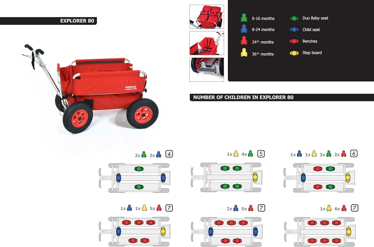 ALTA QUALITÀ E DUREVOLE: Costruito con materiali di prima qualità, il Rambler Explorer 80 Wagon garantisce prestazioni robuste e durature, assicurando che resista a varie condizioni esterne e alle esigenze quotidiane di trasporto dell'infanzia, trasportando in sicurezza fino a 6 bambini attraverso tutte le avventure. SICURO E ADATTO AI BAMBINI: garantendo un trasporto sicuro e accogliente, questo carro è dotato di comode panchine e un design adatto ai bambini, adatto a bambini da 1,5 anni in su. Sono disponibili accessori per il trasporto sicuro dei bambini da 0 a 2 anni. ACCESSIBILITÀ: l'ampio spazio e una piattaforma bassa facilitano l'entrata e l'uscita senza sforzo, consentendo ai bambini di salire e scendere in sicurezza in modo indipendente, mentre il design interno accurato garantisce comfort e facilità di movimento durante le corse. STOCCAGGIO E CONVENIENZA: quando è necessario più spazio per i bagagli, il Rambler Explorer 80 vanta un ampio spazio per giocattoli, snack ed elementi essenziali, che garantisce che sia i bambini che le loro necessità vengano trasportati con la massima comodità e salvaguardati durante il viaggio. UTILIZZO VERSATILE: Prevalentemente un trasporto per bambini, il carro funge anche da versatile trasportatore per l'attrezzatura essenziale durante le gite in spiaggia, il campeggio o gli eventi all'aperto, sposando praticità e stile in ogni avventura.