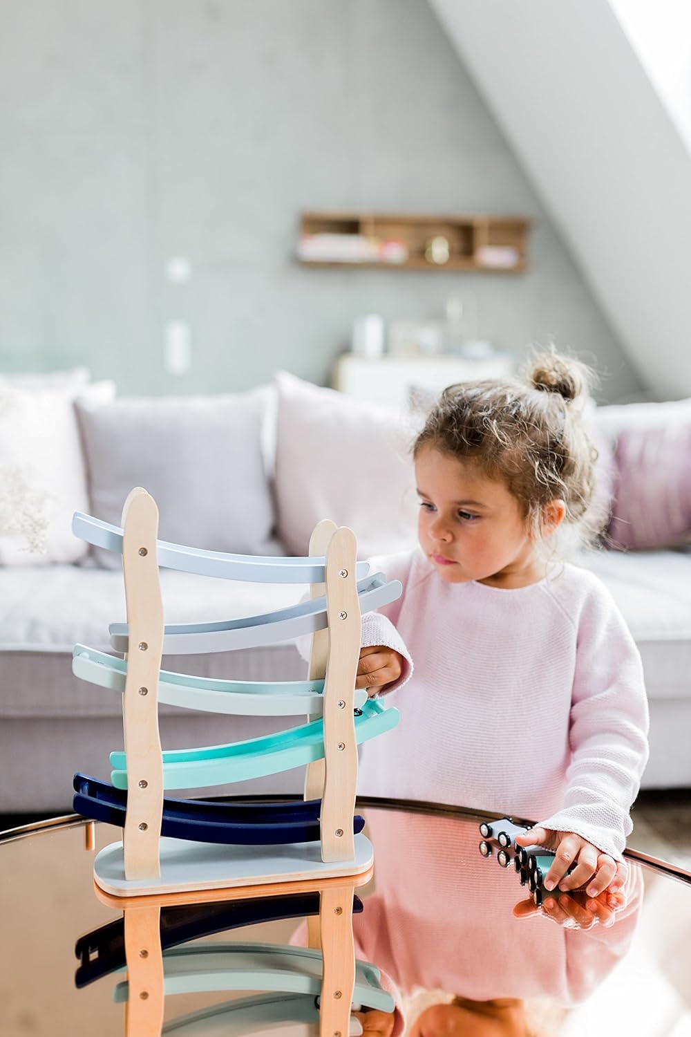 Pista da corsa in legno per sorprendere e divertire i tuoi bambini con 4 veicoli in miniatura da rotolare fino in fondo Gioco educativo in legno Materiali adatti all'uso quotidiano da parte di neonati e bambini piccoli Colori pastello e design misto. Adatto a ragazze e ragazzi. Dimensioni del circuito: 23 cm x 32 cm x 9 cm