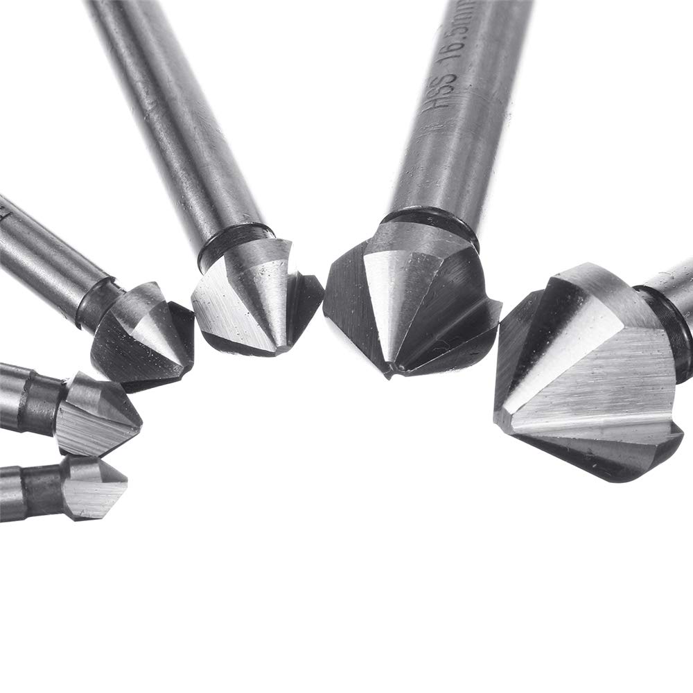 6 pezzi 90 ° 3 svasatore svasatore conico sbavatore punta conica HSS set di viti con scatola. Flauto: 3 Angolo: 90 ° Materiali: acciaio ad alta velocità 4241 È possibile eliminare più facilmente i detriti trattati durante il processo di smussatura senza ritardare l'efficienza del lavoro a causa dell'intasamento dell'utensile.