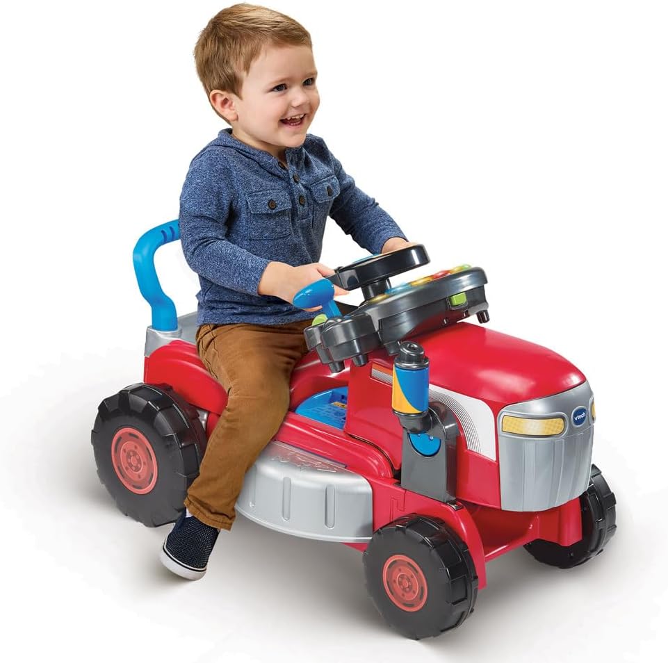 J'adore cette marque : VTech. Elle propose toujours des jouets au TOP à tous points de vue : conception, originalité, qualité, couleurs, robustesse, évolutif, éducatif... Et, toujours, à un prix correct, raisonnable et justifié. Là, nous avons "mon super tracteur Magi tondeuse". Il est de couleur majoritairement rouge et surtout, transformable : 3 en 1 => il peut d'abord etre "tracteur", puis "tondeuse" ou encore "volant interactif". Avec ce magnifique jouet, votre enfant ne saura plus où donner de la tête : 12 chansons, 36 mélodies, des phrases, des sons, des activités diverses, nombreuses et variées. Découvrir la météo, s'amuser autour du thème de la ferme, cris d'animaux, bruit de Klaxon, appel téléphonique, bruit de clignotant en tournant le volant, latéralité (gauche/droite), levier de vitesse, bruit de moteur, de tondeuse, de bip... CE QUE JE PEUX EN DIRE : * Ce jouet est en français. * Le son est bon, clair. * Le volume est réglable comme sur tous les jouets de la marque. * Bouton ON/OFF afin d'allumer ou éteindre le tracteur. * En plus des effets sonores, on a aussi de nombreux effets lumineux. * Le mode "tracteur" permet à l'enfant de s'asseoir dessus, façon porteur et lui permettre de se déplacer à l'aide de ses jambes. Grace à la version "tondeuse", il pourra se déplacer debout, accroché au guidon, et ainsi travailler son équilibre et sa motricité : 1ères étapes vers la marche autonome ! * Ce jouet fonctionne avec 2 piles LR6-AA incluses : merci VTech. ==> C'est du 5 étoiles pour moi sans aucune hésitation. ==> Je recommande vivement.