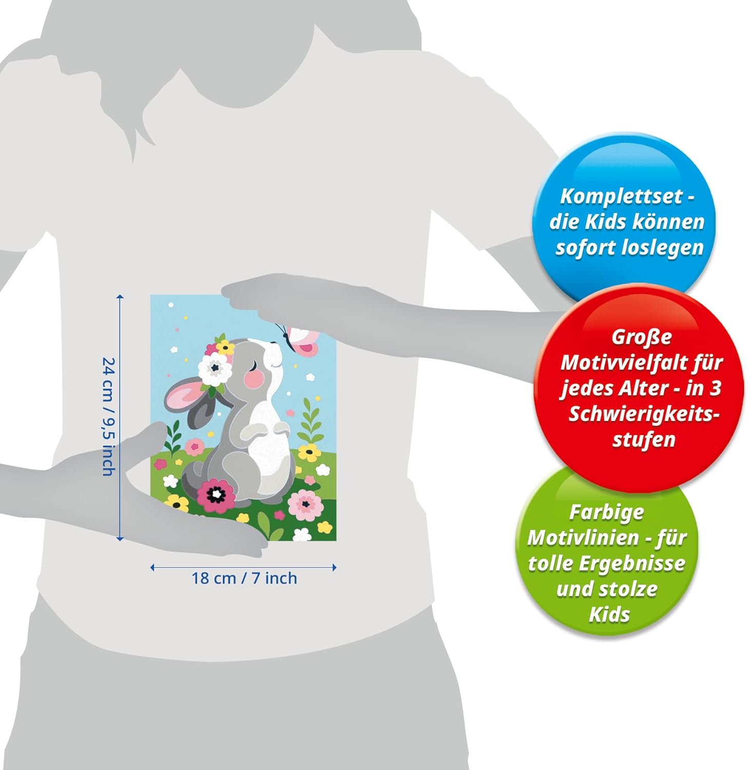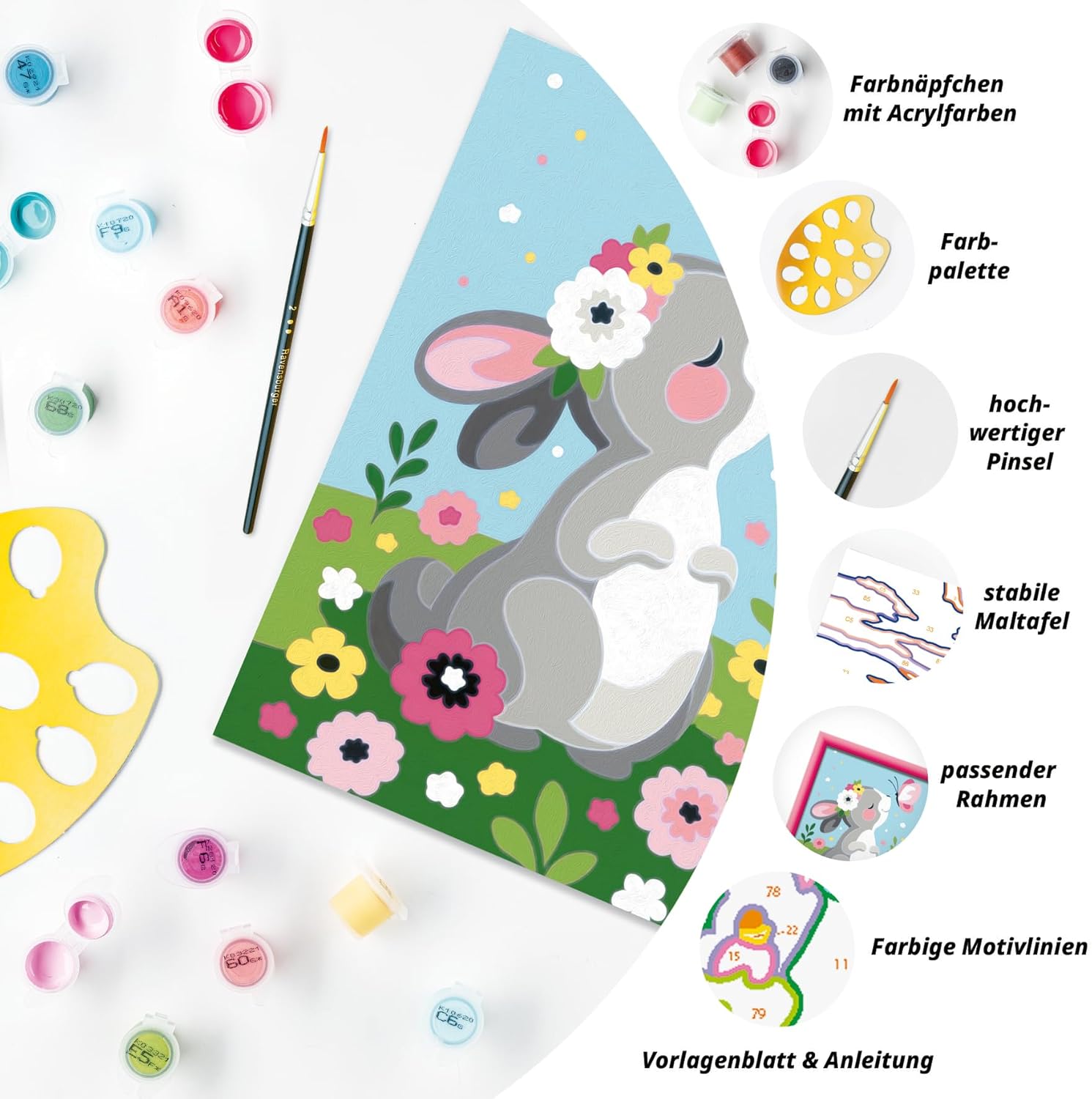 Set fai da te per bambini: con questo set di pittura creativa di Ravensburger Paint by Numbers dai 7 anni in su, i più piccoli possono iniziare a dipingere e creare vere e proprie opere d'arte appena fuori dalla scatola. Attività creativa per i bambini: le linee colorate del motivo rendono invisibili gli errori più piccoli, facilitano la colorazione e garantiscono così un risultato finale più bello. Idea regalo: il simpatico coniglietto fa illuminare gli occhi dei bambini ed è quindi un ottimo regalo per ragazze e ragazzi – sia come regalo di Natale, Pasqua o come regalo di compleanno. Decorazione per la cameretta dei bambini: grazie ai numeri in dotazione dipingere con i numeri è anche un modo meraviglioso per decorare la cameretta dei vostri bambini, in modo che il bambino possa essere fiero della propria opera d'arte per molto tempo a venire. Il set da pittura contiene 14 colori acrilici in vasetti richiudibili e numerati, un tavolo da pittura di 18x18 cm, una cornice e un pennello. Le vernici si asciugano rapidamente, sono a base d'acqua, inodore e non necessitano di detergente per pennelli