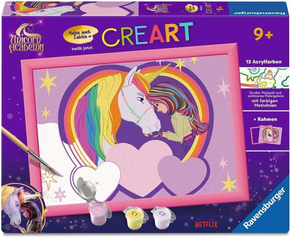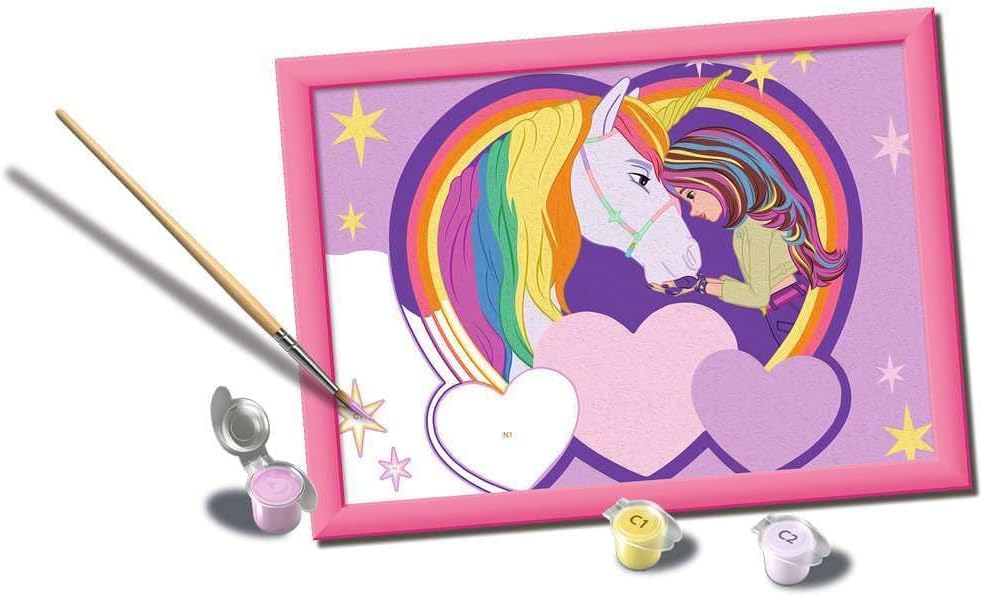 Disimballare e dipingere: il set da pittura è adatto per artisti a partire dai 9 anni in su Le linee colorate rendono invisibili piccoli errori, facilitano la colorazione e garantiscono così un risultato finale più bello Grande divertimento con i motivi preferiti dei bambini: il motivo Unicorn Academy con Sophia & Wildstar fa brillare gli occhi dei bambini ed è quindi il regalo ideale per piccoli e grandi artisti Grazie alla cornice in dotazione, la pittura con i numeri è perfetta anche come decorazione nella cameretta dei bambini Il set da pittura contiene 15 colori acrilici adatti ai bambini in ciotole richiudibili e numerate, una robusta lavagna da disegno in formato 18,00 cm x 24,00 cm, una cornice abbinata e un pennello. I colori acrilici di alta qualità si asciugano rapidamente, sono a base d'acqua, inodore e non richiedono un detergente per pennelli