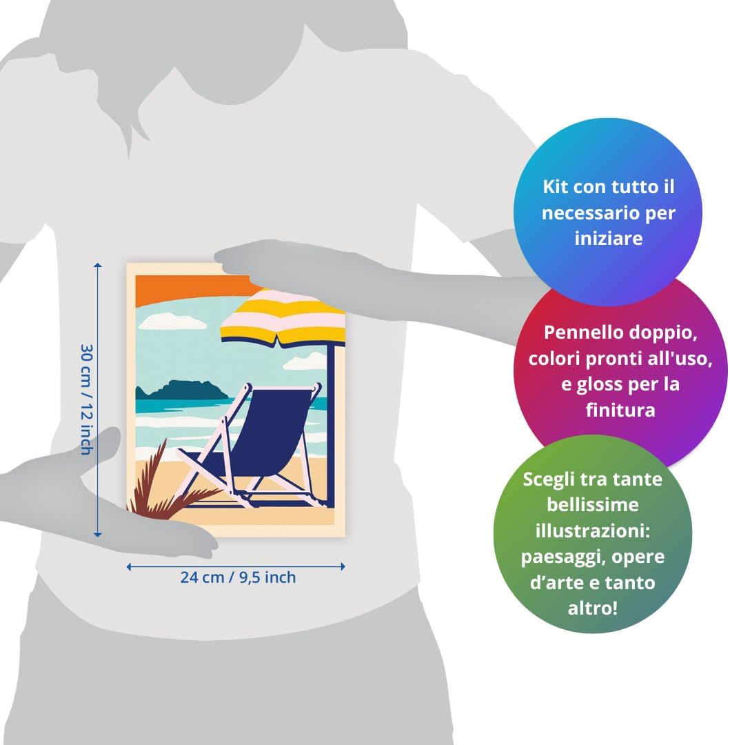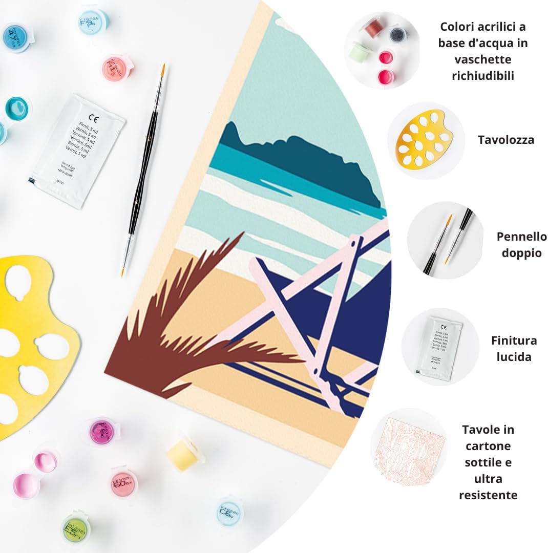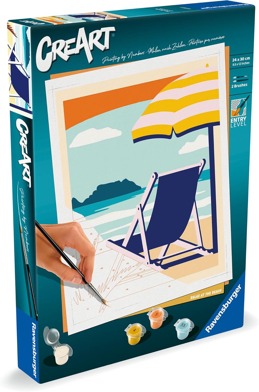 REGALI CREATIVI: il regalo ideale per chi ama dipingere e vuole creare dei piccoli capolavori su tela; basta rilassarsi, prendere in mano il pennello, aprire i barattoli con i colori già pronti all'uso ed iniziare a colorare KIT DI PITTURA A TEMA SPIAGGIA: il kit comprende la tavola prestampata, i colori acrilici a base d’acqua in vaschette richiudibili e un porta tempere; il pennello e un foglio di controllo con campi numerati sono inclusi LIBERA LA FANTASIA: CreArt è il kit di pittura educativo per gli artisti più piccoli e rilassante per i più grandi che aiuta a esercitare la manualità e la motricità, stimola la fantasia e migliora la concentrazione PICCOLI CAPOLAVORI DI QUALITÀ: il kit completo di pittura CreArt garantisce sicurezza e qualità, grazie a una tavola da dipingere resistente e a colori a base d'acqua facilmente lavabili, rendendo l'arte accessibile e divertente; dipingere con i numeri non è mai stato così semplice SCOPRI IL MONDO CREART: puoi scegliere tra tantissimi soggetti e diversi livelli di difficoltà a seconda dei gusti e dell’età; il gioco creativo che permette ai bambini di decorare le loro camerette e agli adulti di rilassarsi colorando