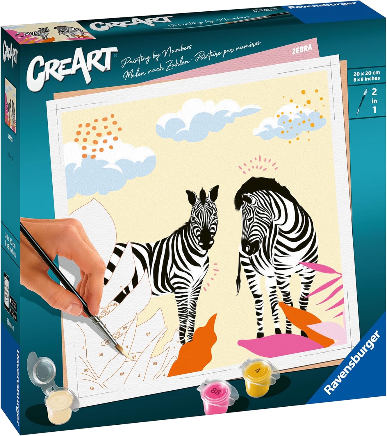 Sbizzarrisciti con CreArt! Un kit completo per dipingere una bellissima decorazione per casa tua semplicemente con l’aiuto di numeri e un pratico foglio di riferimento. Educativo per gli artisti più piccoli e rilassante per i più grandi, CreArt è lo svago perfetto Con CreArt puoi scegliere tra tantissimi soggetti e diversi livelli di difficoltà a seconda dei gusti e dell’età, a partire dai 14 anni I numeri ti guideranno all’utilizzo dei colori da usare per dipingere ogni spazio. Basta rilassarsi, prendere in mano il pennello, aprire i barattoli con i colori già pronti all'uso ed inizare a colorare Dipingere con i numeri non è mai stato così semplice: nella confezione trovi la tavola prestampata, i colori acrilici a base d’acqua in vaschette richiudibili e un porta tempere. Il pennello e un foglio di controllo con campi numerati sono inclusi! Rilassati esercitando la manualità fine e le tue abilità di concentrazione: il risultato ti sorprenderà!