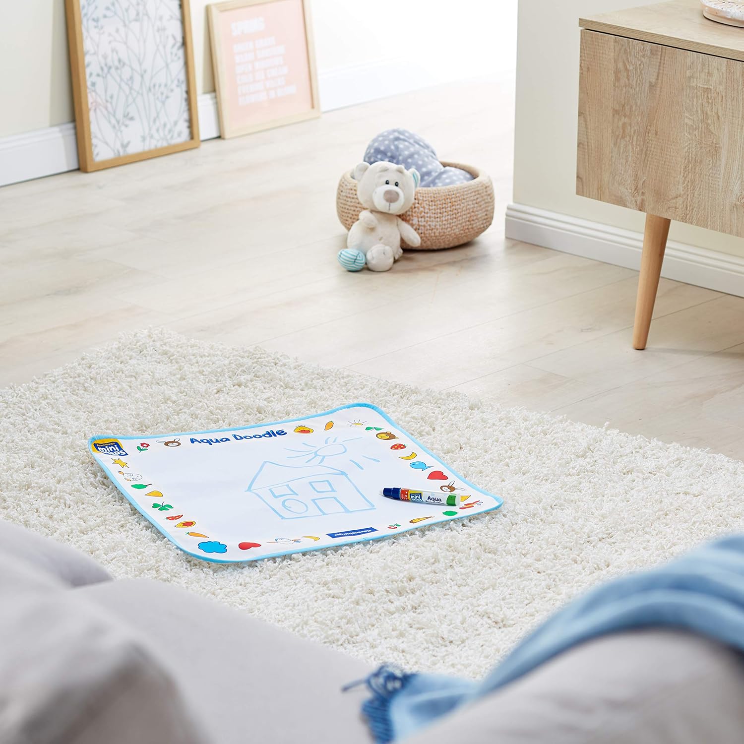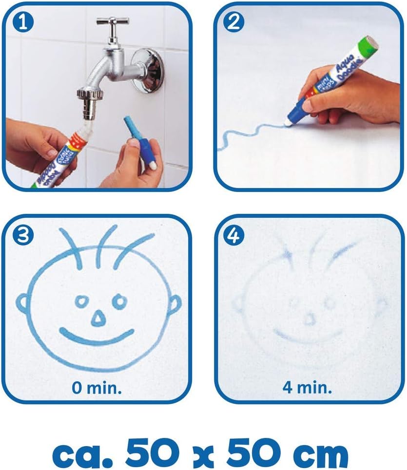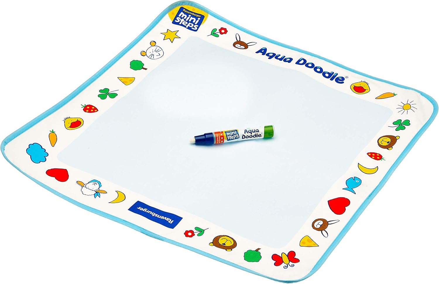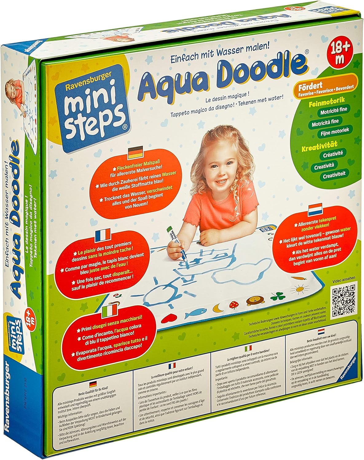 Con Aqua Doodle i bambini dipingono con acqua: basta riempire la penna con acqua del rubinetto e dipingere a piacere – Vantaggio per i genitori: dita, pareti e pavimenti rimangono puliti e senza macchie, perché i bambini dipingono esclusivamente con acqua. Una volta che l'acqua si asciuga, tutti i tratti scompaiono completamente, così il tappetino da pittura sembra nuovo anche dopo un uso prolungato e i piccoli artisti possono creare sempre nuove opere d'arte. Quanto più spesso i bambini piccoli dipingono, tanto più allenano le loro capacità motorie. L'Aqua Doodle Pen li aiuta ad afferrarlo, poiché è facile da impugnare anche per le piccole mani dei bambini. Ciò rende questo kit di pittura il regalo ideale per i bambini per ogni occasione. Con Aqua Doodle i bambini dai 18 mesi in su creano le loro prime opere d'arte. Ciò promuove la creatività dei piccoli artisti e consente un ingresso giocoso nel mondo della pittura e del disegno. Questo set da colorare per neonati e bambini piccoli contiene un tappetino da pittura nel formato ca. 50 x 50 cm e una penna Aqua Doodle - La penna ovviamente funziona anche con tutti gli altri prodotti della gamma Aqua Doodle di Ravensburger