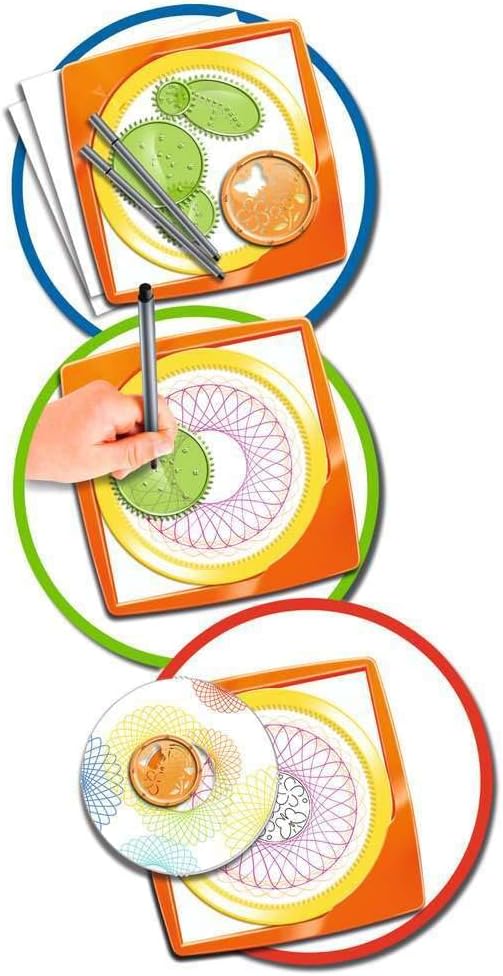 Confezione in formato midi per disegnare le belle spirali, elissi e altri disegni geometrici Desideri realizzare immagini a spirai monocromatiche oppure abbinare diverse fantasie e modelli, niente di facile; spiral designer to offre possibilità Si possono scegliere fra 4 ruote dentellate diverse; in regalo anche una sagoma Mandala per abbellire ulteriormente le proprie spirali Scegli la tua fantasia preferita tra i diversi dischetti dentati e procedi con movimenti circolari lungo il bordo Adatto a tutti i piccoli artisti a partire dai 6 anni