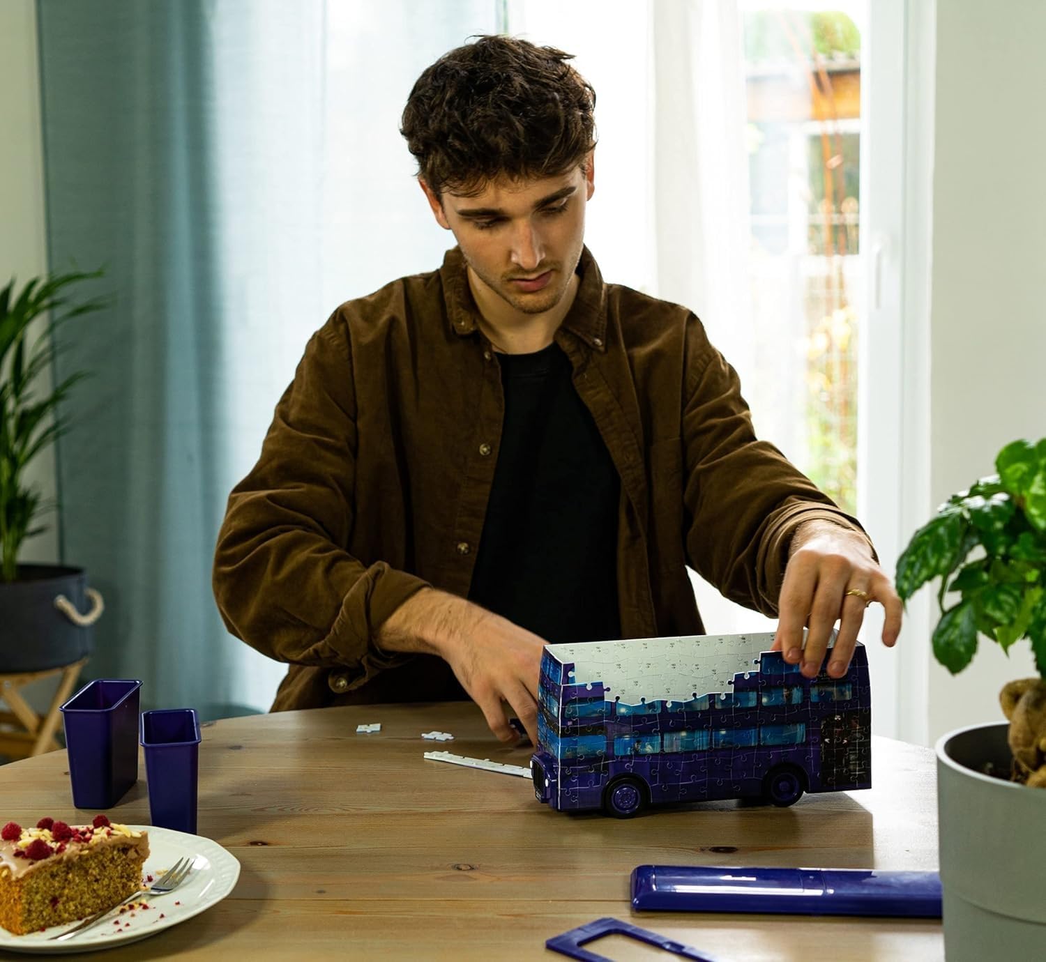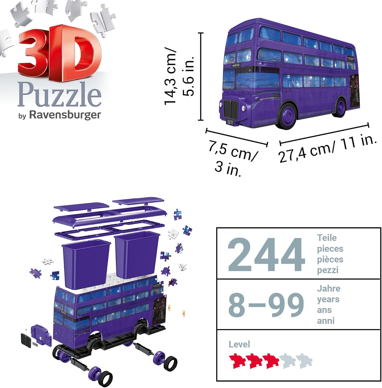 Puzzle nella terza dimensione! L'idea regalo perfetta per tutti i fan di Harry Potter dagli 8 anni in su. Con i puzzle 3D di Ravensburger bambini e adulti possono vivere una magica esperienza di puzzle tridimensionale. Il famoso "cavaliere errante" dei film di Harry Potter è stato creato pezzo per pezzo con 216 pezzi di puzzle in plastica di alta qualità e 28 accessori. Parti in plastica di alta qualità con tecnologia Easyclick per un adattamento preciso - stabile, senza colla. L'attività ideale dal successo garantito, grazie alle istruzioni illustrate e colorate, ai pezzi del puzzle numerati e alle ruote mobili. Promuove il pensiero spaziale e le capacità motorie. Una vera attrazione e la decorazione perfetta, sia sulla scrivania, sul comodino o sullo scaffale. Dopo il montaggio, l'autobus funge anche da pratico ripostiglio per penne o altri utensili. Livello di difficoltà 3/5, dimensioni del veicolo assemblato ca. 27,4x7,5x14,3 cm. L'imballaggio può variare
