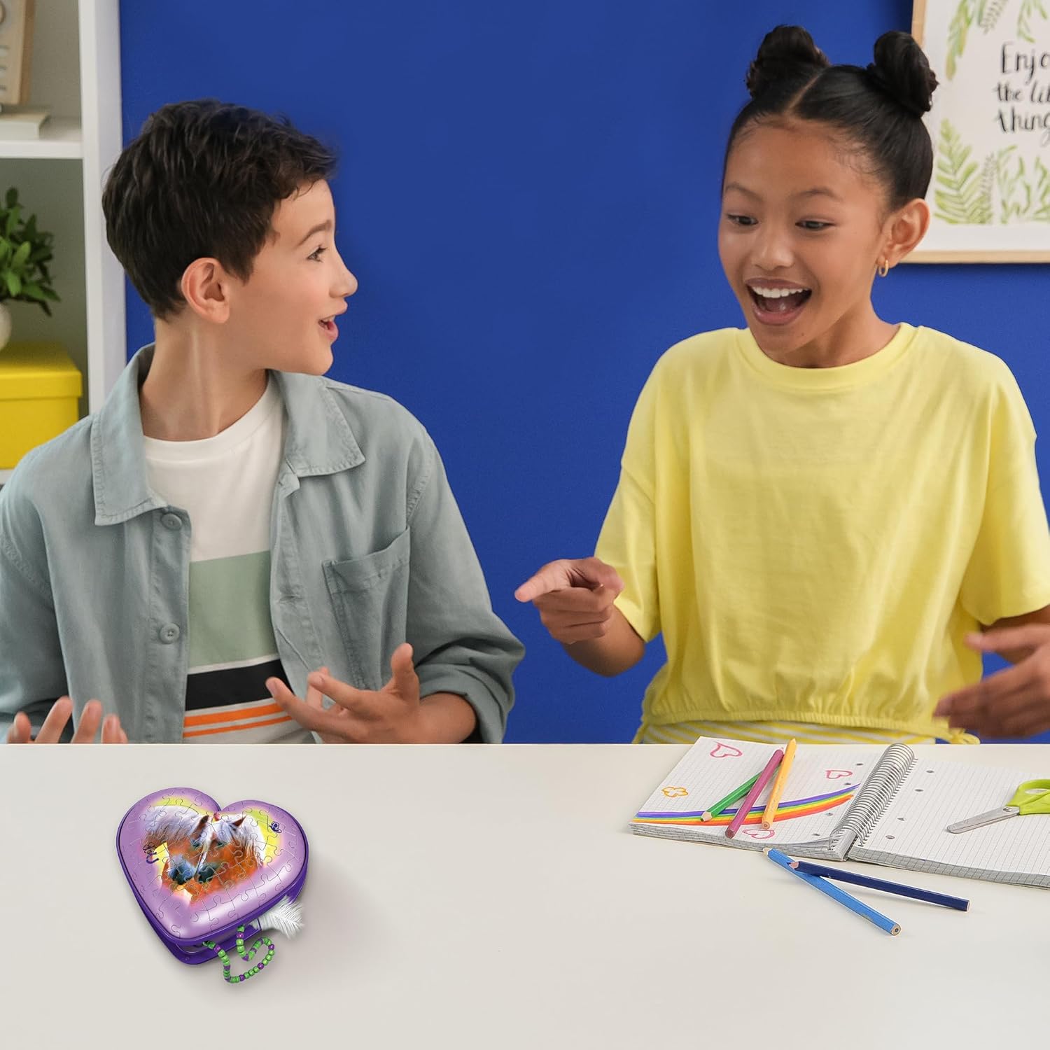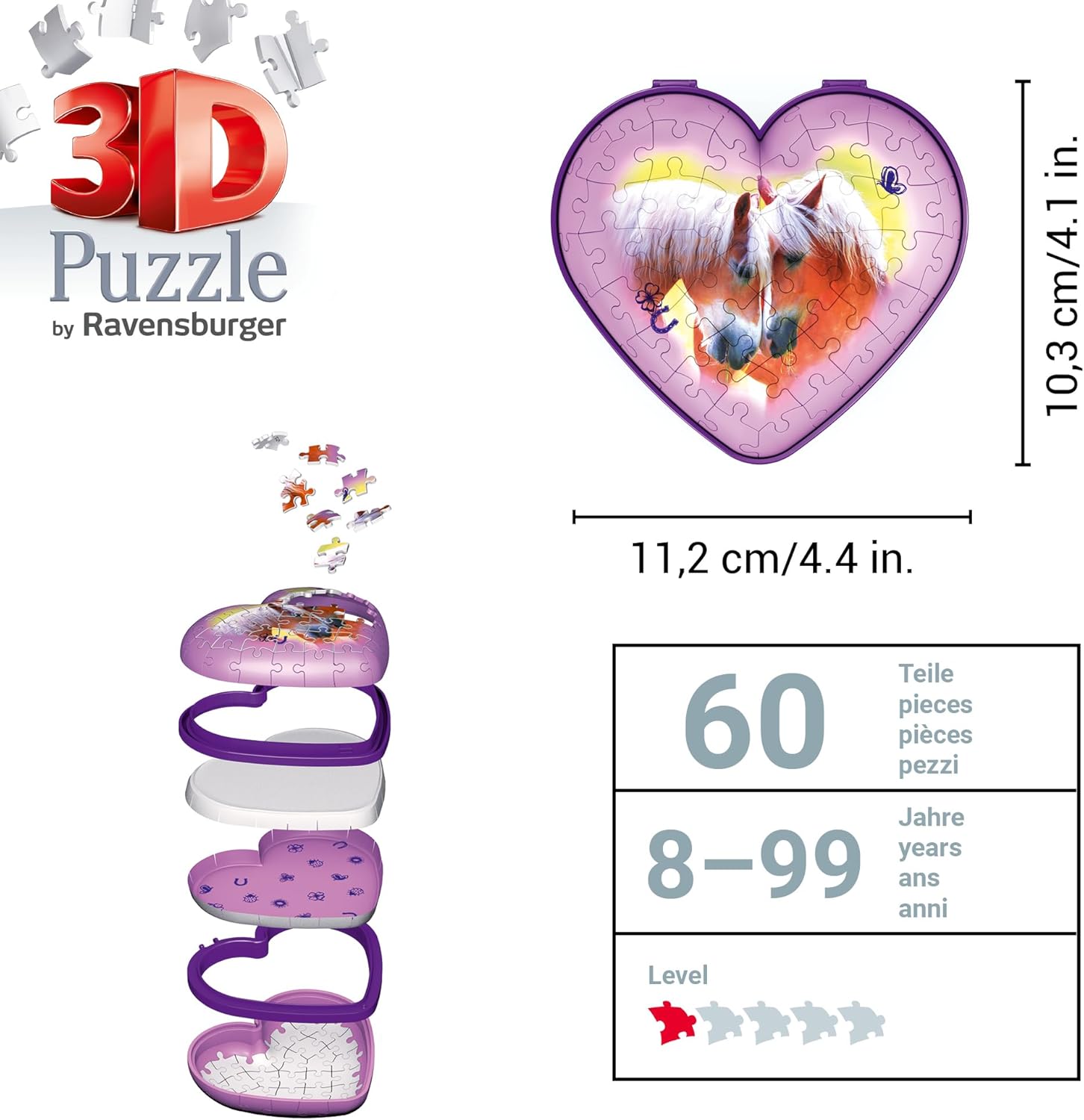Puzzle nella terza dimensione. L'idea regalo perfetta per tutti gli amanti dei cavalli dagli 8 anni in su. Parti in plastica di alta qualità con tecnologia Easyclick per un adattamento preciso - stabile, senza colla. Da 54 pezzi di puzzle in plastica di alta qualità e 6 accessori viene creata pezzo per pezzo una pratica scatola a forma di cuore: una vera attrazione e l'oggetto decorativo perfetto nella cameretta dei bambini di tutti gli appassionati di cavalli. L'attività ideale con garanzia di successo - grazie alle istruzioni illustrate, colorate e ai pezzi del puzzle numerati. Dopo il montaggio la scatola serve per riporre in modo pratico tutti i tipi di piccoli e grandi tesori. Non importa se per ragazzi o ragazze, bambini o adulti: puzzle 3D divertente e pratico aiuto per riporre tutti gli appassionati di cavalli dagli 8 anni in su. Livello di difficoltà 1/5, dimensioni ca. 10,3x11,2 cm. L'imballaggio può variare