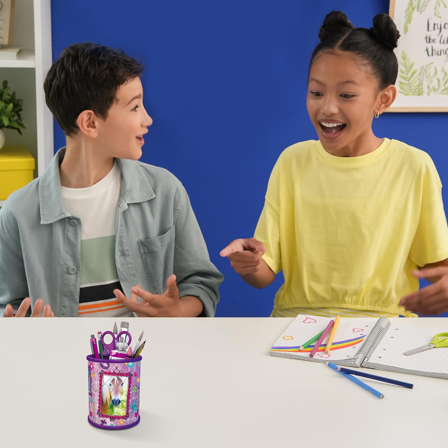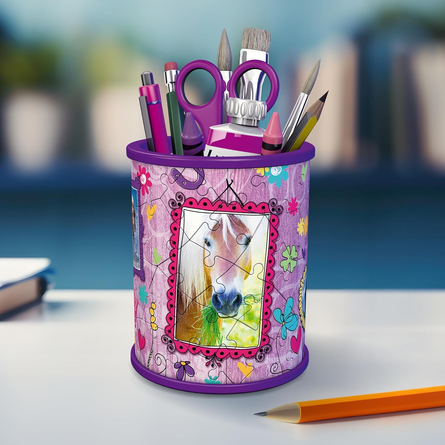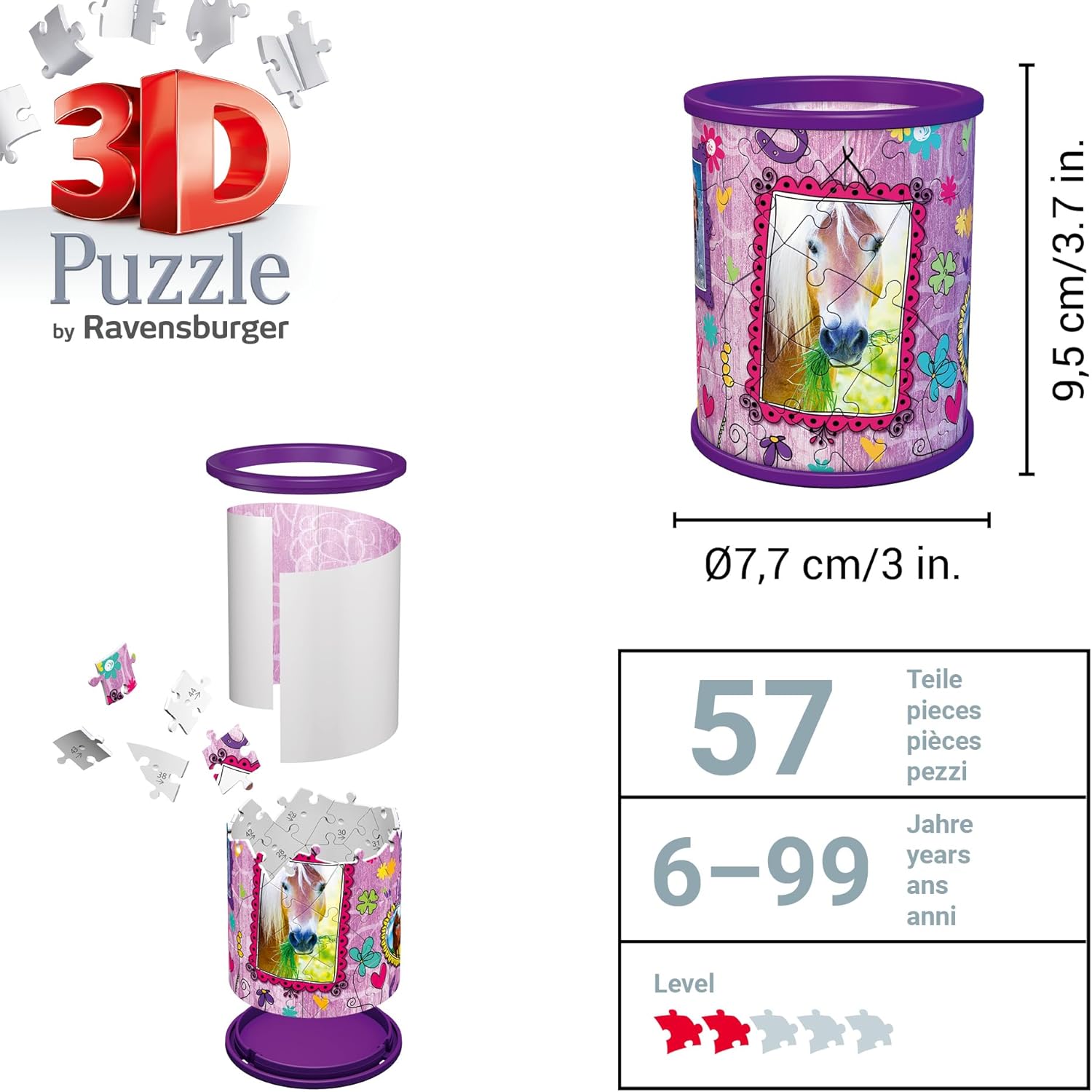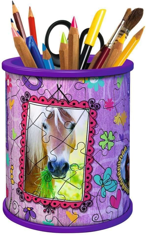 Puzzle nella terza dimensione! L'idea regalo perfetta per tutti gli amanti dei cavalli dai 6 anni in su. Parti in plastica di alta qualità con tecnologia Easyclick per un adattamento preciso - stabile, senza colla. 54 pezzi di puzzle in plastica di alta qualità e 3 accessori creano pezzo per pezzo un pratico portapenne: una vera attrazione e la decorazione perfetta su ogni scrivania. Attività ideale dal successo garantito, grazie alle istruzioni illustrate e colorate e ai pezzi del puzzle numerati. Promuove il pensiero spaziale e le capacità motorie fini Sia per ragazzi o ragazze, bambini o adulti - Puzzle 3D divertente e pratico aiuto per riporre tutti gli amanti dei cavalli dai 6 anni in su Livello di difficoltà 2/5; Altezza del portapenne assemblato ca. 9,5 cm; Diametro ca. 7,7 centimetri. L'imballaggio può variare