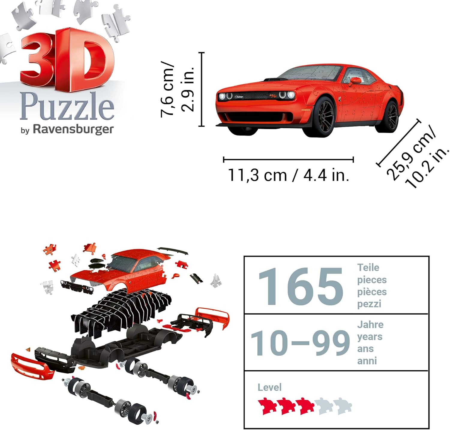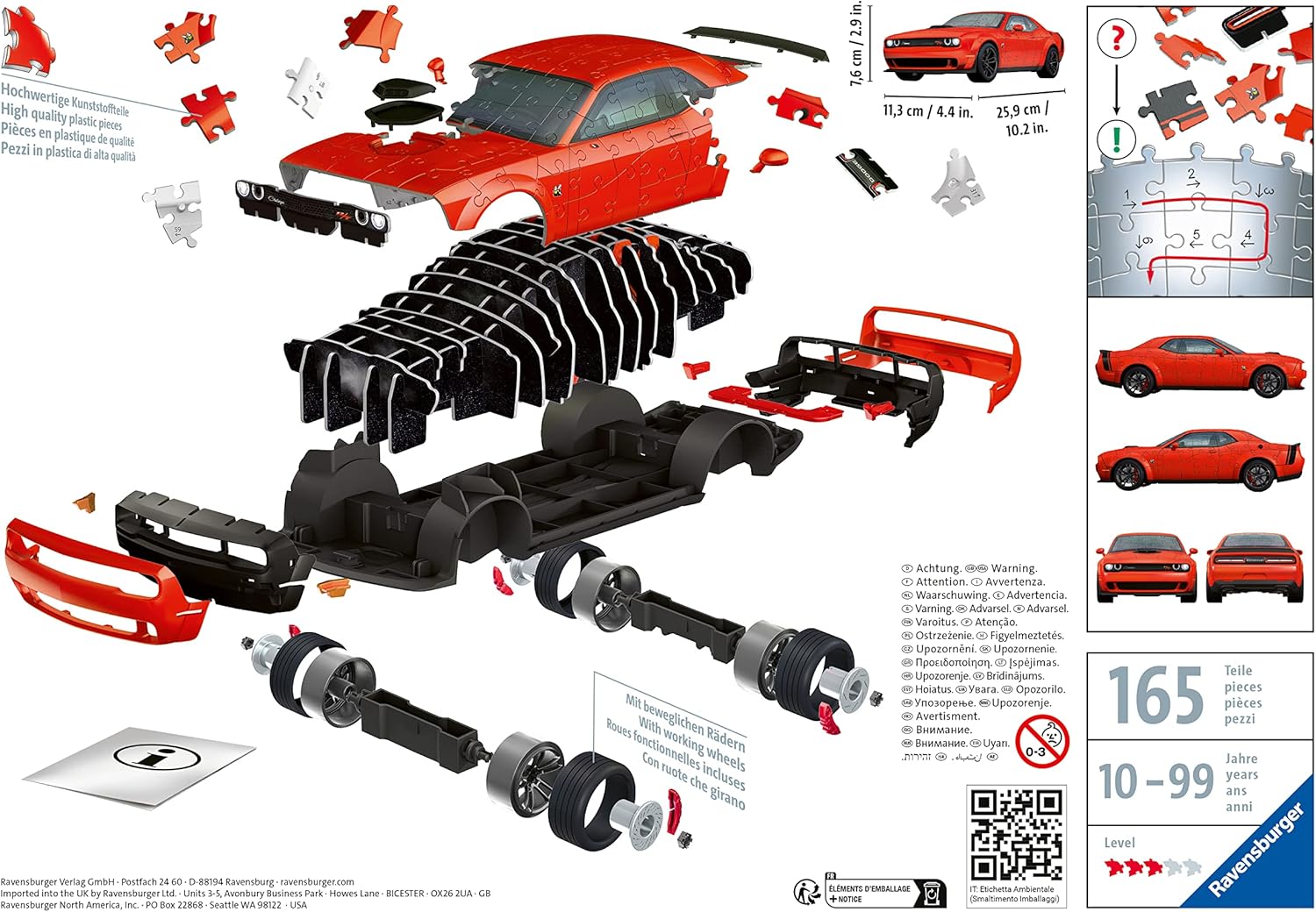 Un superlativo su ruote come puzzle 3D di Ravensburger – ideale per piccoli e grandi fan di PS dai 10 anni in su. La combinazione ideale di puzzle e modellismo I 108 pezzi del puzzle in plastica che si incastrano perfettamente e numerosi accessori possono essere facilmente assemblati insieme per formare un modello stabile grazie alla tecnologia Easyclick e alle istruzioni illustrate - senza colla. Regalo per gli amanti delle auto: con le sue ruote girevoli, il 3D Puzzle Challenger Scat Pack non solo convince gli adulti, ma è adatto anche come regalo per i bambini per il loro compleanno, come regalo di Natale o come regalo di Pasqua. Decorazione creativa per la cameretta dei bambini: il puzzle 3D Dodge Challenger R/T Scat Pack Widebody è più di un semplice giocattolo, perché il modello è ideale anche come decorazione nella cameretta dei ragazzi e delle ragazze. Attività per bambini e adulti: comporre un puzzle 3D di Ravensburger è il passatempo ideale per adulti e bambini dai 10 anni in su ed è quindi un ottimo consiglio per liberarsi dalla noia - livello di difficoltà 3/5