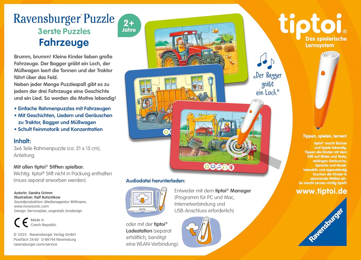 Divertimento rompicapo con i veicoli: il trattore attraversa il campo, l'escavatore scava una buca nel cantiere e il camion della spazzatura svuota i bidoni; Da sei pezzi del puzzle nasce uno dei tre motivi: l'attività ideale per i bambini. Dopo aver assemblato il puzzle, i veicoli prendono vita con la penna tiptoi. Con tanti suoni, storie e canzoni, il puzzle game interattivo offre un divertimento duraturo ai bambini; Promuove la motricità e la concentrazione e fornisce interessanti conoscenze sui veicoli; Con brevi testi con motivi adatti ai bambini, l'introduzione ideale tiptoi. Ottima idea regalo: "tiptoi 3 primi puzzle: veicoli" è un gioco educativo e puzzle in uno e quindi il regalo ideale per bambini dai 2 anni in su - sia per Natale, Pasqua o compleanno. I puzzle con cornice da 3x6 pezzi offrono tanti puzzle e divertimento didattico con tre motivi. penna tiptoi non inclusa; Deve essere acquistato separatamente