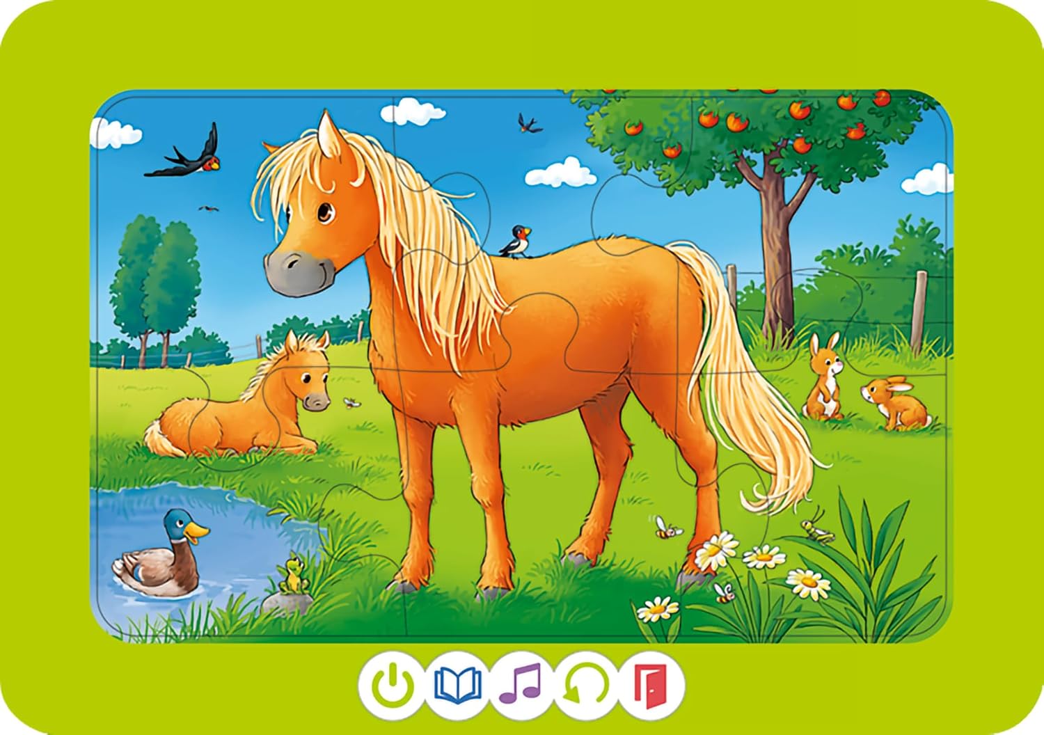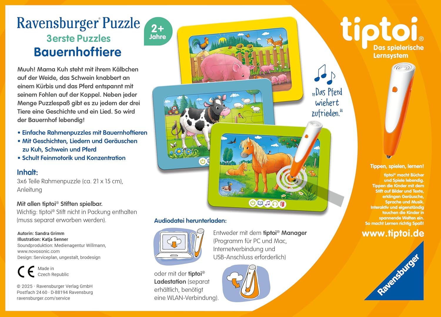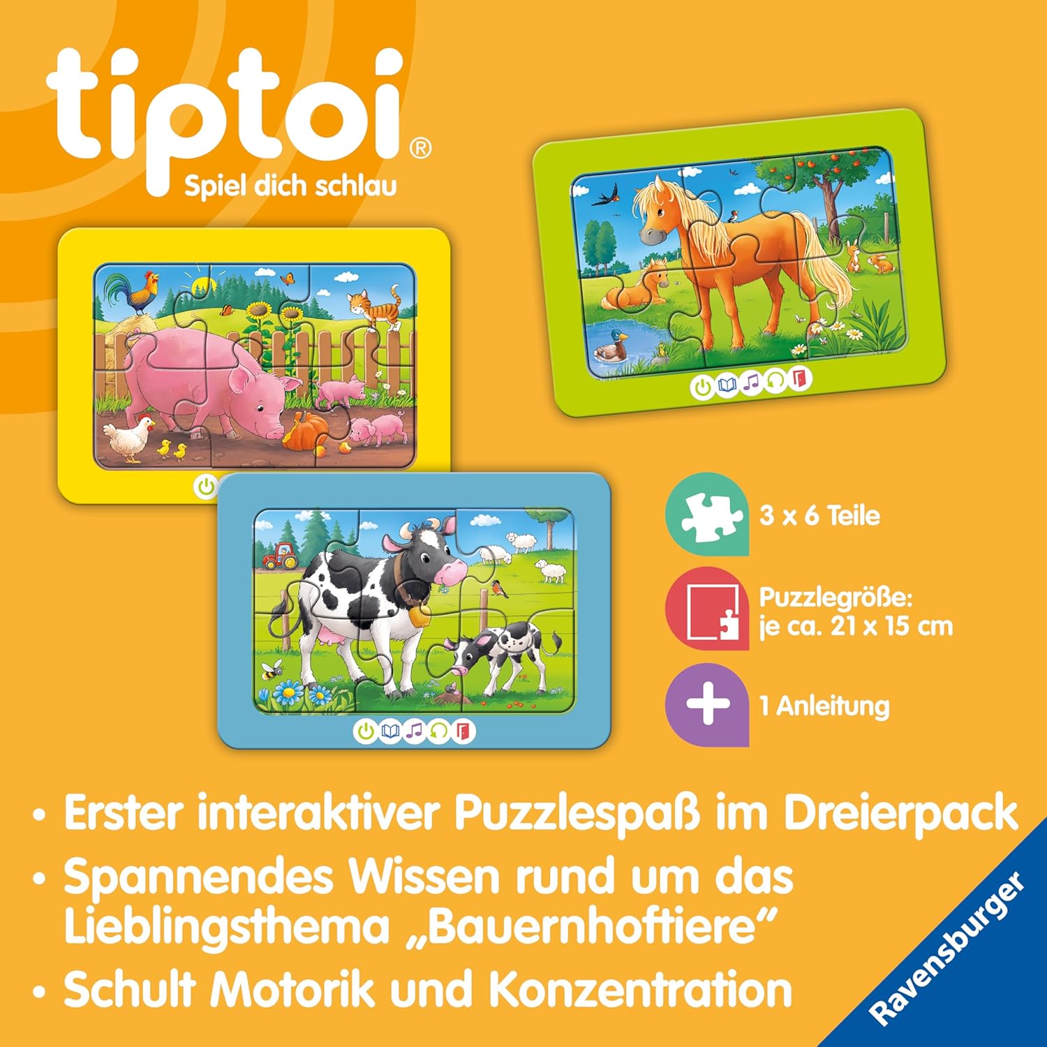 Una giornata alla fattoria: la mucca è al pascolo, il cavallo si rilassa nel paddock e il maiale sgranocchia una zucca. Da sei pezzi del puzzle nasce uno dei tre motivi: l'attività ideale per i bambini. Dopo aver assemblato il puzzle, gli animali della fattoria prendono vita con la penna tiptoi. Con tanti suoni, storie e canzoni, il puzzle game interattivo offre ai bambini un divertimento duraturo. Promuove la motricità e la concentrazione e fornisce interessanti conoscenze sugli animali della fattoria. Con brevi testi con motivi adatti ai bambini, l'introduzione ideale tiptoi Ottima idea regalo: "tiptoi 3 primi puzzle: Animali della fattoria" è un gioco educativo e puzzle in uno e quindi il regalo ideale per bambini dai 2 anni in su - sia per Natale, Pasqua o compleanno. I puzzle con cornice da 3x6 pezzi offrono tanti puzzle e divertimento didattico con tre motivi. penna tiptoi non inclusa. Deve essere acquistato separatamente