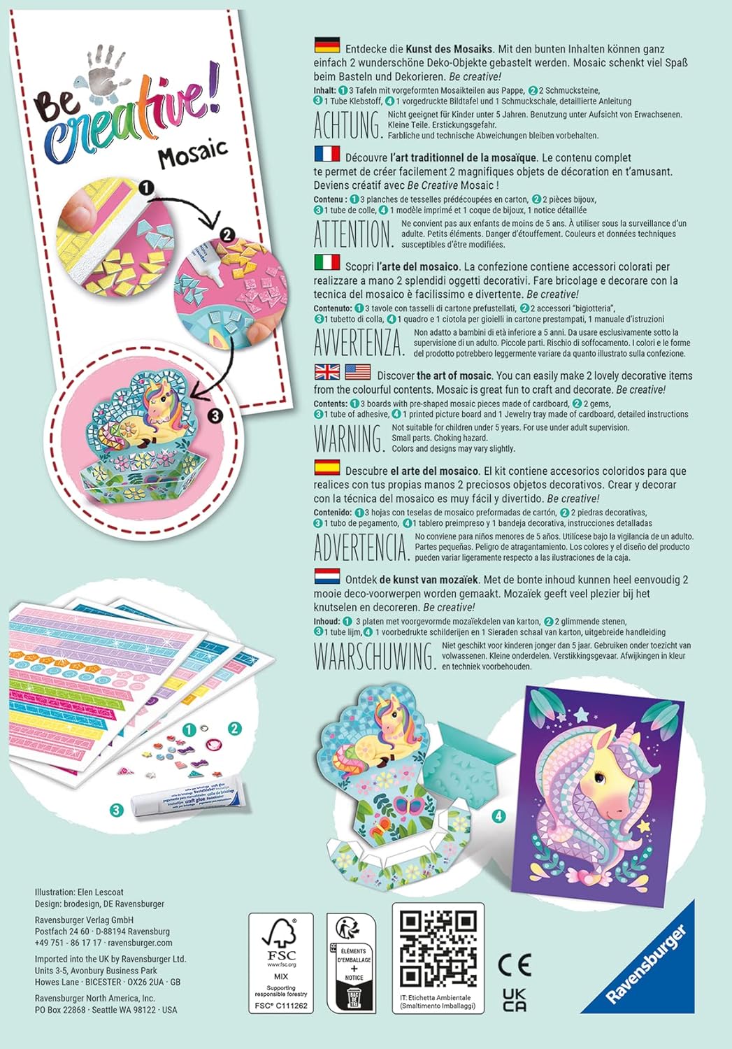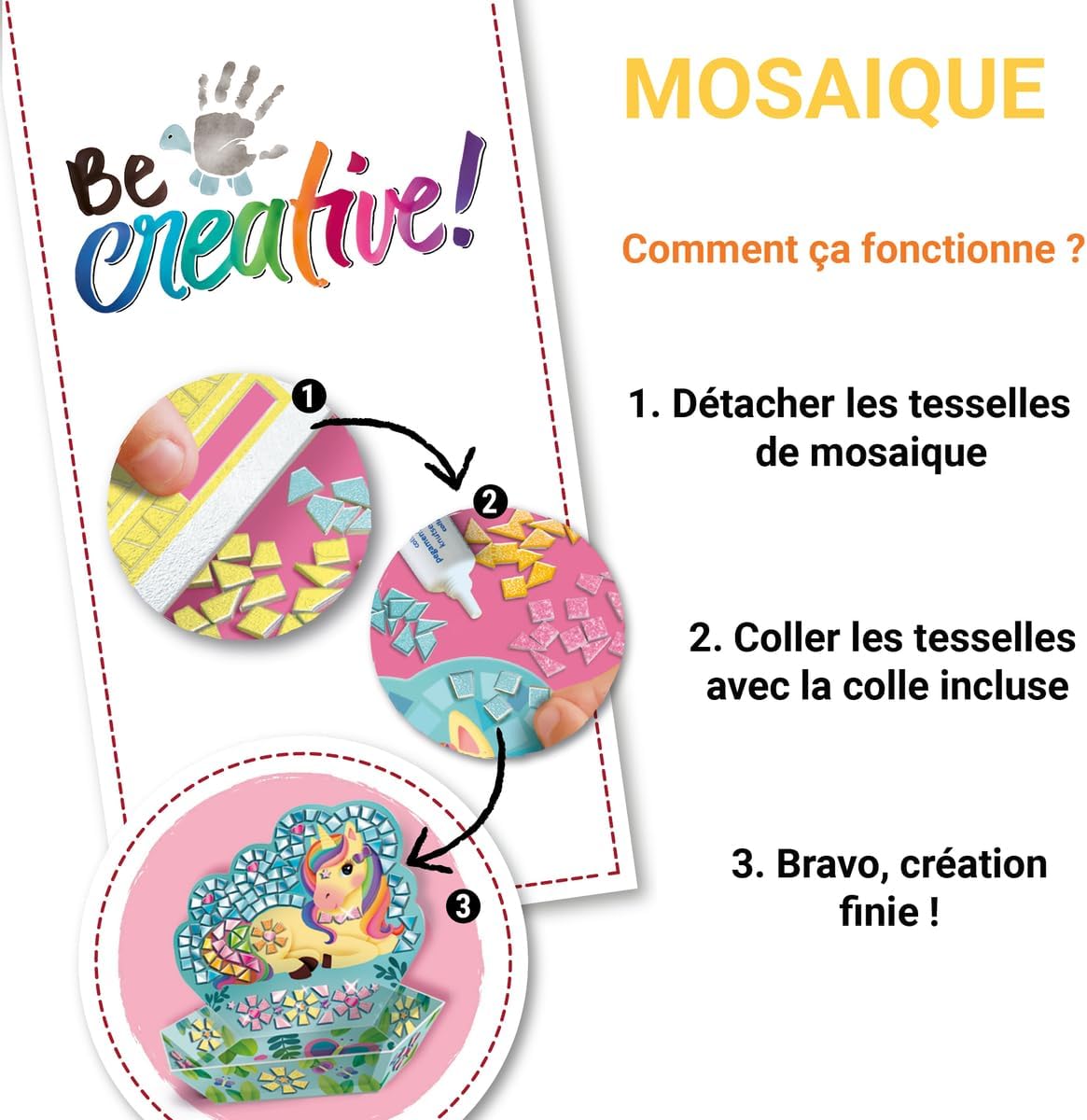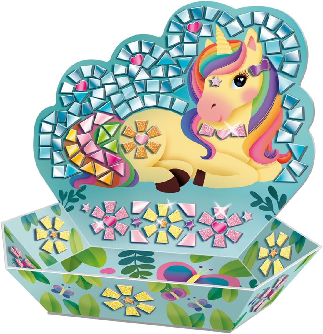 DUE OGGETTI IN MOSAICO Questa scatola completa permette di creare 2 bellissimi oggetti decorativi con 1 dipinto e 1 tasca vuota sul tema degli unicorni, perfetti per iniziare con i mosaici. RISULTATO GARANTITO È facile grazie alle tessere metallizzate e glitterate da incollare per donare un effetto sublime agli oggetti. Una volta finiti, diventano una bellissima decorazione o un regalo unico per i propri cari. FAVORISCE LA CONCENTRAZIONE E L'AUTONOMIA Lontano dagli schermi, questa divertente attività unisce destrezza e precisione per sviluppare la manualità e la concentrazione dei bambini. Ideale per il tempo in famiglia o in caso di pioggia. SCOPRI IL MOSAICO Oltre al tema Unicorno, ce ne sono anche altri da scoprire per ampliare la tua collezione di oggetti in mosaico: Sirena (18239) e Tropicale (18240). BOX COMPLETO: 2 oggetti (1 quadro prestampato di 18 x 26 cm + 1 tasca), tessere pretagliate in cartoncino metallizzato o glitterato, pezzi di gioielleria, 1 tubetto di colla e 1 manuale d'uso dettagliato.