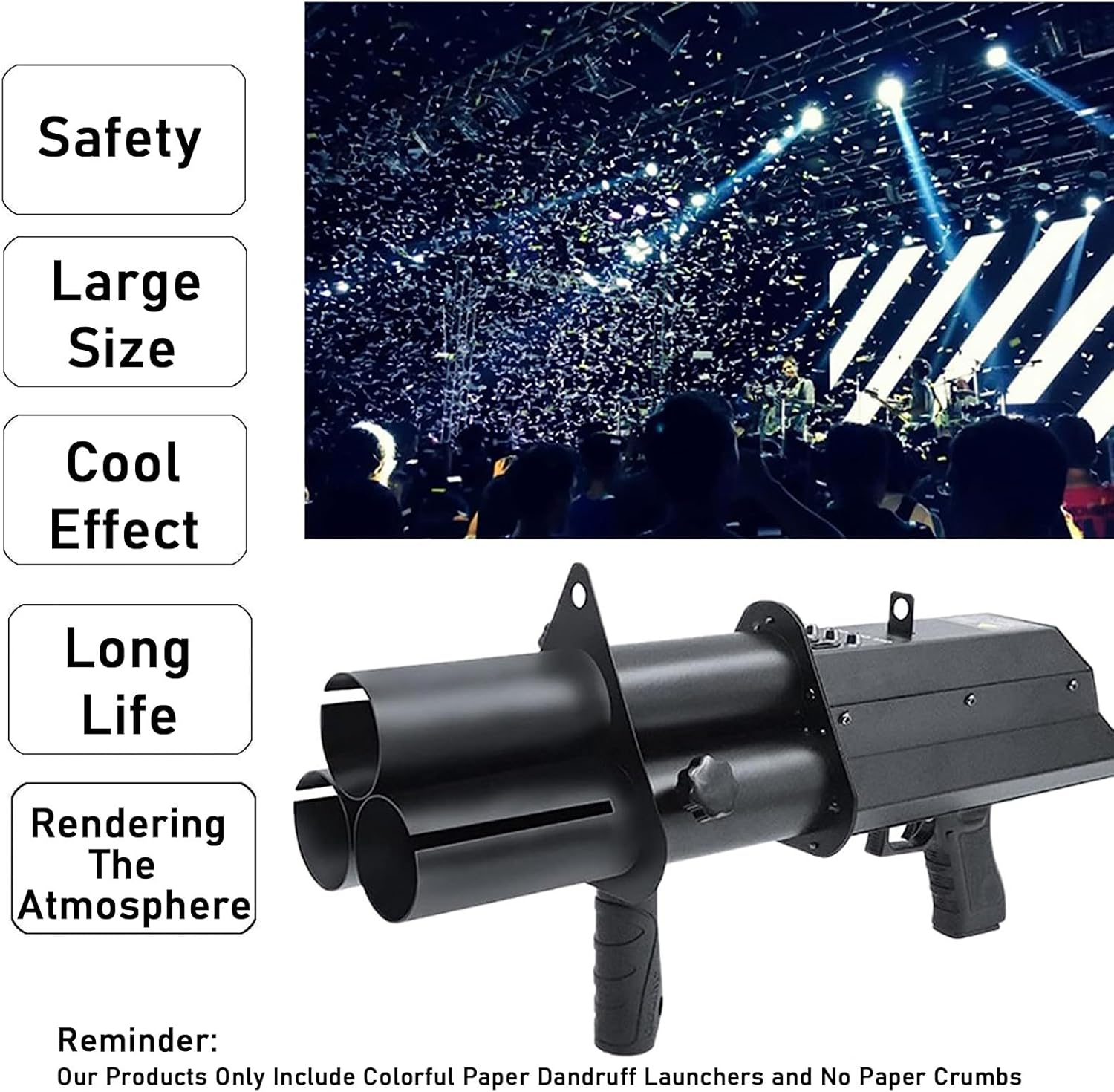 ◖ 【Materiale di alta qualità】 Il lancia coriandoli portatile è realizzato in ferro, che è solido e affidabile, la maniglia è comoda e la struttura concava e convessa aumenta la resistenza allo scivolamento. La batteria al litio integrata può essere caricata ripetutamente, il che è comodo per l'uso in luoghi diversi e ha una lunga durata. ◖【Macchina per carta a colori elettrica】La macchina per carta a colori elettrica professionale è l'ultima attrezzatura per effetti speciali. Ti permette di creare effetti magnifici. L'altezza della carta spray può raggiungere gli 8-10 metri, raggiungendo il picco delle prestazioni. Un accessorio essenziale per luoghi di intrattenimento. ◖ 【Facile da controllare】 Dietro il corpo della sabbiatrice per carta con atmosfera da bar sono presenti quattro interruttori per controllare rispettivamente tre sfere, che possono essere sparate separatamente o simultaneamente. A differenza di molti lanciatori di coriandoli, basta aggiungere coriandoli. Senza la necessità di sostanze propulsive speciali. ◖ 【Ampiamente usato】 La macchina per coriandoli elettronica è adatta a vari programmi TV, discoteche e concerti all'aperto, club, feste, bar, banchetti, spettacoli scolastici, cerimonie nuziali, discoteche, festival musicali, ecc. Perfetto per l'uso mobile, il lancia coriandoli è leggero e facilmente trasportabile, di dimensioni compatte, può essere installato e utilizzato da un singolo intrattenitore. ◖ 【Promemoria】 I nostri prodotti includono solo lanciatori di pellicole di carta colorata e nessuna briciola di carta. Se hai bisogno di briciole di carta, cerca "Briciole di carta" nel negozio per acquistarle separatamente.