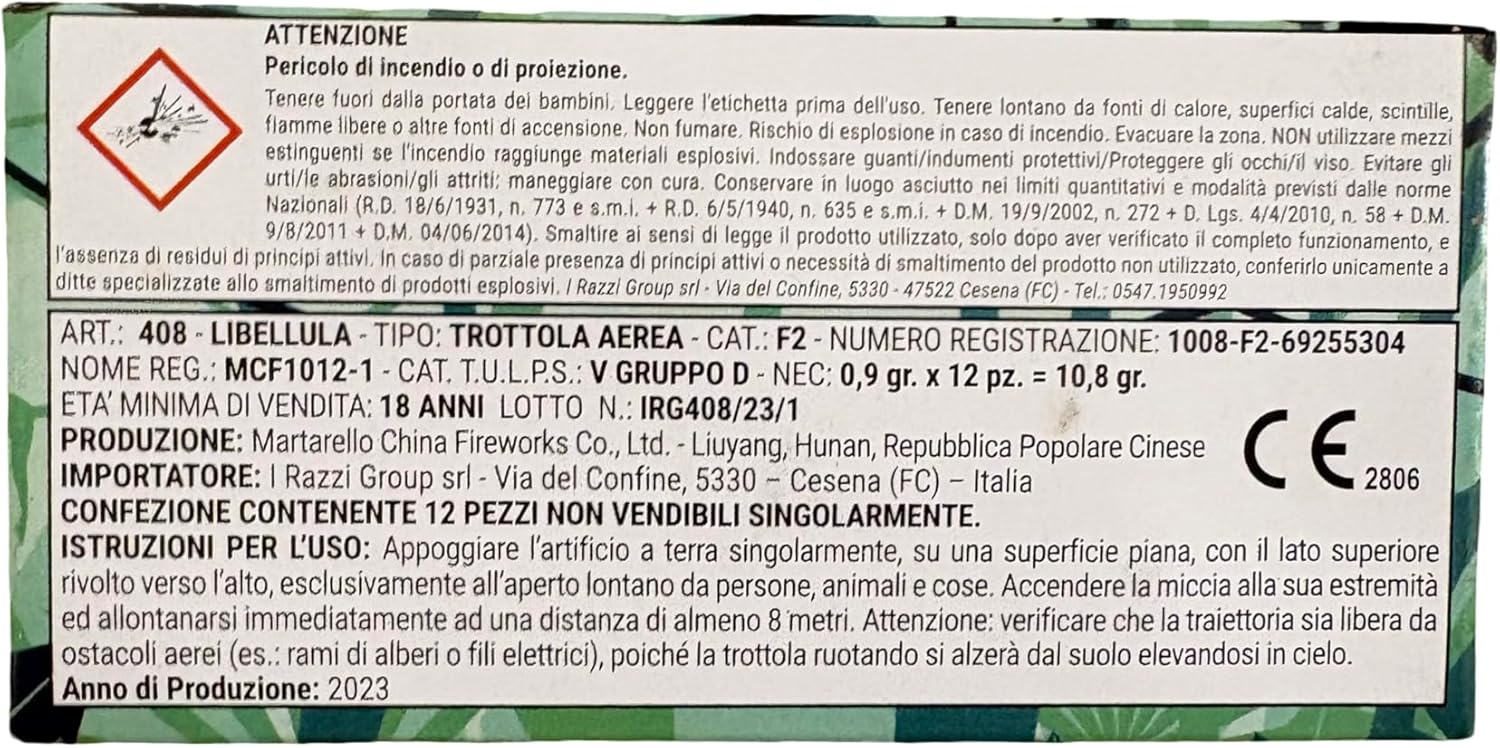 CONTENUTO: 3 X Confezione da 12 pezzi di fuochi d'artificio Libellula, tipo trottola aerea, categoria F2 per uso esterno SPECIFICHE TECNICHE: Peso netto 0,9 gr x 12 pezzi = 10,8 gr totali, prodotto registrato con codice 1008-F2-69255304 ETÀ MINIMA: Riservato esclusivamente a persone di età superiore ai 18 anni, non vendibile singolarmente ISTRUZIONI D'USO: Posizionare su superficie piana con lato superiore verso l'alto, accendere e allontanarsi di almeno 8 metri SICUREZZA: Tenere lontano da fonti di calore, conservare in luogo asciutto, utilizzare solo all'aperto con adeguata distanza di sicurezza