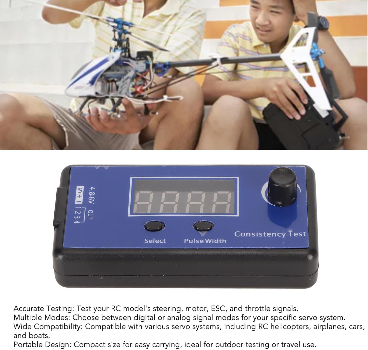 Costruzione premium: tester servo digitale RC realizzato con materiali ABS premium per durata e lunga durata della vita, garantendo prestazioni affidabili nei test del modello RC, il pulsante di segnale digitale o analogico seleziona il sistemaservo corrispondente e quindi si collega al servo dello sterzo per evitare danni a sterzo Test accurati: il tester consente un test accurato dei dispositivi di sterzo, visualizzando la funzionalità di test del segnale PPM per cambiamenti sottili in risposta, il servo tester ha una larghezza di impulso di 3 differenze. 50H (Servo analogico, 20us, 50Hz). 125H (Digital Stering Gear, 8US, 125Hz). 250H (Digital Servo 4US, 250Hz) PROTEGGI IL TUO DISPOSITIVO: passa facilmente dalla modalità di segnale digitale a quella analogica con la semplice pressione di un pulsante e collega in modo sicuro il sistemadel servosterzo senza danneggiarlo, il tester di coerenza ESC può controllare 4 servosterzi contemporaneamente e viene utilizzato per confrontare le prestazioni del controllo del meccanismo di sterzo. Il segnale di uscita del servosterzo può essere preciso fino a 2 µs (1 millisecondo = 1000 microsecondi). Compatibilità versatile: tester elicottero RC adatto a vari sistemi di servo, tra cui elicotteri, aeroplani, automobili e barche, fornendo capacità di test complete. Servo Tester RC può testare che il cambio di sterzo è in grado di rispondere a sottili modifiche con la funzione di test del segnale PPM nel display Compatto e portatile: progettato con una dimensione compatta per una facile conservazione e trasporto, rendendo il servo tester RC ESC ideale per i test sul campo o gli appassionati di RC.