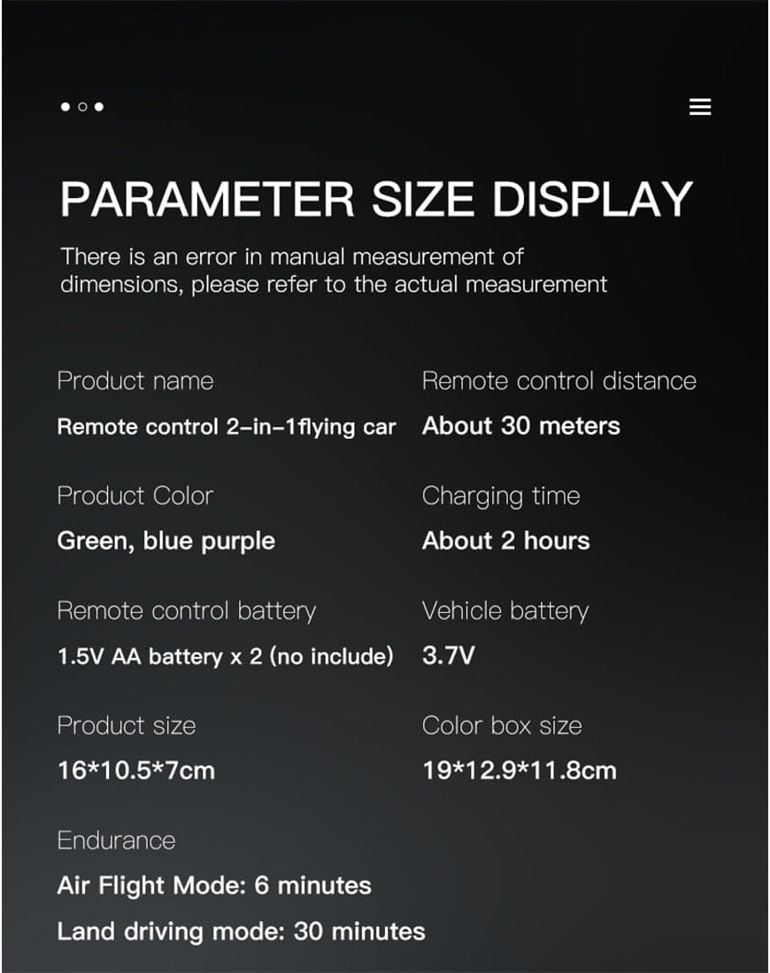 2-in-1 Air and Ground RC Design: passa senza soluzione di continuità tra drone e funzionalità RC auto con questa macchina volante SG900PRO dual-mode. Perfetto per uso interno o esterno con controllo flessibile su qualsiasi terreno Adatto ai principianti con controlli intelligenti: dotato di decollo/atterraggio con un tasto, funzioni di trim precise e un telecomando reattivo a 2,4 GHz. Ideale per gli utenti alle prime armi che cercano esperienze intuitive con auto volante RC Illuminazione a LED vibrante per i voli notturni: le luci LED luminose e intelligenti rendono questa auto RC airground distinguersi in condizioni di scarsa illuminazione. Uno spettacolo per il tramonto o la guida serale e il volo Costruzione durevole con design sorprendente: realizzata con materiali resistenti agli urti, l'auto volante RC presenta un elegante look viola e blu costruito per gestire avventure sia terrestri che aeree Gioco più lungo con doppie batterie: viene fornito con due batterie al litio da 3,7 V. Goditi fino a 30 minuti di guida e circa 6 minuti di volo per carica: più divertimento, meno attese