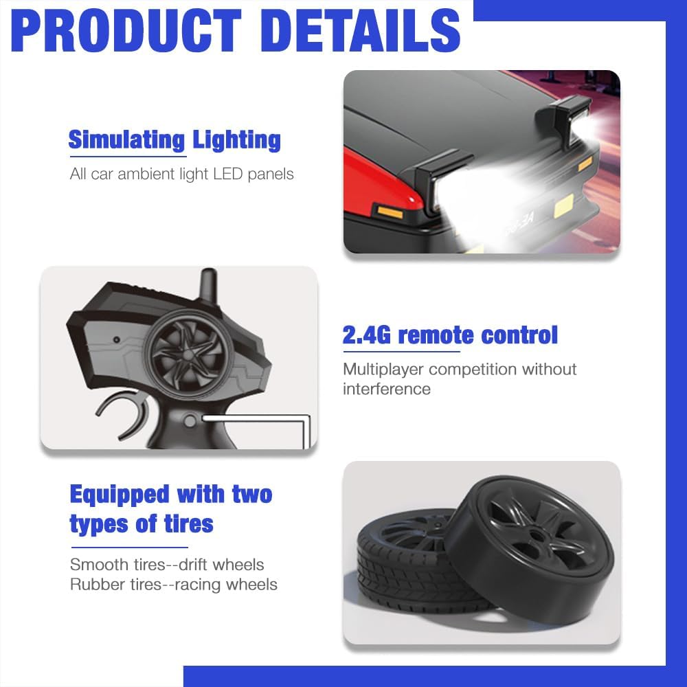 [Esperienza di Drift Definitiva]: questa RC Drift Car è dotata di trazione integrale e di un motore potente, con una velocità massima di 15 km/h. Rc Auto Drift è equipaggiato con pneumatici da drift professionali e regala ai bambini un divertimento entusiasmante. È facile da controllare, sia in accelerazione rettilinea che in curva, e consente ai bambini di divertirsi senza limiti. [Telecomando a 2,4 GHz]: RC Drift Car adotta la tecnologia avanzata di controllo remoto wireless a 2,4 GHz con segnale stabile e lunga distanza di controllo, supportando più persone che giocano contemporaneamente senza interferire tra loro. Il modello Mini Macchina Telecomandata Drift è dotato di una batteria al litio da 3,7 V e di un cavo di ricarica USB, che possono garantire 90 minuti di intrattenimento. [Effetti di Luce Fantastici e Design Anticollisione]: i fari anteriori a LED RC Drift Car abbagliano soprattutto durante la guida notturna e aggiungono un fascino fantastico. La carrozzeria Mini Macchina Telecomandata Drift è realizzata in materiale ABS di alta qualità ed è dotata di una scocca anticollisione rimovibile e di un telaio anticaduta per garantire che il veicolo rimanga intatto anche durante la guida intensiva e prolungarne la durata. [Funzionamento Pratico]: RC Drift Car è dotato di 8 pneumatici e 6 posti di blocco per soddisfare diverse modalità di guida e requisiti di difficoltà. Il telecomando portatile a forma di pistola è semplice e facile da usare (il telecomando richiede 2 batterie AA), così anche i principianti possono padroneggiare rapidamente il gioco e divertirsi. [Scelta Regalo Perfetta]: RC Drift Car è un regalo giocattolo ideale per i bambini che amano le corse. Non solo è bello e funzionale, ma può anche promuovere le abilità sociali e il lavoro di squadra dei bambini. Che si tratti di compleanni, Natale o momenti di ricompensa, può regalare ai bambini infinite sorprese e gioia e soddisfare la loro ricerca di velocità e passione.