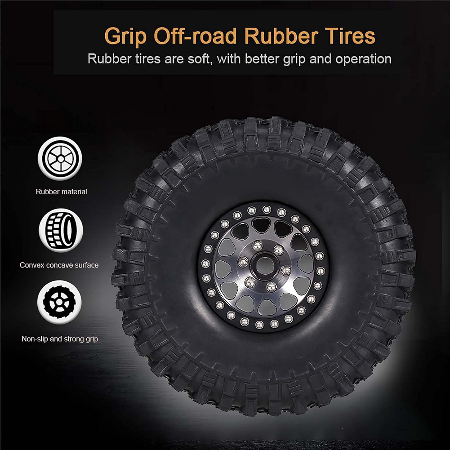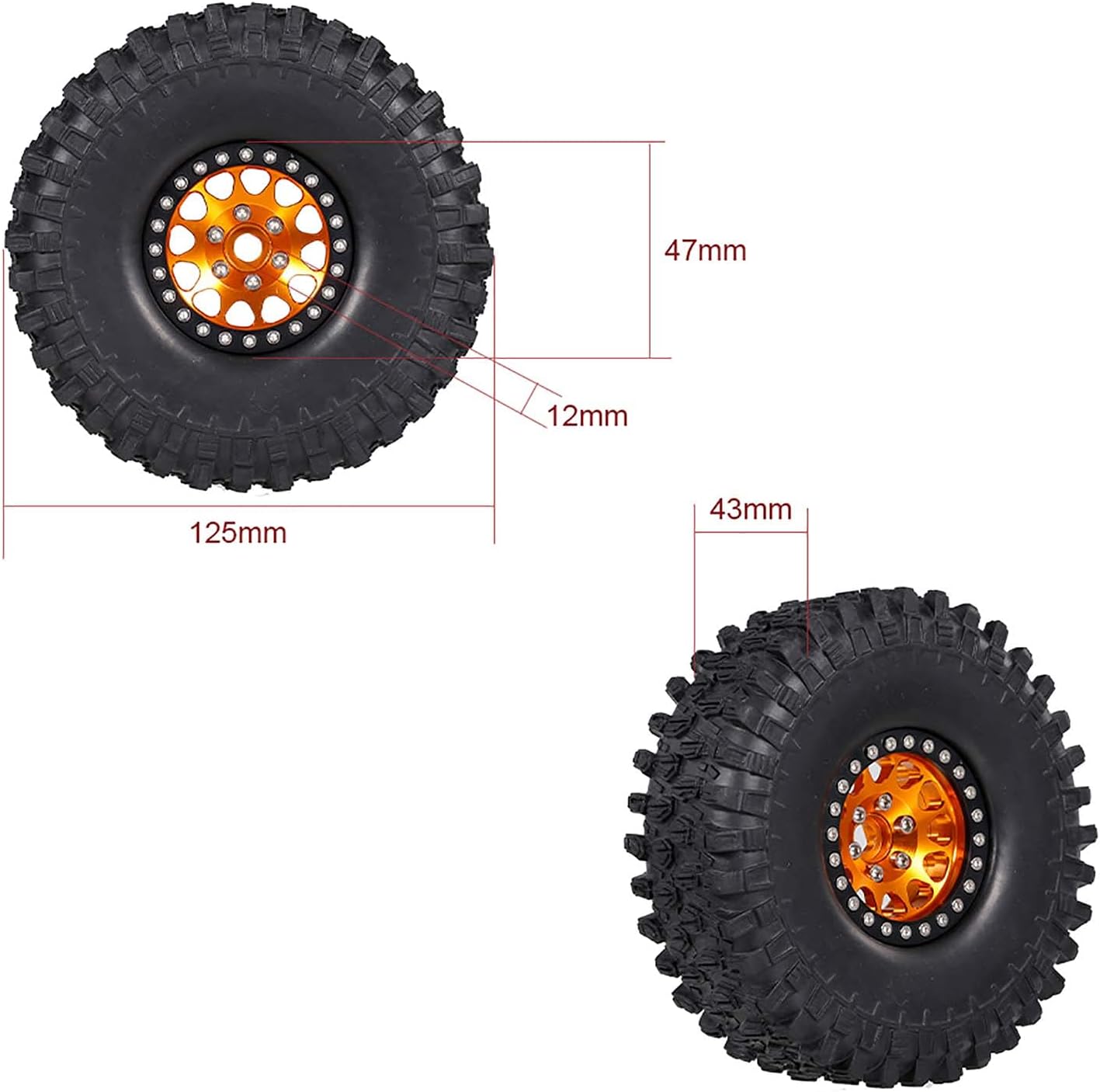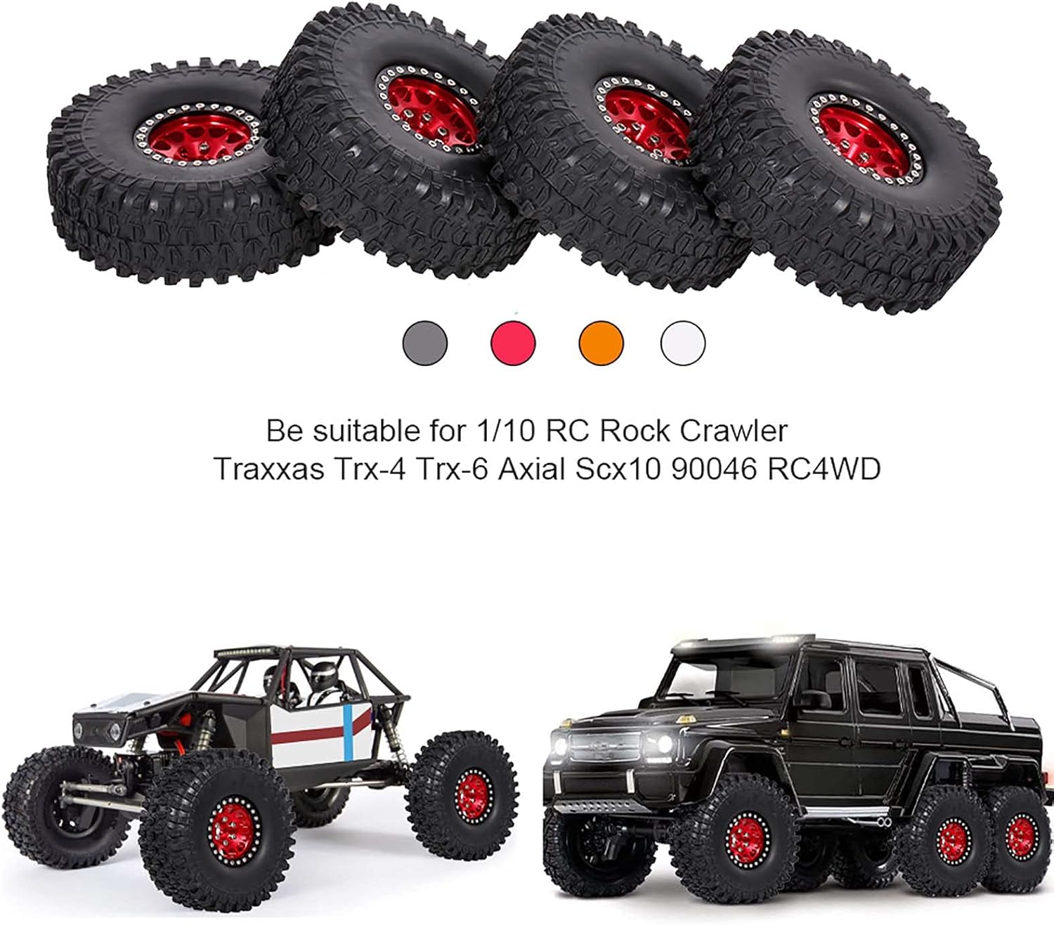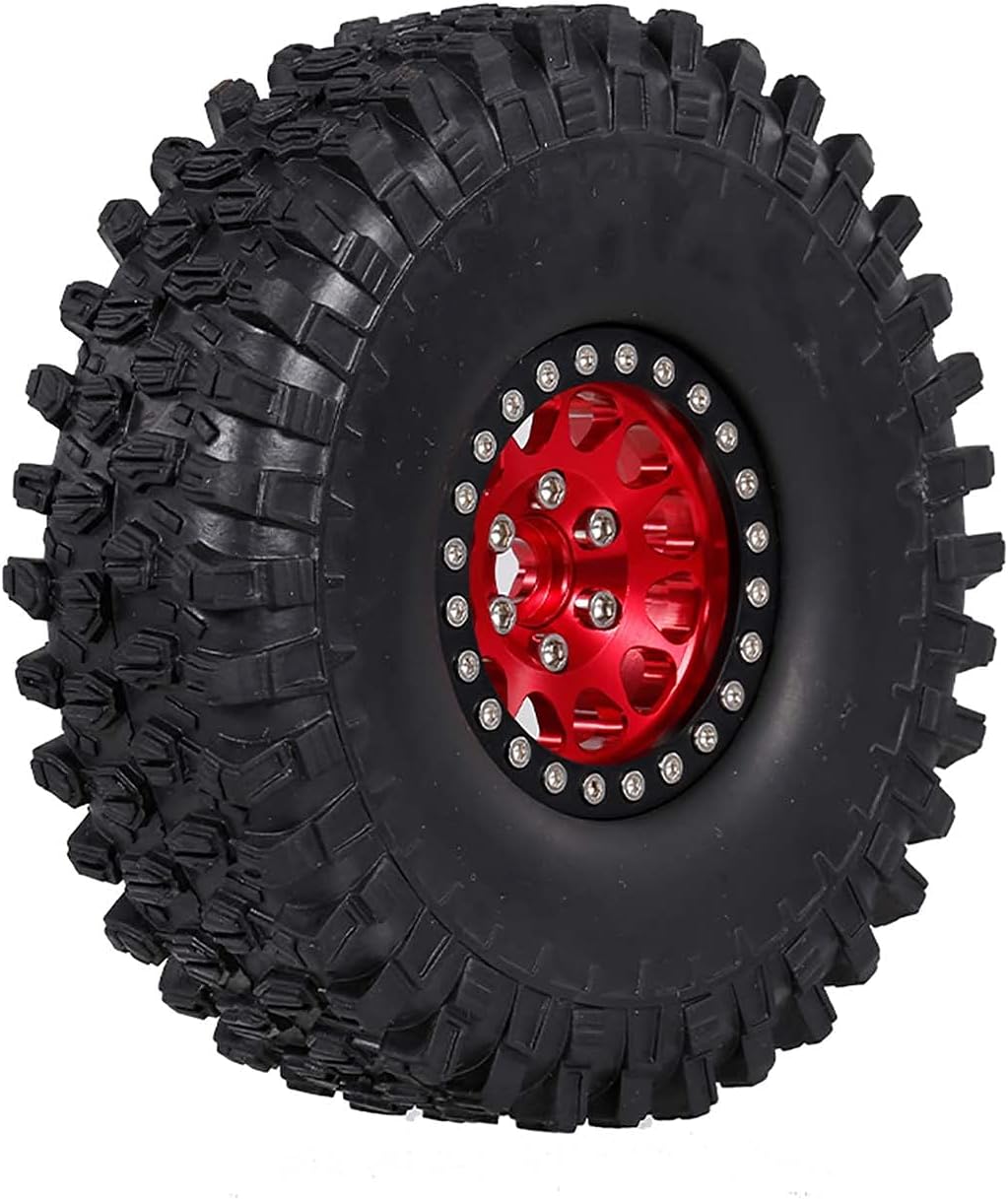 I pneumatici utilizzano un design avanzato e materiali in gomma per fornire un'incredibile capacità di presa e possono funzionare bene su qualsiasi terreno. Il diametro esterno della ruota è di 125 mm, la larghezza della ruota è 43 mm. I pneumatici sono adatti per 1/10 rc rock crawler traxxas Trx-4 Trx-6 assiale scx10 90046. Viaggia su diversi terreni, come spiagge, strade, erba, deserti, ecc. Il mozzo dei cerchi in metallo pieno resistente può dare un buon supporto per il pneumatico. Il mozzo e i pneumatici in gomma possono essere rimossi in modo da poter sostituire i pneumatici in gomma come preferisci. Facile da installare i pneumatici, i pneumatici resistenti forniranno una forte presa superficiale, gli appassionati di fai da te dell'auto telecomandata apprezzeranno molto.