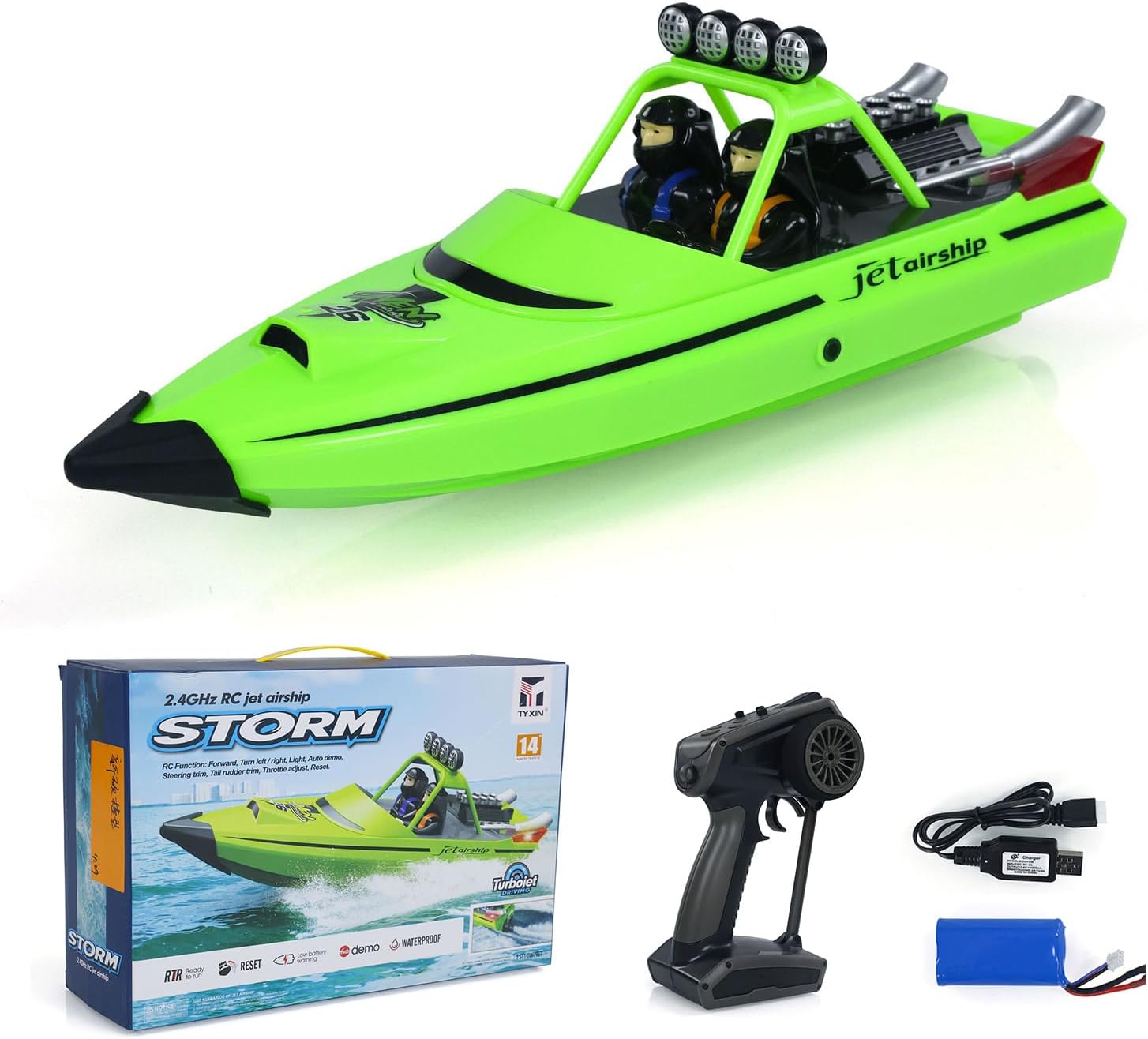 La plastica ABS di alta qualità rende la barca durevole Eccellenti prestazioni impermeabili Un tasto di reset (la barca è progettata con una funzione di auto-raddrizzamento. Quando la barca è capovolta dalle onde, premendo il pulsante di reset per capovolgere la barca in posizione verticale) Le luci a LED rendono più facile identificare la barca di notte Turbojet Driving (la potenza è stabile e veloce) Avviso batteria scarica Flessibile coda timone trim, sterzo trim e acceleratore regolare Demo automatica