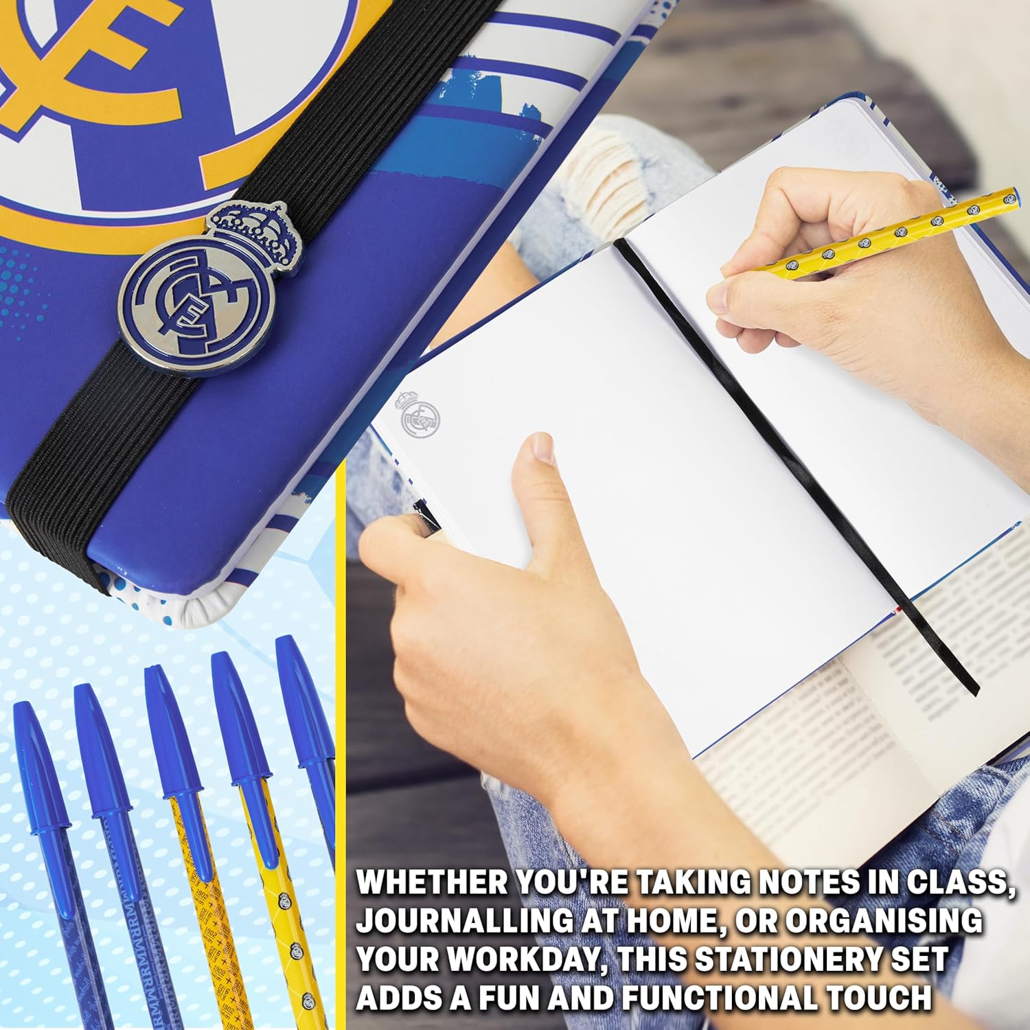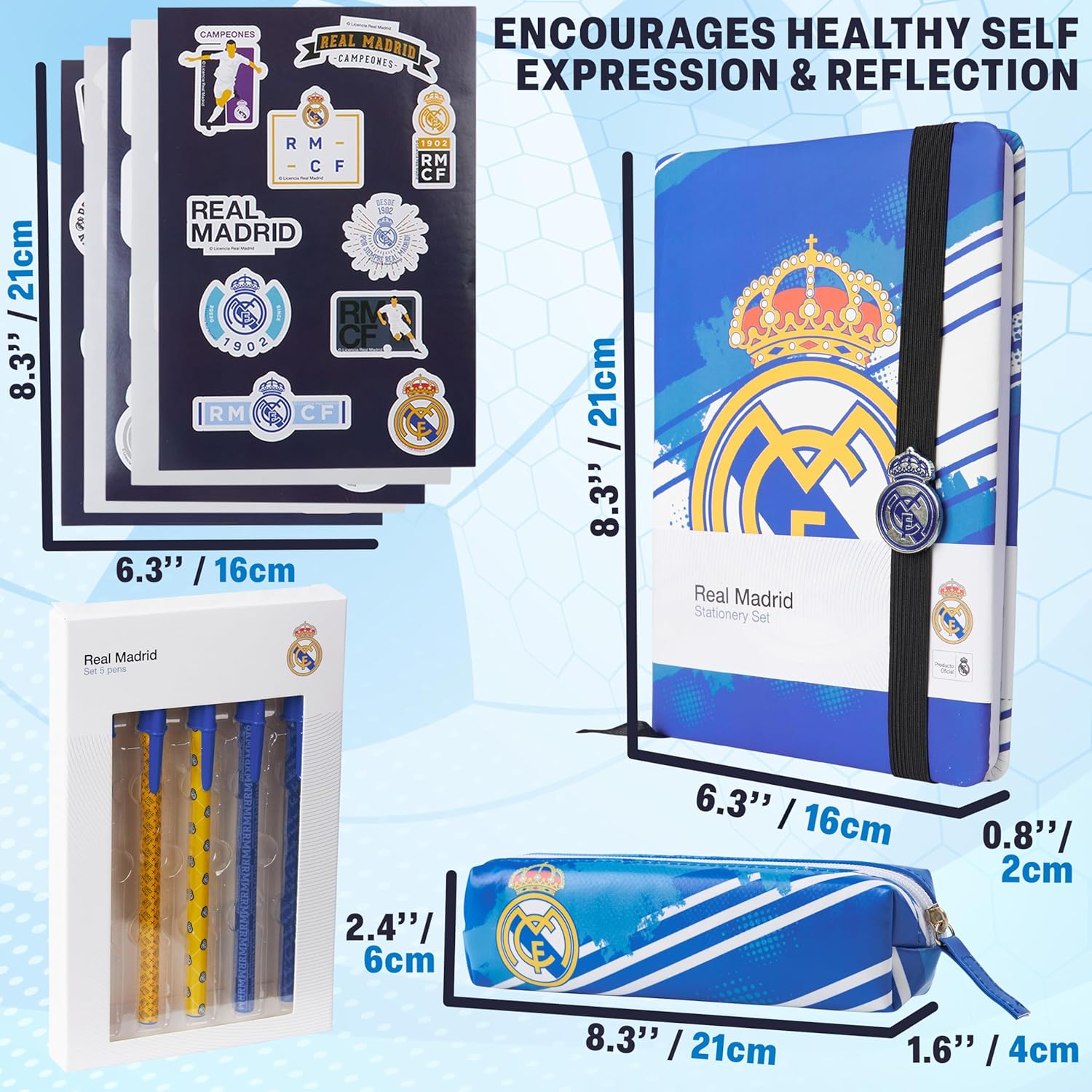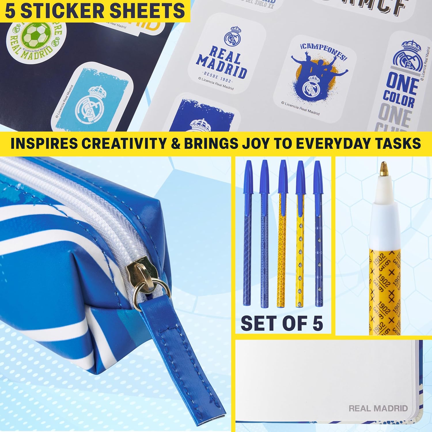 Set Completo da Tifoso Real Madrid - Include un quaderno rigido senza righe, 5 penna a sfera, un astuccio e 5 fogli di adesivi da collezione: tutto il necessario per restare organizzati con stile madridista! Ideale per Scuola, Casa o Ufficio - Che tu stia prendendo appunti, scrivendo il diario o pianificando la giornata, questo set di cancelleria rende ogni attività più piacevole e piena di spirito sportivo. Design Pratico con Stile da Campioni - Ogni articolo unisce funzionalità e design ispirato al Real Madrid, pensato per adulti e ragazzi che vogliono portare sempre con sé l’orgoglio della propria squadra. Un Regalo da Gol per Ogni Età - Ideale per bambini, ragazzi o tifosi adulti: un dono ideale per compleanni o l’inizio della scuola. Un must-have per ogni vero fan dei Blancos! Merchandising Ufficiale Real Madrid - Mostra con orgoglio la tua passione per la squadra con accessori originali e autorizzati, decorati con grafiche esclusive e colori iconici del Real Madrid.