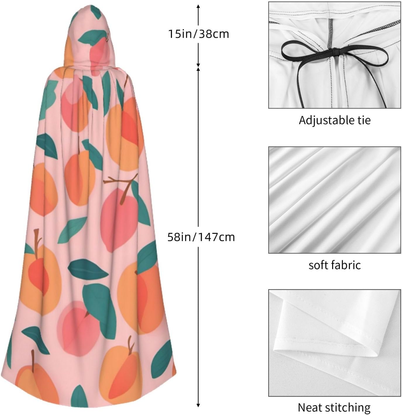 Il design senza cerniera, abbinato a un grande mantello con cappuccio e cravatta al collo, migliora il tuo mistero mantenendoti comodo con il suo tessuto non prurito. Con una lunghezza di 147 cm, larghezza di 154 cm e un'altezza del cappuccio di 38 cm, il nostro mantello con cappuccio con stampa a motivo pesca rosso senza cuciture offre una copertura completa, assicurandoti di distinguerti in ogni occasione. Vari eventi come Halloween, cosplay, costumi da palcoscenico, feste a tema, balli, convegni di fumetti e molto altro ancora, il nostro mantello è versatile e conveniente. Facile da mantenere e di lunga durata, il nostro mantello con cappuccio con stampa con motivo rosso pesca senza cuciture è lavabile in lavatrice e lavabile a mano. Con un design neutro, il nostro mantello è perfetto per uomini e donne.