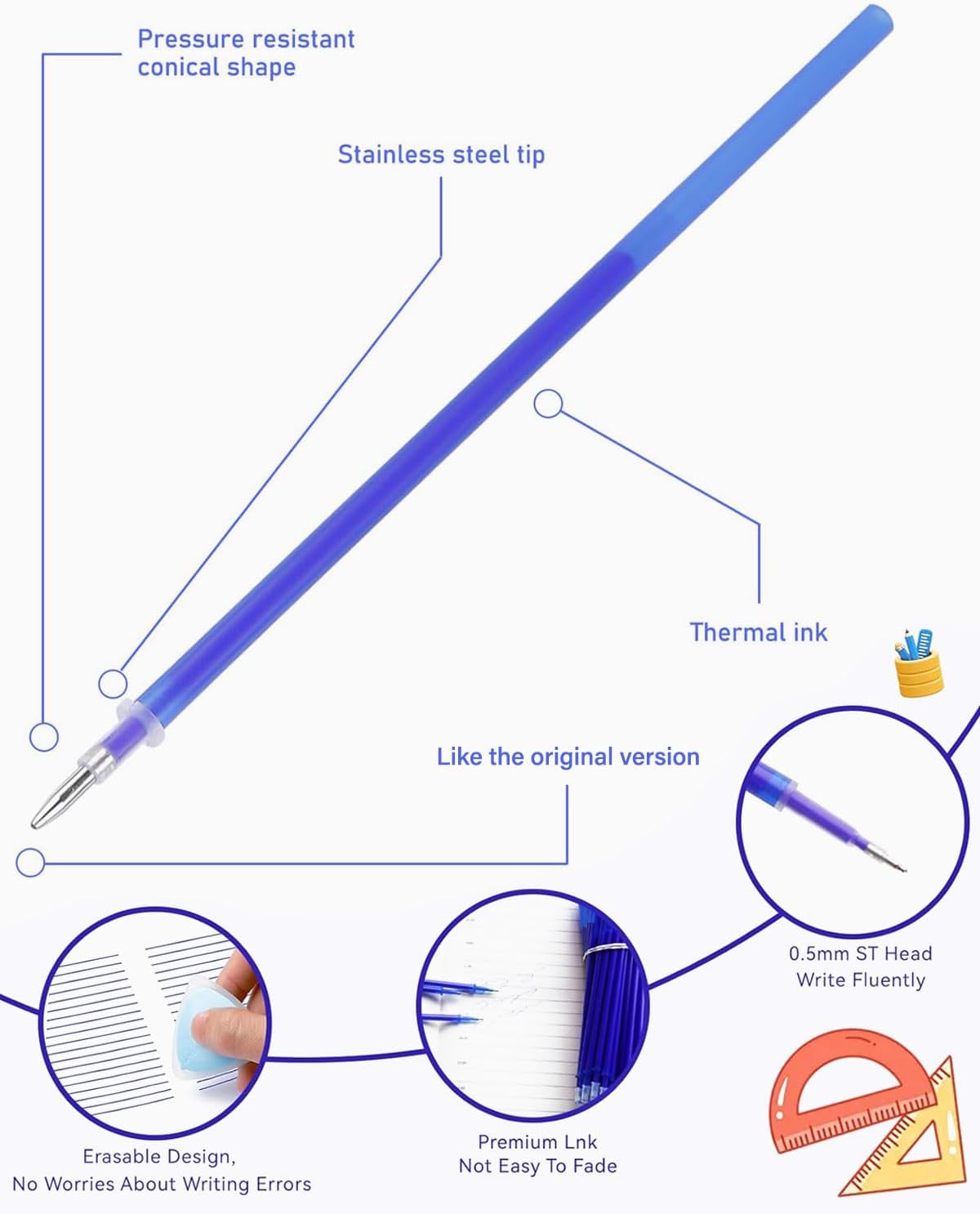 Ricariche: Compatibili con Legami, blu, punta da 0,7 mm Cancellazione Facile: basta usare la gomma sul cappuccio della penna per pulire l'inchiostro dalla carta. |Pericolo! L'inchiostro è sensibile al calore. Tenere gli appunti importanti lontano da fonti di calore Materiali E Dimensioni: inchiostro termico di alta qualità. Altezza 13 cm. Diametro 4 mm, lunghezza di scrittura: 170 M 。 Perfette Come Regalo: che si tratti di bambini, studenti, insegnanti, amici, colleghi o familiari, queste penne sono un'ottima scelta per compleanni, festa dei bambini, Natale o occasioni di ritorno a scuola Antigraffio: utilizza carta sottile ecologica per scrivere, antigraffio, adatta a principianti o bambini