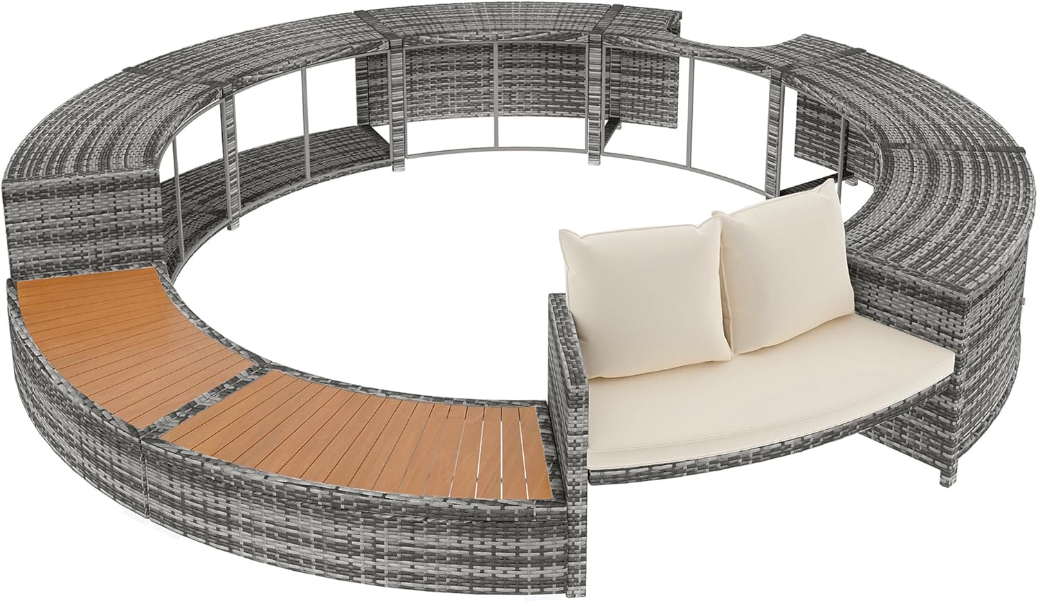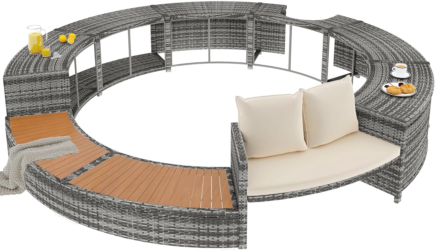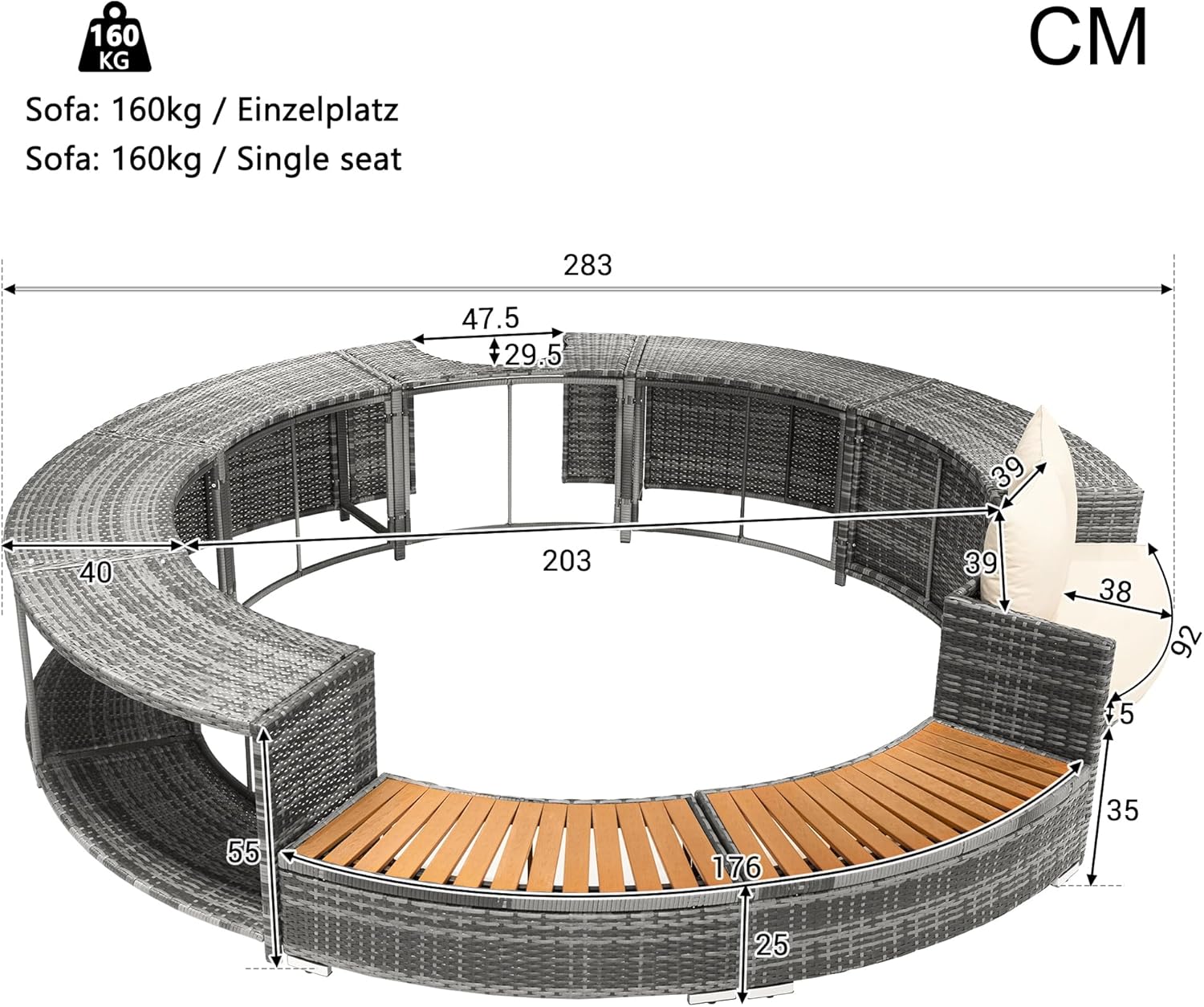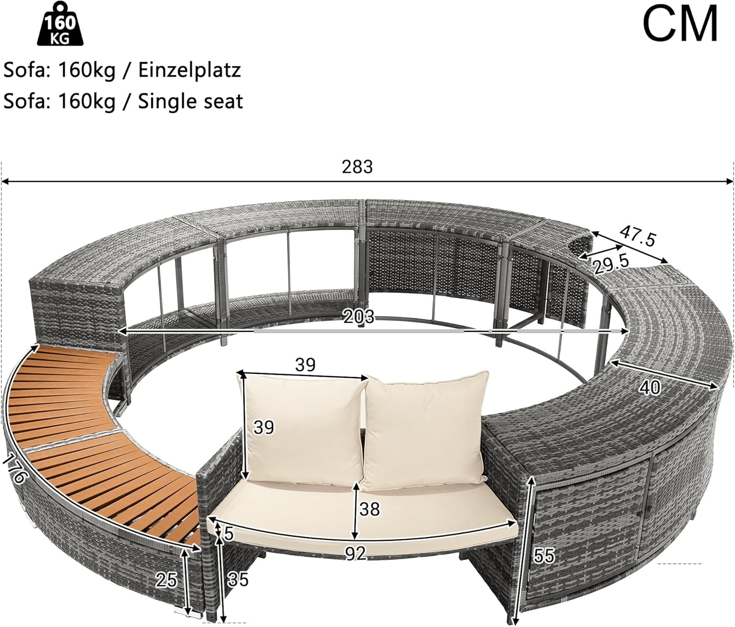 Dimensioni del prodotto: 203 cm di diametro interno, 283 cm di diametro esterno, 55 cm di altezza telaio, 25 cm di altezza sedile (il prodotto effettivo non include la piscina) Struttura anellare: con questa elegante struttura di confine per mobili da giardino all'aperto, la tua piscina diventerà un'oasi di lusso per la spa! Il salone circolare offre ampio spazio per il relax, adatto per vasche idromassaggio fino a 200 cm di diametro e altre piscine comuni. Design elegante e versatilità: questo set di mobili da esterno aggiunge un tocco di stile e comfort al tuo giardino con il suo elegante design in PE e la sua struttura rotonda. Le opzioni di stoccaggio nell'area salotto aggiungono ulteriormente la funzionalità. Materiali di qualità e divertimento estivo: l'uso di materiale PE resistente alle intemperie garantisce la durata e la facilità di manutenzione per l'uso all'aperto a lungo termine. Fornisce spazio di stoccaggio: il ripostiglio con porta offre spazio sufficiente per asciugamani, protezione solare e altri articoli necessari per il bagno e può essere chiuso con due porte. Inoltre, sono inclusi due cuscini e un cuscino a due posti per rendere l'estate più confortevole