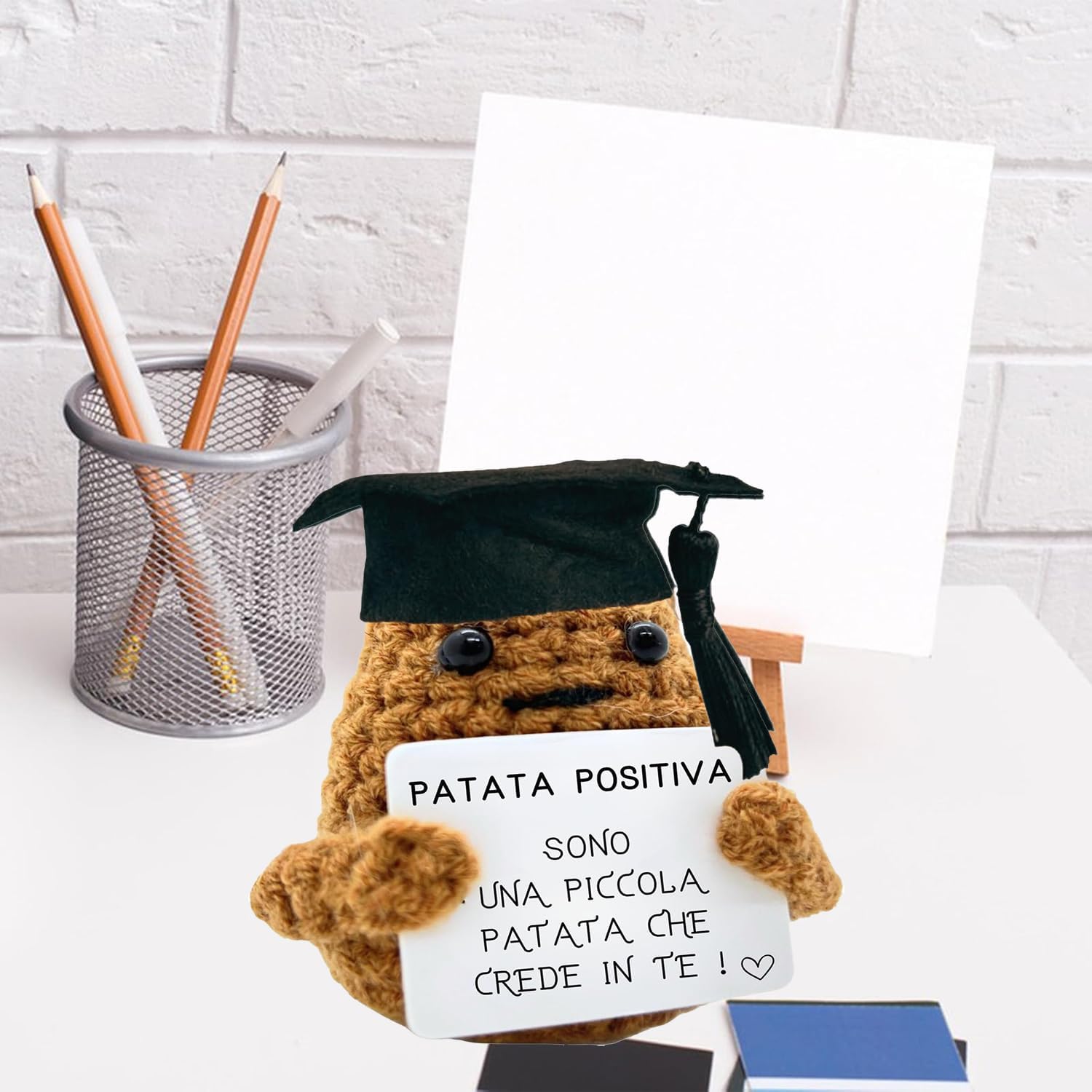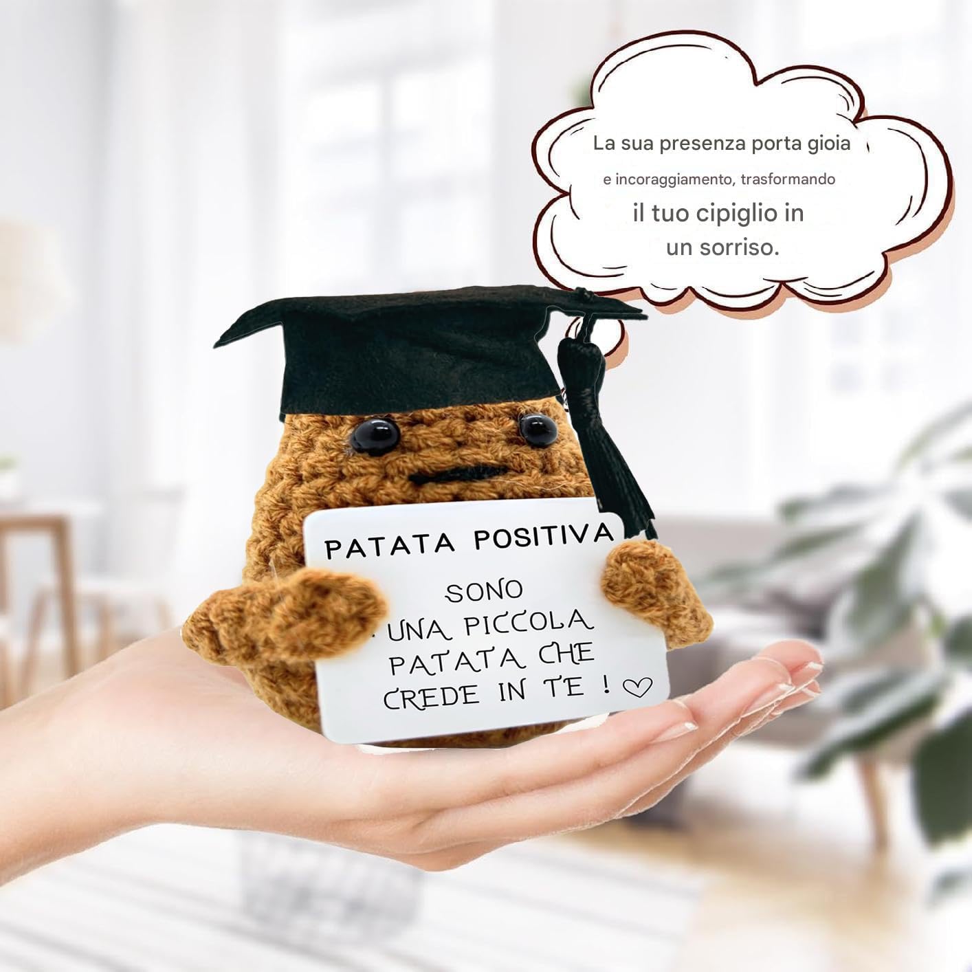 Contenuto dell'ordine: prendi una patata positiva unica realizzata in filato di lana di alta qualità. Riceverai un gomitolo da 7 cm con una parola d'animo stampata e un biglietto incollato che non si stacca. Perfetto come dettaglio divertente e motivante. REGALO ORIGINALE E MOTIVATORE: Metti da parte i regali noiosi e stupisci con questa patata positiva. Ideale per compleanni, Natale, amici invisibili, o semplicemente per ravvivare una persona speciale. Dona risate al tuo partner, amico, sorella, o anche al tuo capo. Risate garantite: ogni patata viene fornita con un tocco di umorismo e un messaggio motivante. È impossibile guardarla senza sentire una scintilla di gioia. Il regalo perfetto per rompere il ghiaccio o per illuminare ogni giorno! Decorazione unica per casa e ufficio: aggiunge un tocco di umore e stile a qualsiasi spazio. Perfetto per soggiorno, camera da letto, ufficio o anche il bagno. Ogni sguardo a questa patata ti farà sorridere e ti riempirà di motivazione. ※ Regalo versatile e divertente: dagli adolescenti ai nonni, questa patata positiva è il regalo perfetto per tutte le età e occasioni. Da utilizzare come articolo per scherzi, per anniversario o semplicemente per sorprendere qualcuno con un buon umore. REGALO CHE MAI FALLA: Ideale per ogni occasione: da compleanno, matrimonio o Natale a sorpresa al lavoro. Perfetto per chi ha già tutto o cerca qualcosa di veramente unico e memorabile. Piccole dimensioni, grande impatto: il suo design compatto (7 cm) è ideale per portarlo ovunque. Si adatta perfettamente a qualsiasi scrivania, tavolo o scaffale senza occupare troppo spazio, ma con un effetto gigante sull'umore!