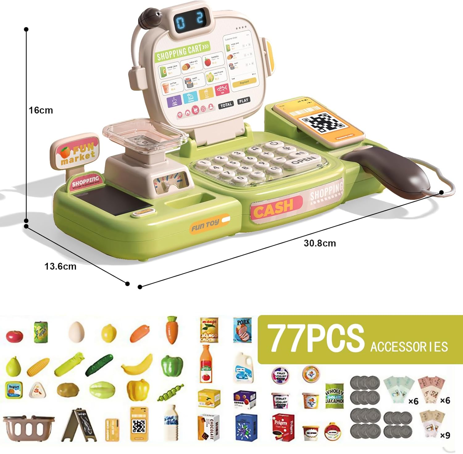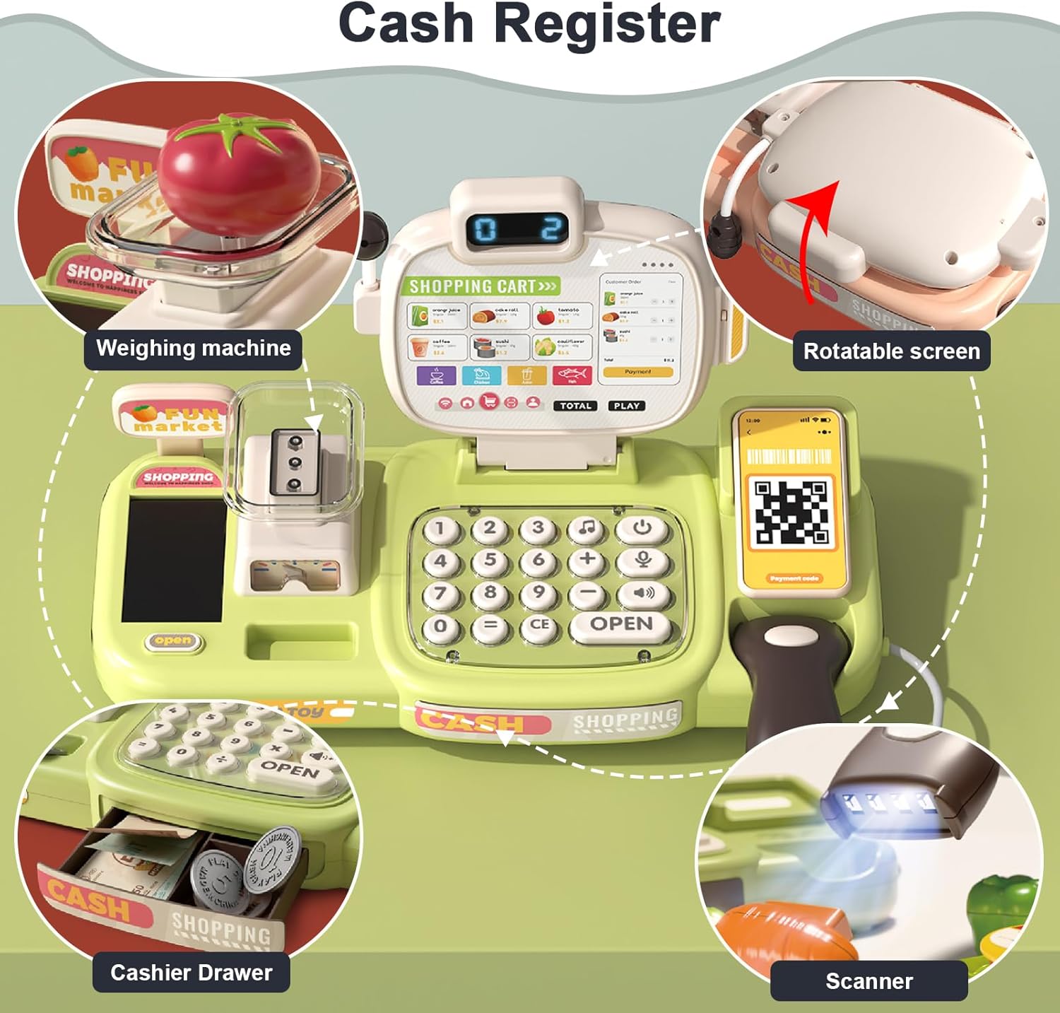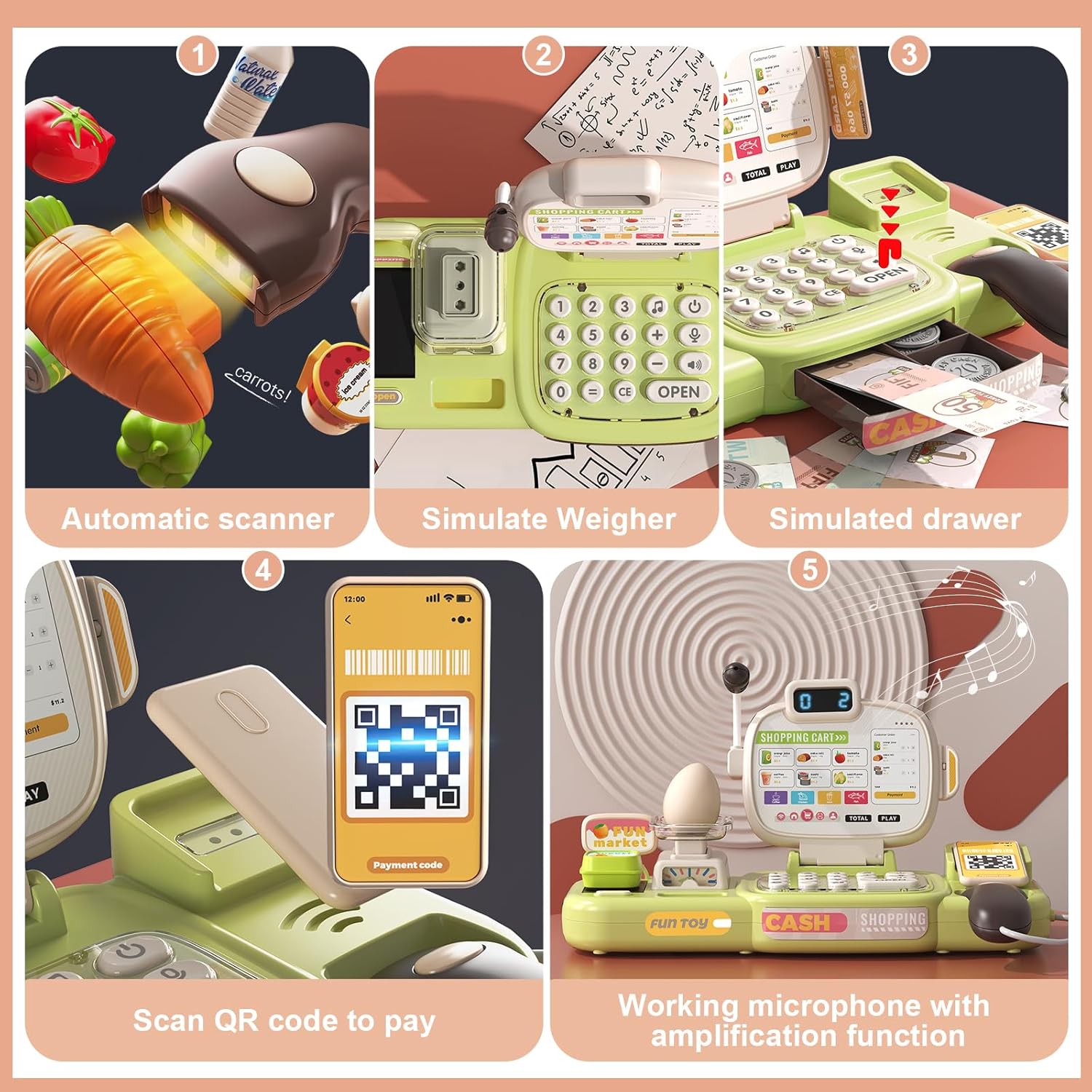Esperienza realistica del cassiere: set da cassiere da 77 pezzi, strumenti giocattolo realistici e pratici, può fungere da vero cassiere del supermercato, simulare il vero shopping al supermercato e provare il divertimento dello shopping. Scansiona più articoli contemporaneamente e il cassiere combinerà il prezzo totale di più articoli scansionati, aumentando il divertimento di essere un vero cassiere di un supermercato! Super flessibile e libero di giocare Sicuro e durevole, progettato per i bambini: plastica ABS spessa con bordi arrotondati per resistere al gioco selvaggio, leggero ed ergonomico per bambini di 3, 4, 5 e 6 anni. La sicurezza di tuo figlio è la nostra massima priorità! Impara attraverso il gioco e migliora le diverse abilità: migliora le capacità cognitive dei bambini. Lasciate che i vostri bambini imparino giocando! Le capacità motorie fini allenano la flessibilità delle mani e del cervello dei bambini e migliorano il pensiero cognitivo! Facile da riporre e promuovere l'abitudine all'ordine: promuovi l'abitudine all'ordine. Il registratore di cassa è dotato di cassetti integrati in cui è possibile sistemare giocattoli, banconote e carte. Ciò rende facile e conveniente per i bambini organizzare le cose e sviluppare buone abitudini organizzative! Set di giocattoli per registratore di cassa multifunzionale: il giocattolo del registratore di cassa è dotato di microfono, bilancia, nastro trasportatore, spazzatrice di riconoscimento intelligente, monete giocattolo, carta di credito, carrello della spesa e set di giocattoli per la spesa, così i bambini possono godersi una divertente visita simulata al supermercato! Nota: la lingua di questo registratore di cassa è l'inglese.