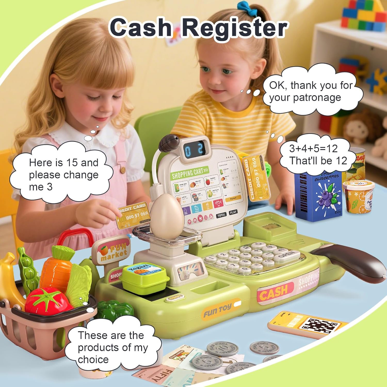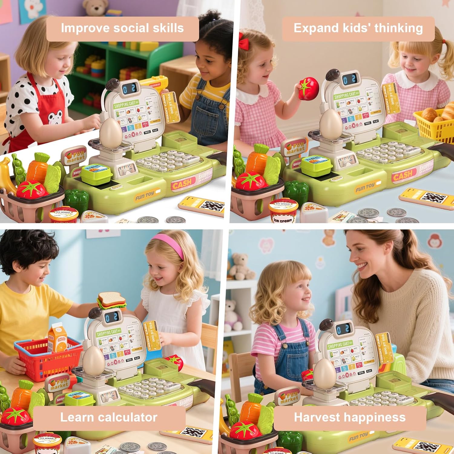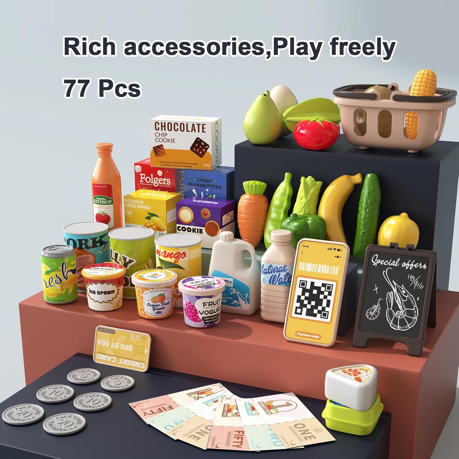 Esperienza realistica del cassiere: set da cassiere da 77 pezzi, strumenti giocattolo realistici e pratici, può fungere da vero cassiere del supermercato, simulare il vero shopping al supermercato e provare il divertimento dello shopping. Scansiona più articoli contemporaneamente e il cassiere combinerà il prezzo totale di più articoli scansionati, aumentando il divertimento di essere un vero cassiere di un supermercato! Super flessibile e libero di giocare Sicuro e durevole, progettato per i bambini: plastica ABS spessa con bordi arrotondati per resistere al gioco selvaggio, leggero ed ergonomico per bambini di 3, 4, 5 e 6 anni. La sicurezza di tuo figlio è la nostra massima priorità! Impara attraverso il gioco e migliora le diverse abilità: migliora le capacità cognitive dei bambini. Lasciate che i vostri bambini imparino giocando! Le capacità motorie fini allenano la flessibilità delle mani e del cervello dei bambini e migliorano il pensiero cognitivo! Facile da riporre e promuovere l'abitudine all'ordine: promuovi l'abitudine all'ordine. Il registratore di cassa è dotato di cassetti integrati in cui è possibile sistemare giocattoli, banconote e carte. Ciò rende facile e conveniente per i bambini organizzare le cose e sviluppare buone abitudini organizzative! Set di giocattoli per registratore di cassa multifunzionale: il giocattolo del registratore di cassa è dotato di microfono, bilancia, nastro trasportatore, spazzatrice di riconoscimento intelligente, monete giocattolo, carta di credito, carrello della spesa e set di giocattoli per la spesa, così i bambini possono godersi una divertente visita simulata al supermercato! Nota: la lingua di questo registratore di cassa è l'inglese.
