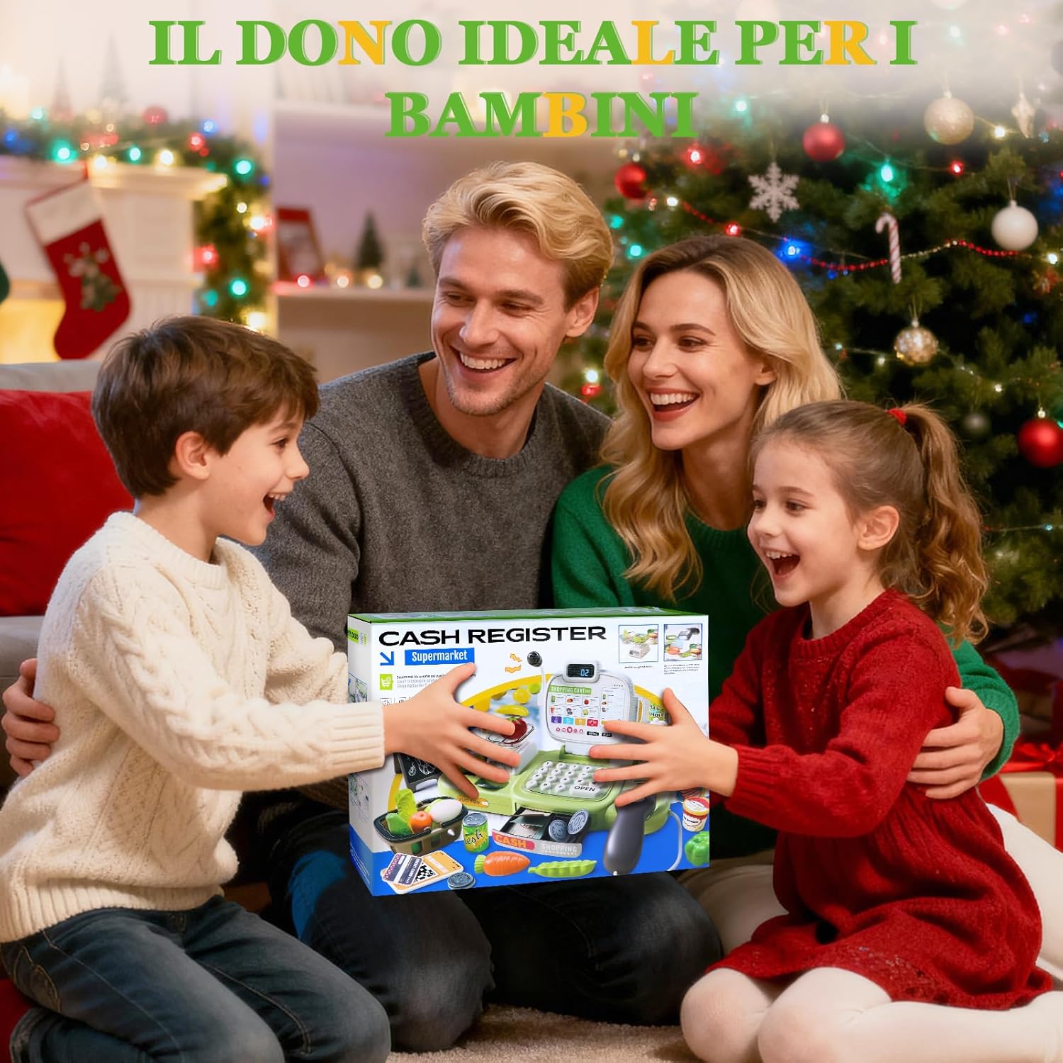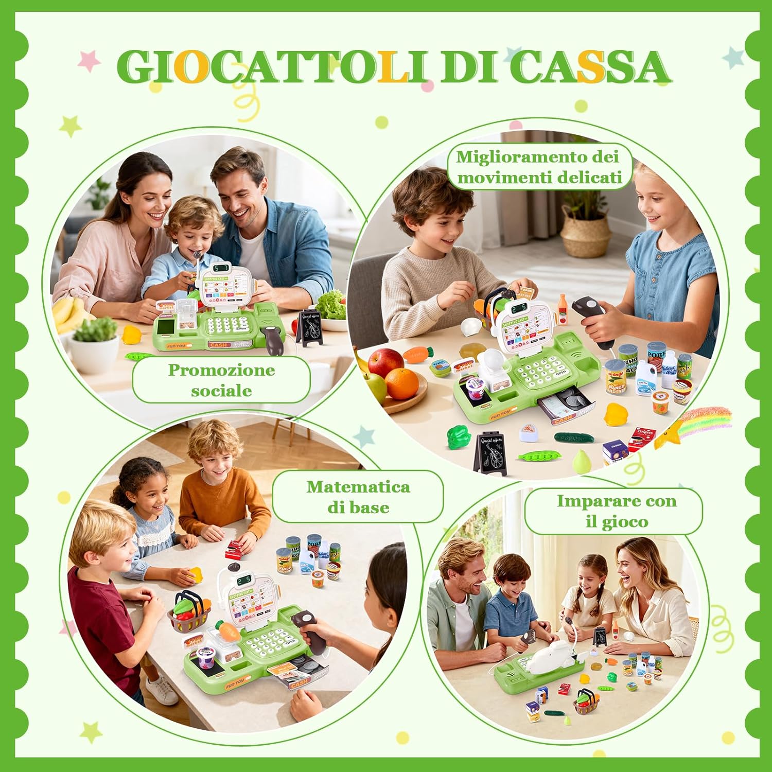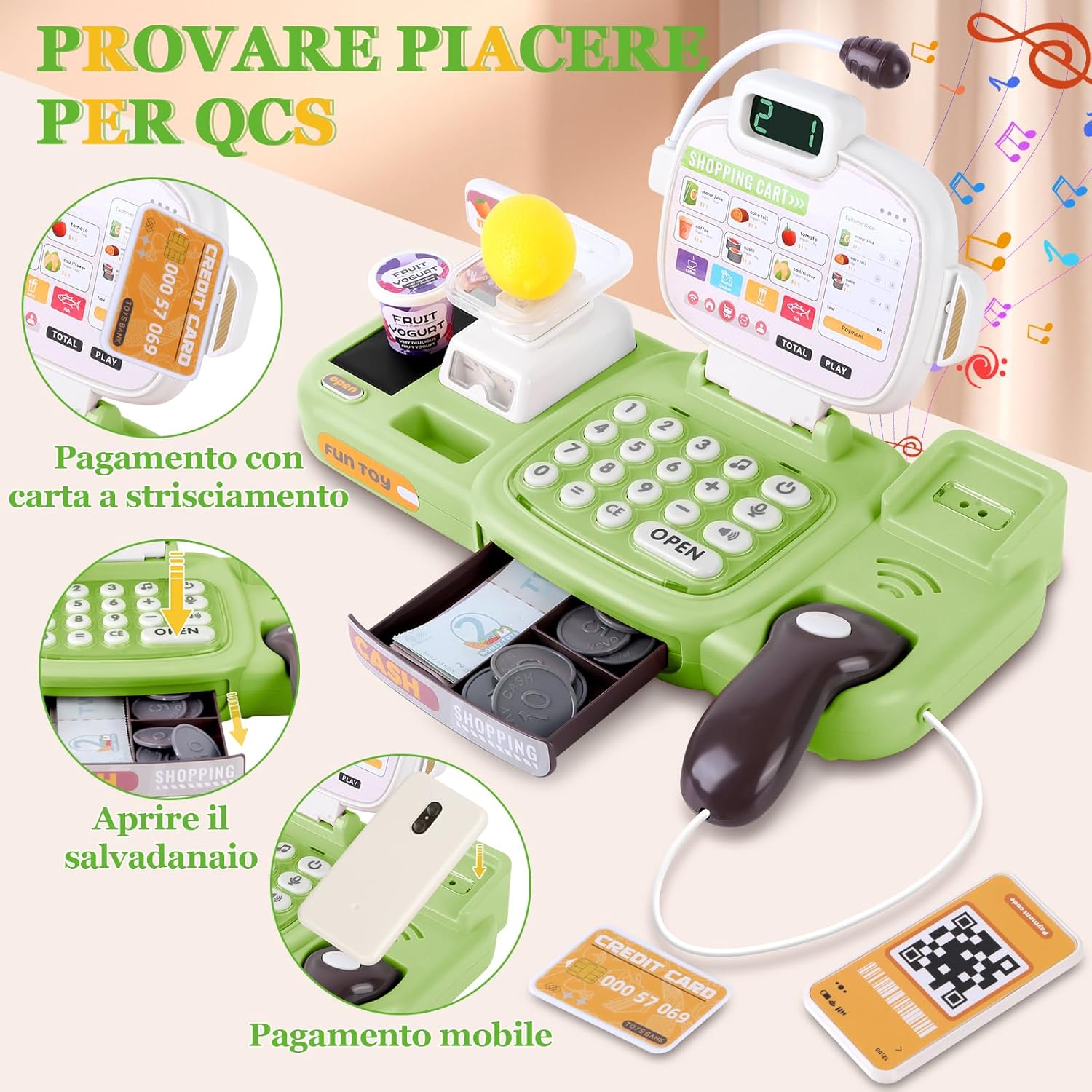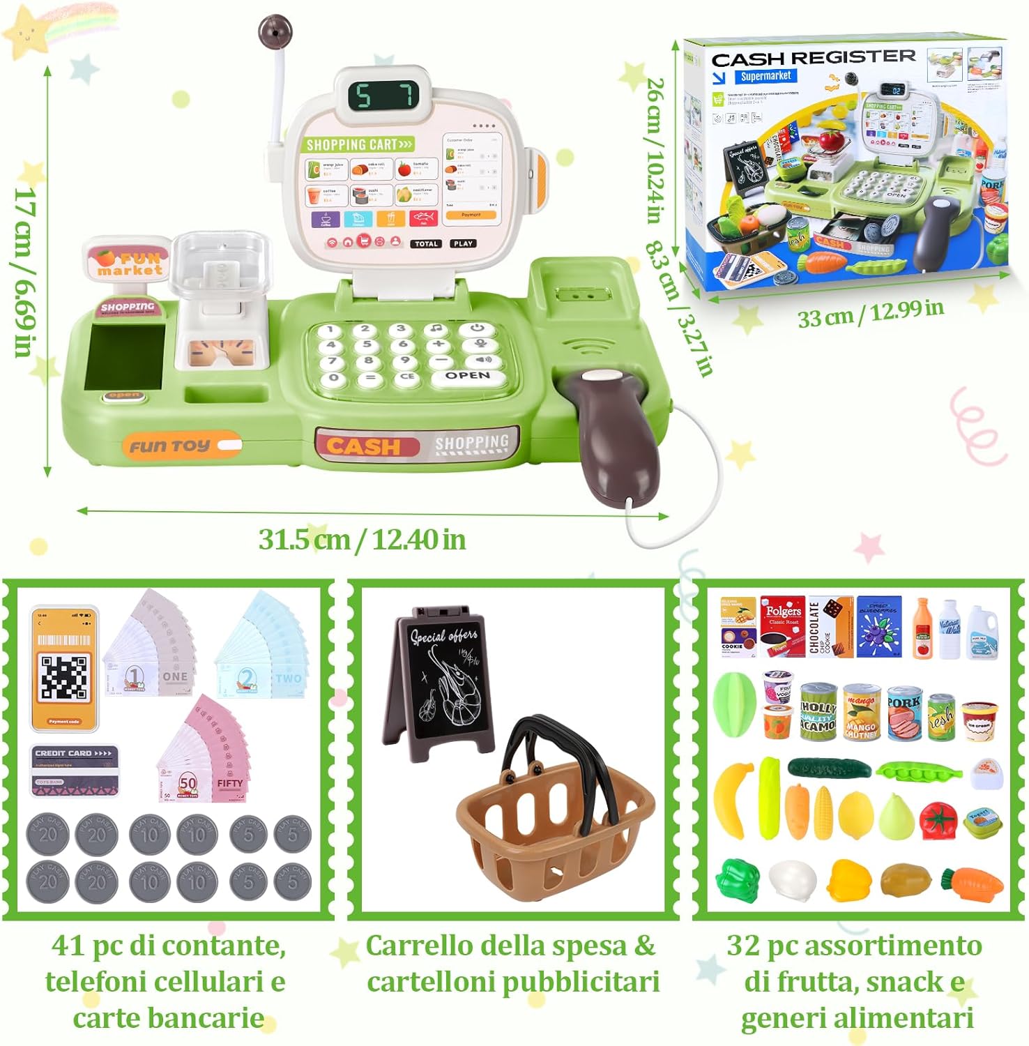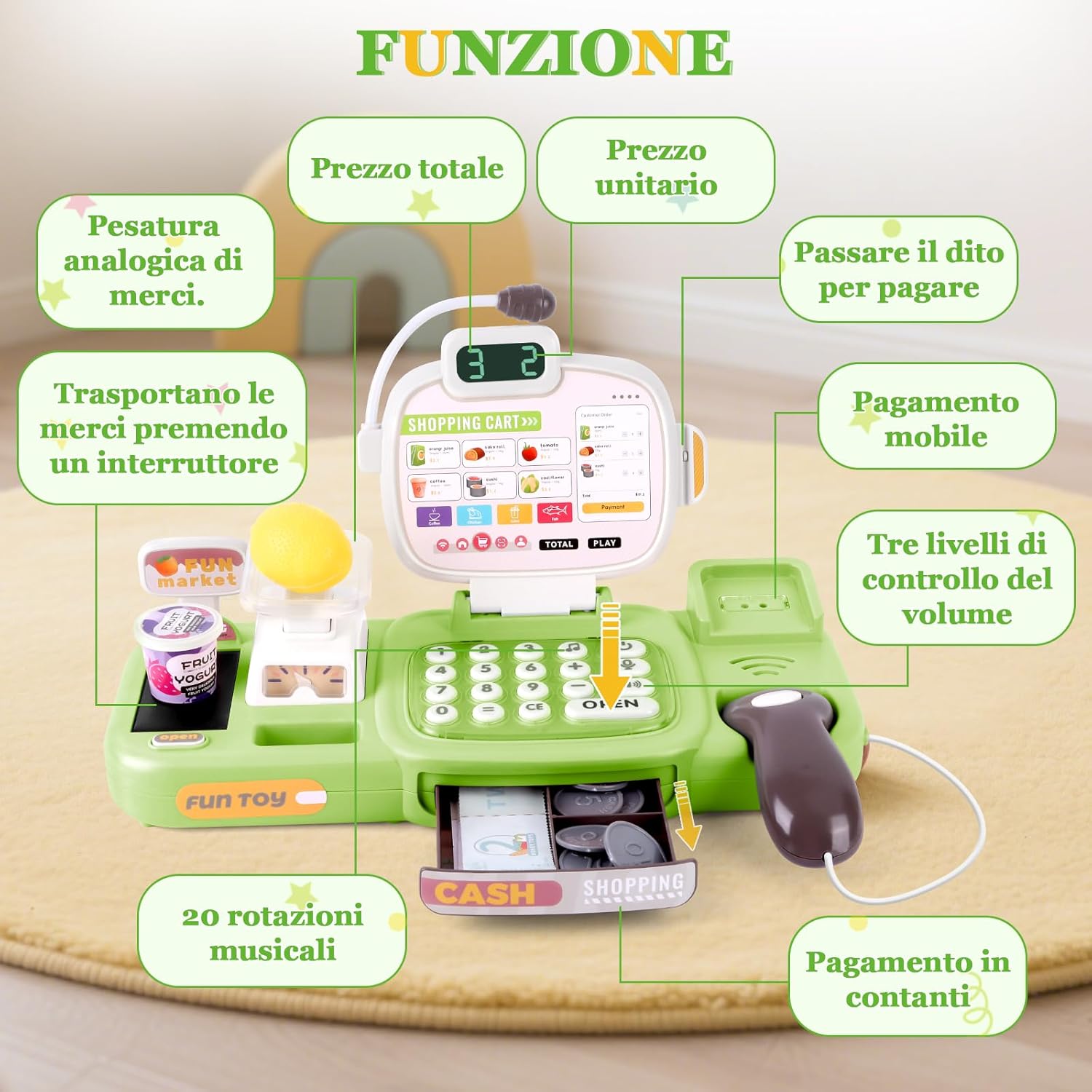 🛒 Divertimento realistico al supermercato: con scanner, microfono, bilancia e cassa, i bambini vivranno l'esperienza di un vero supermercato! Quando il bambino scansiona gli accessori del negozio con lo scanner, la cassa giocattolo per bambini calcola automaticamente il prezzo totale degli articoli. Con il microfono, i piccoli venditori possono chiamare i loro clienti, mentre 20 brani musicali rendono l'esperienza di acquisto ancora più piacevole. In questo modo, ogni acquisto diventa un emozionante gioco di ruolo pieno di fantasia e risate! 🧺75 accessori per negozio per bambini: questo registratore di cassa giocattolo per bambini include scanner, microfono, bilancia, nastri trasportatori, banconote e monete di vario taglio, una carta di credito, alimenti colorati (frutta, verdura, bevande e snack), un cestino della spesa giocattolo e un cartellone pubblicitario. I bambini possono fare acquisti con soldi finti nel negozio per bambini. Il cassa supermercato giocattolo del negozio offre un'esperienza di acquisto realistica al supermercato, rendendo i giochi di ruolo ancora più divertenti per i bambini! 📚Gioco educativo STEM completo:① Allenamento della memoria: ordinare monete e merci rafforza la concentrazione e la capacità di memorizzazione. ② Comprensione finanziaria: i bambini imparano in modo giocoso il valore del denaro e sviluppano la consapevolezza del risparmio. ③ Gioco di ruolo: nei panni del cliente o del cassiere, sperimentano in modo realistico le procedure di ordinazione e pagamento. ④ Apprendimento olistico: promuove il calcolo, la coordinazione e le capacità linguistiche: divertimento didattico versatile in un set di giocattoli da cassiera! 🧮 Imparare giocando: con il cassa bambini supermercato con scanner e calcolatrice, i bambini possono apprendere le nozioni matematiche di base, esercitarsi a contare i soldi e sviluppare le loro capacità comunicative. I bambini possono effettuare transazioni con i clienti in contanti e con carte di credito, acquisendo così conoscenze di base nella gestione finanziaria: un mix perfetto di divertimento e apprendimento! 🎁 Regalo sicuro e durevole per i bambini: Charmofun registratore cassa giocattolo per bambini dai 3 anni in su promuove la matematica e la comunicazione attraverso la simulazione del commercio. Realizzata in materiale di alta qualità e resistente, con bordi arrotondati e colori vivaci, è sicura per le mani dei più piccoli. La nostra gioco cassa supermercato bambini è un regalo ideale per compleanni, Natale, Pasqua o la festa dei bambini. Sorprendi il tuo bambino con questo giocattolo che porta gioia! Nota: quando si utilizza lo scanner, posizionare la porta di scansione vicino al codice a barre sull'articolo.