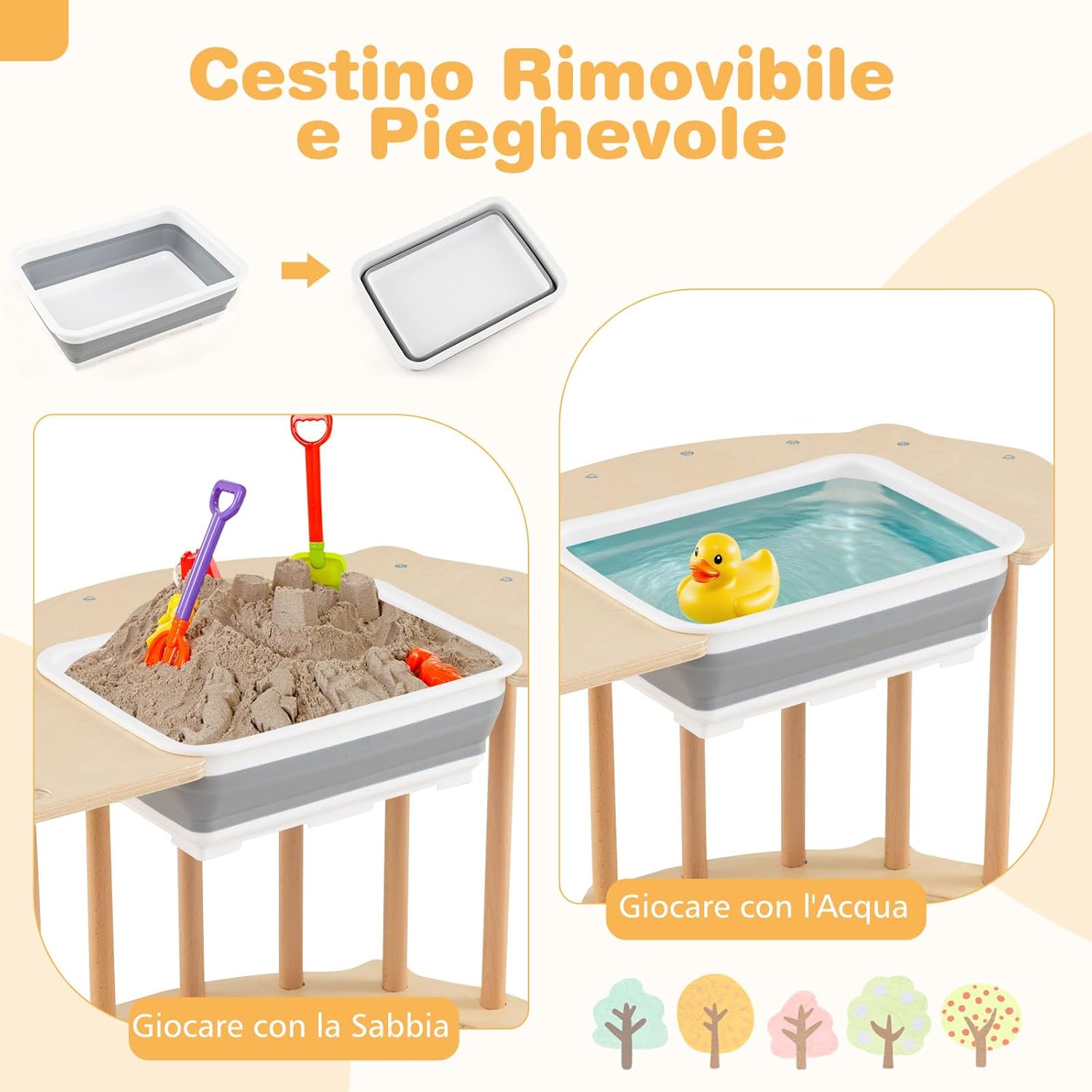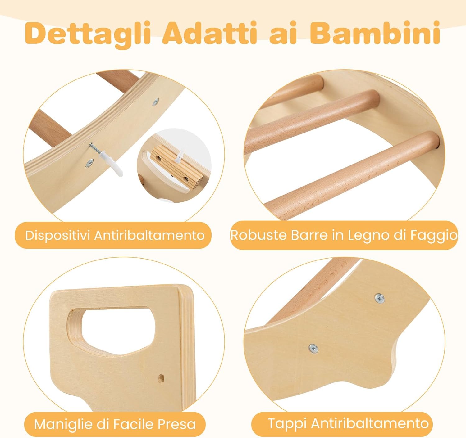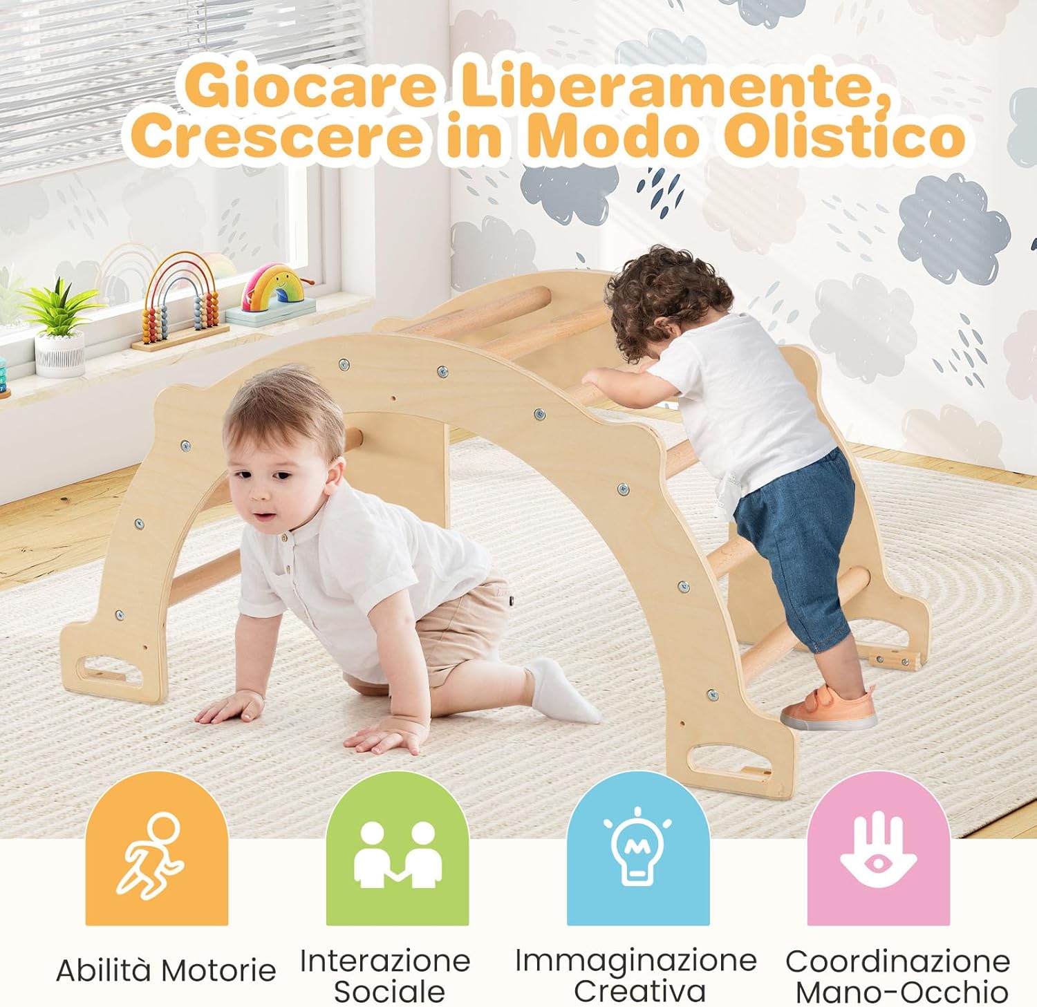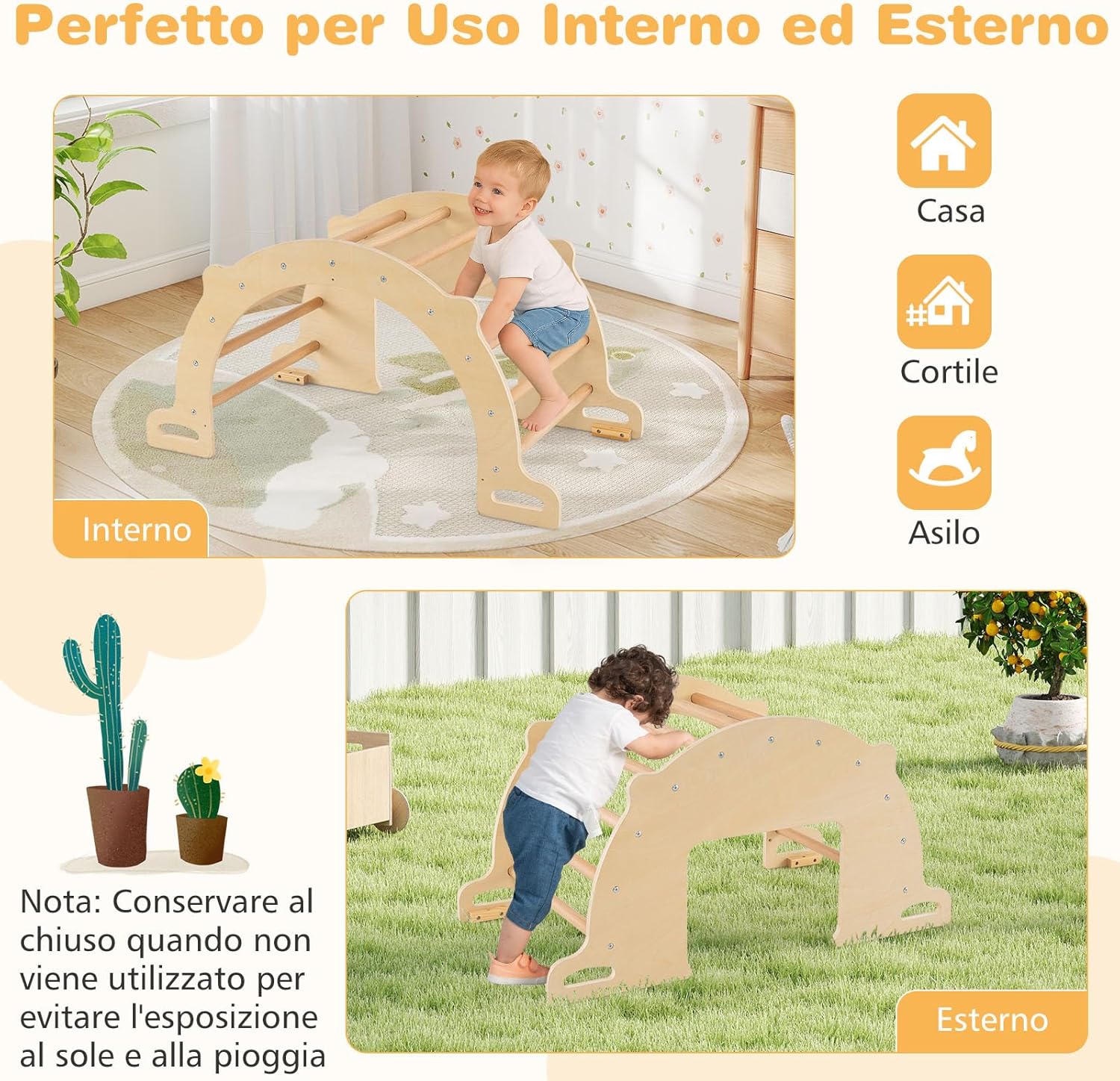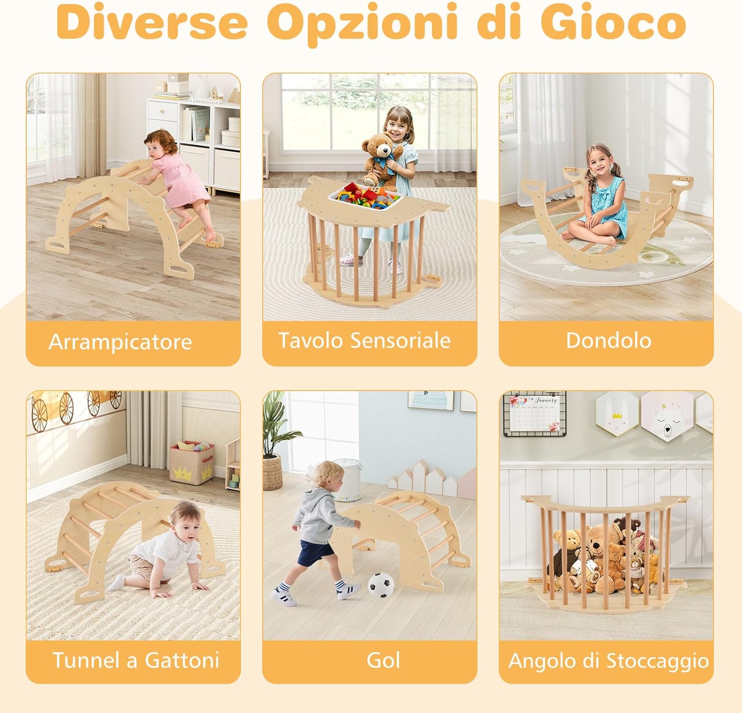★Varie Opzioni di Gioco★ Scopri un mondo di divertimento con la nostra palestra da arrampicata Montessori! Questo set di gioco tutto in uno può essere facilmente convertito in un arrampicatore, tavolo sensoriale, dondolo, tunnel per gattonare, area obiettivi e angolo di stoccaggio, ciascuno progettato per stimolare l'immaginazione dei bambini e tenerli impegnati in diverse attività. ★Bidone di Stoccaggio Rimovibile e Pieghevole★ Mantieni il divertimento e il disordine sotto controllo! Il nostro tavolo sensoriale in legno presenta un ampio bidone di stoccaggio rimovibile che permette ai bambini di giocare con sabbia/acqua o di riporre giocattoli e altri oggetti essenziali dopo il gioco. Quando non in uso, il bidone di stoccaggio può essere rapidamente piegato per risparmiare spazio. ★Costruito con la Sicurezza dei Bambini in Mente★ Prioritizziamo la sicurezza del tuo bambino con dettagli adatti ai piccoli, inclusi barre in legno di faggio robuste, maniglie facili da afferrare, e fermini anti-ribaltamento. Inoltre, i dispositivi anti-ribaltamento sono progettati per l'arco da arrampicata o il tavolo sensoriale, fornendo ai bambini un ambiente di gioco stabile e sicuro. ★Gioco Versatile Interno ed Esterno★ Pronto per ogni avventura, questo giocattolo oscillante in legno passa facilmente dal divertimento interno all'eccitazione esterna, perfetto per l'uso a casa, in giardino o in un asilo. Nota: Conservare all'interno quando non in uso per evitare l'esposizione al sole e alla pioggia. ★Gioca Liberamente, Cresci in Modo Olistico★ Incoraggia le abilità di sviluppo essenziali con questo arrampicatore ad arco Montessori. Non si tratta solo di divertimento; migliora anche le abilità motorie, la coordinazione occhio-mano, l'interazione sociale e l'immaginazione creativa, rendendolo un regalo ponderato per bambini sopra i 3 anni.