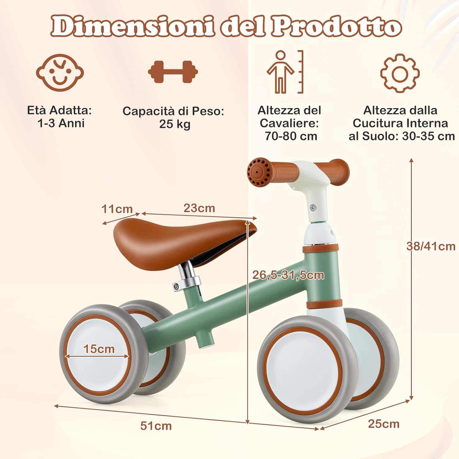 Design Regolabile in Altezza: Con un'altezza della maniglia regolabile di 38/41 cm e un'altezza del sedile di 26,5-31,5 cm, la bicicletta si adatta all'altezza variabile del bambino. Questa bicicletta ben bilanciata assicura una guida confortevole in ogni fase dello sviluppo. Morbida Imbottitura e Telaio Robusto: La morbida imbottitura del sedile assicura il massimo comfort durante le lunghe pedalate, mentre il robusto telaio resiste all'uso quotidiano. Questa bici da equilibrio è una scelta eccellente per i primi tentativi di guida del bambino. Piacere di Guida Sicuro: Questa bicicletta a 4 ruote è dotata di un meccanismo di sterzo a 80° che ne impedisce il ribaltamento. Inoltre, il manubrio antiscivolo fornisce un migliore controllo per mantenere il vostro piccolo pilota sicuro in ogni avventura. Adatta a Diverse Superfici Stradali: Dotata di ruote in schiuma EVA, questa prima balance bike offre una guida fluida e silenziosa su diverse superfici. Dai pavimenti in legno in casa alle strade asfaltate e ai sentieri in pietra all'aperto, il bambino potrà divertirsi all'infinito. Regalo Ideale: Questa bici è perfetta per i bambini da 1 a 3 anni e aiuta a sviluppare l'equilibrio, le capacità motorie e la fiducia in se stessi. Che si tratti di un regalo di compleanno o di una sorpresa per le vacanze, questa bici da equilibrio è il regalo ideale per ispirare l'amore del bambino per il ciclismo.