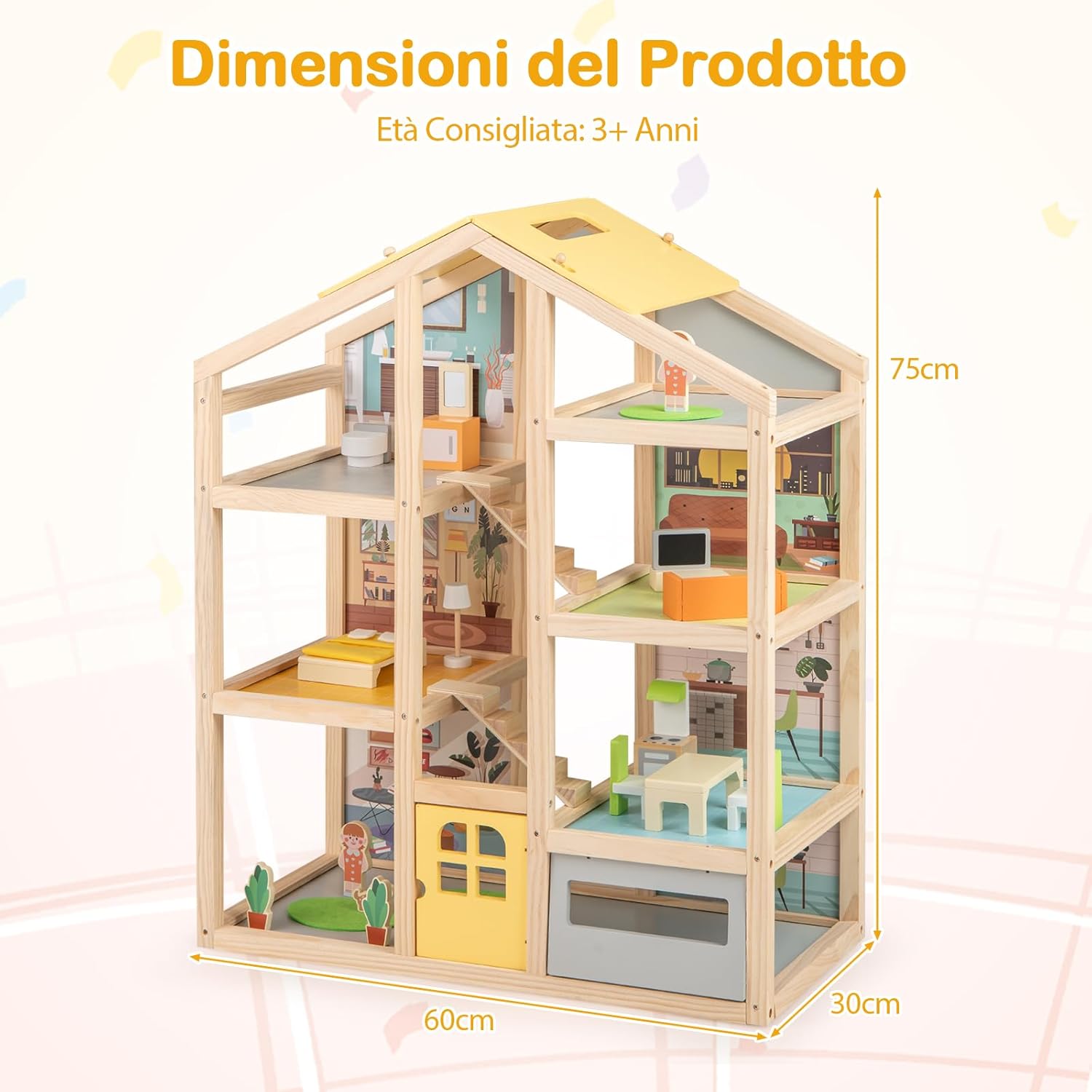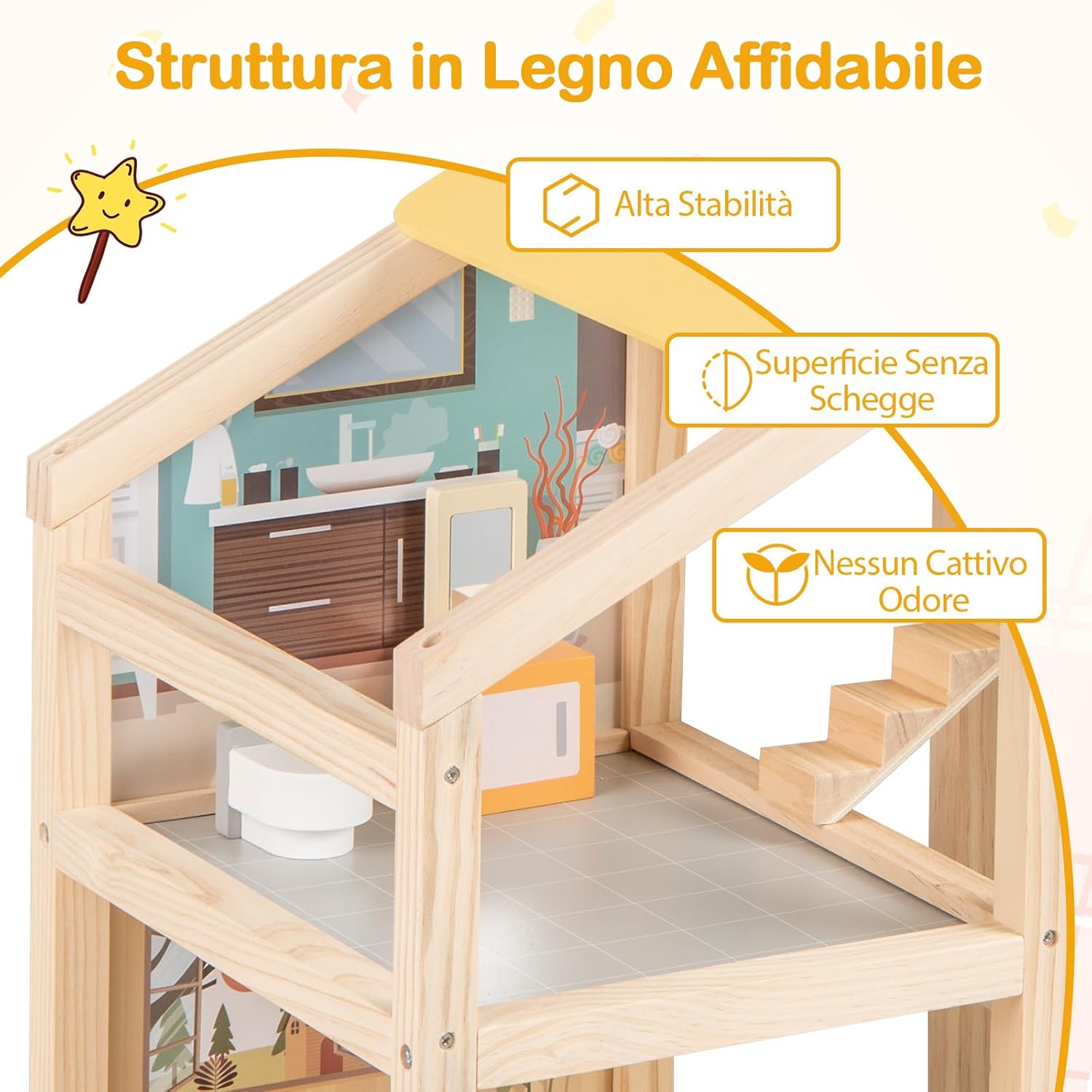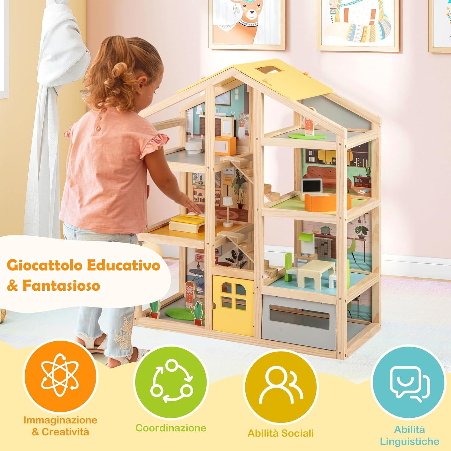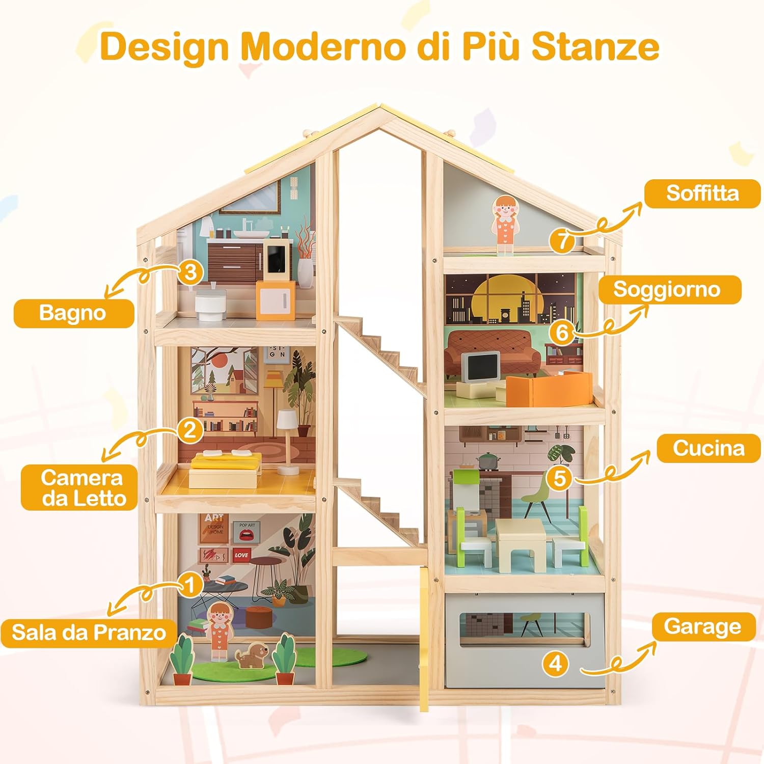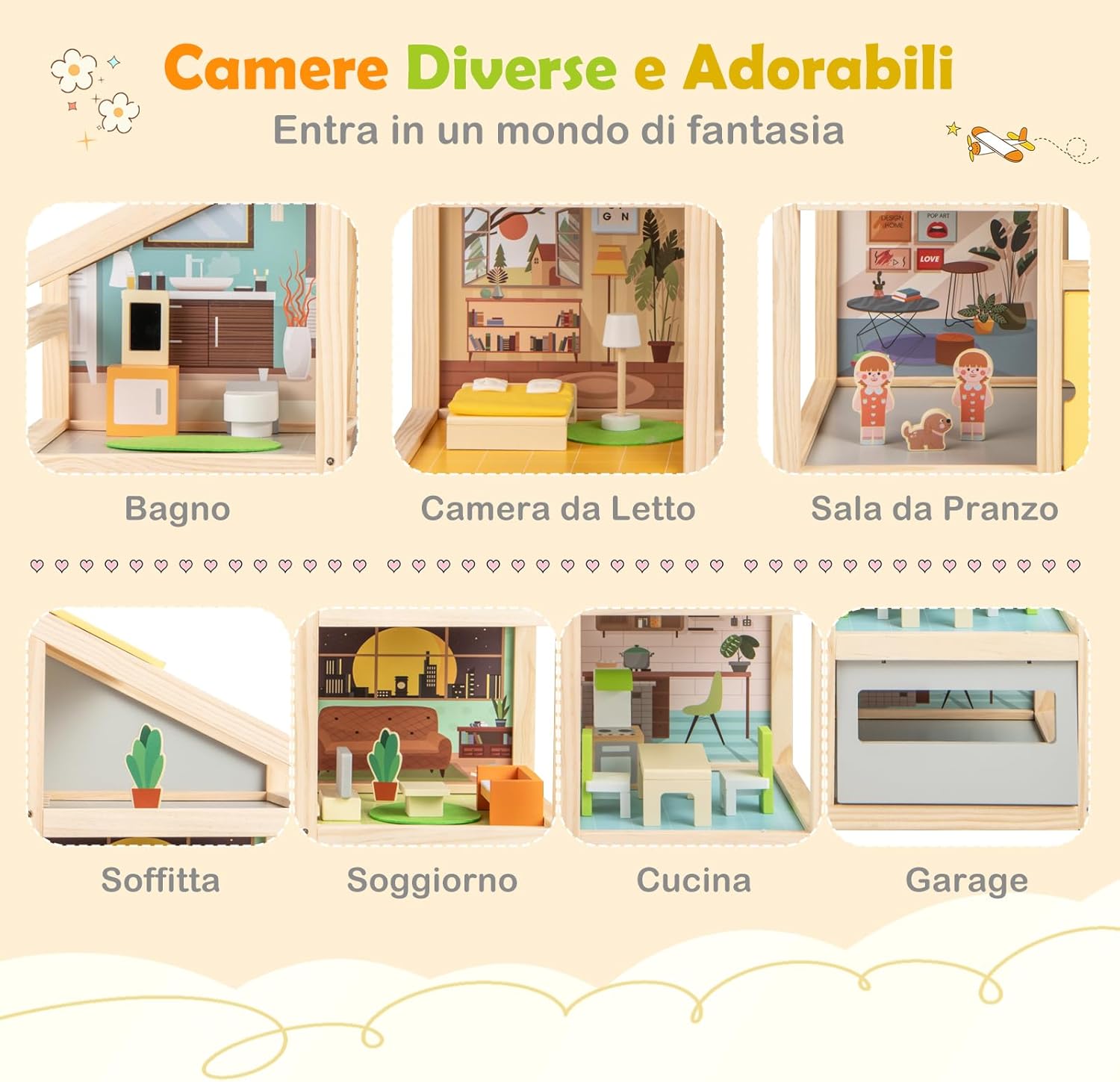 ★Area di Giochi a Più Livelli★ La casa delle bambole per bambini è composta da sette aree funzionali: mansarda, camera da letto, bagno, cucina, sala da pranzo, soggiorno e garage. La parete di ogni area è decorata con disegni delicati e carini, che rendono facile per i bambini disporre gli accessori giocattolo in ogni area. ★Accessori Ricchi★ La casa delle bambole non solo include una varietà di set di mobili, ma offre anche accessori adorabili come piccole figure e cucciolo. Le scale mobili e la porta apribile coinvolgono maggiormente i bambini nel gioco, permettendo loro di partecipare attivamente alla costruzione, organizzazione e gioco. ★Struttura Robusta★ La casa delle bambole per bambini presenta una robusta struttura in legno, garantendo la stabilità dell'intera costruzione e prevenendo il crollo. Inoltre, la superficie della struttura è liscia senza spigoli vivi, evitando graffi alle dita dei bambini e aumentando la sicurezza del gioco. ★Struttura Stabile★ Viene fornito con un manuale di istruzioni, in modo che i genitori possano assemblare e decorare la stanza con i loro bambini. Questa interazione genitore-bambino non solo aumenta il legame, ma aiuta anche i bambini a migliorare le loro abilità sociali e stimola la loro creatività e immaginazione. ★Regalo Perfetto★ Come regalo per compleanni o festività, la casa delle bambole per bambini è un'ottima scelta, particolarmente adatta a bambini di età superiore ai tre anni. Oltre all'uso domestico, la casa delle bambole è ideale anche per l'uso in asili, dove i bambini possono crescere felicemente giocando.