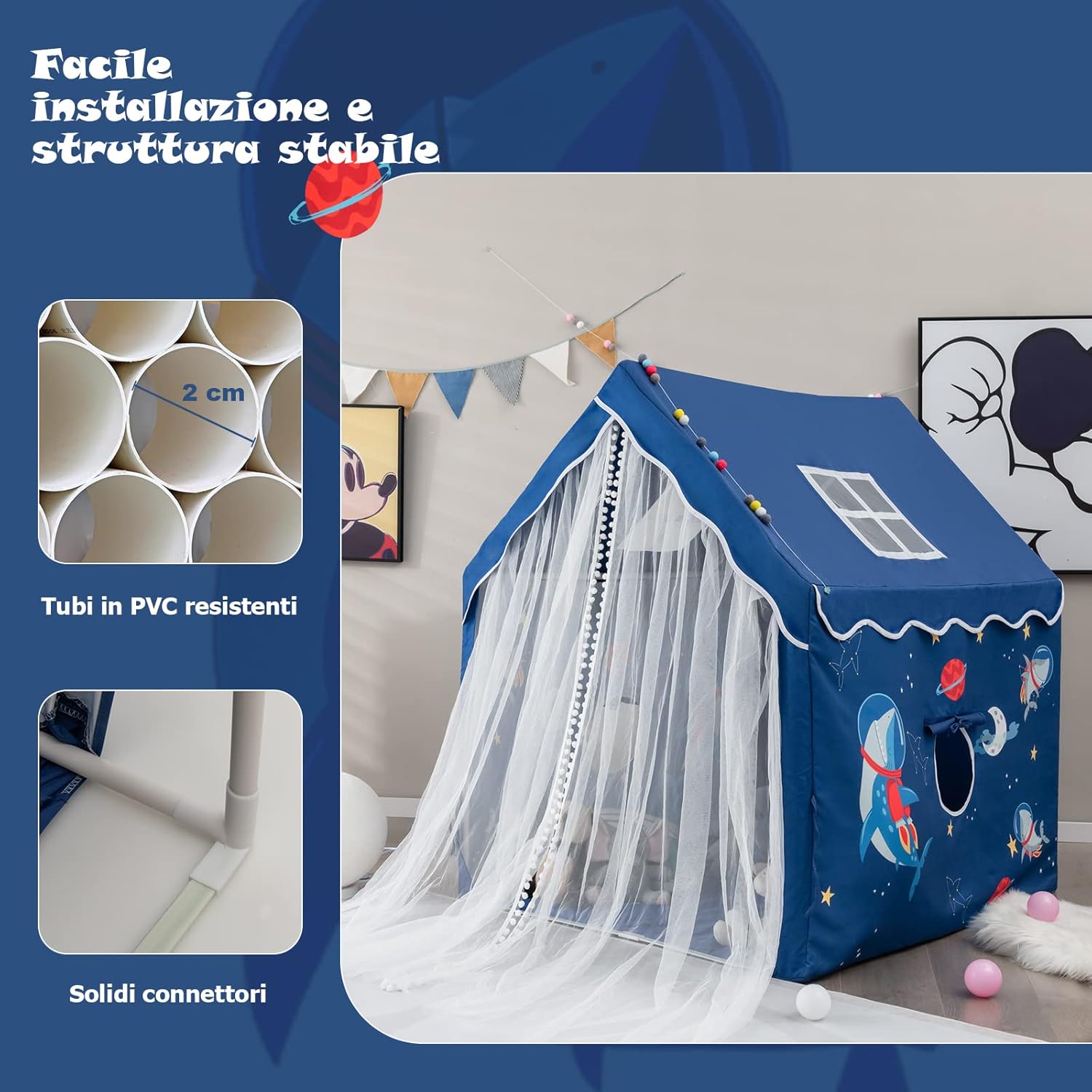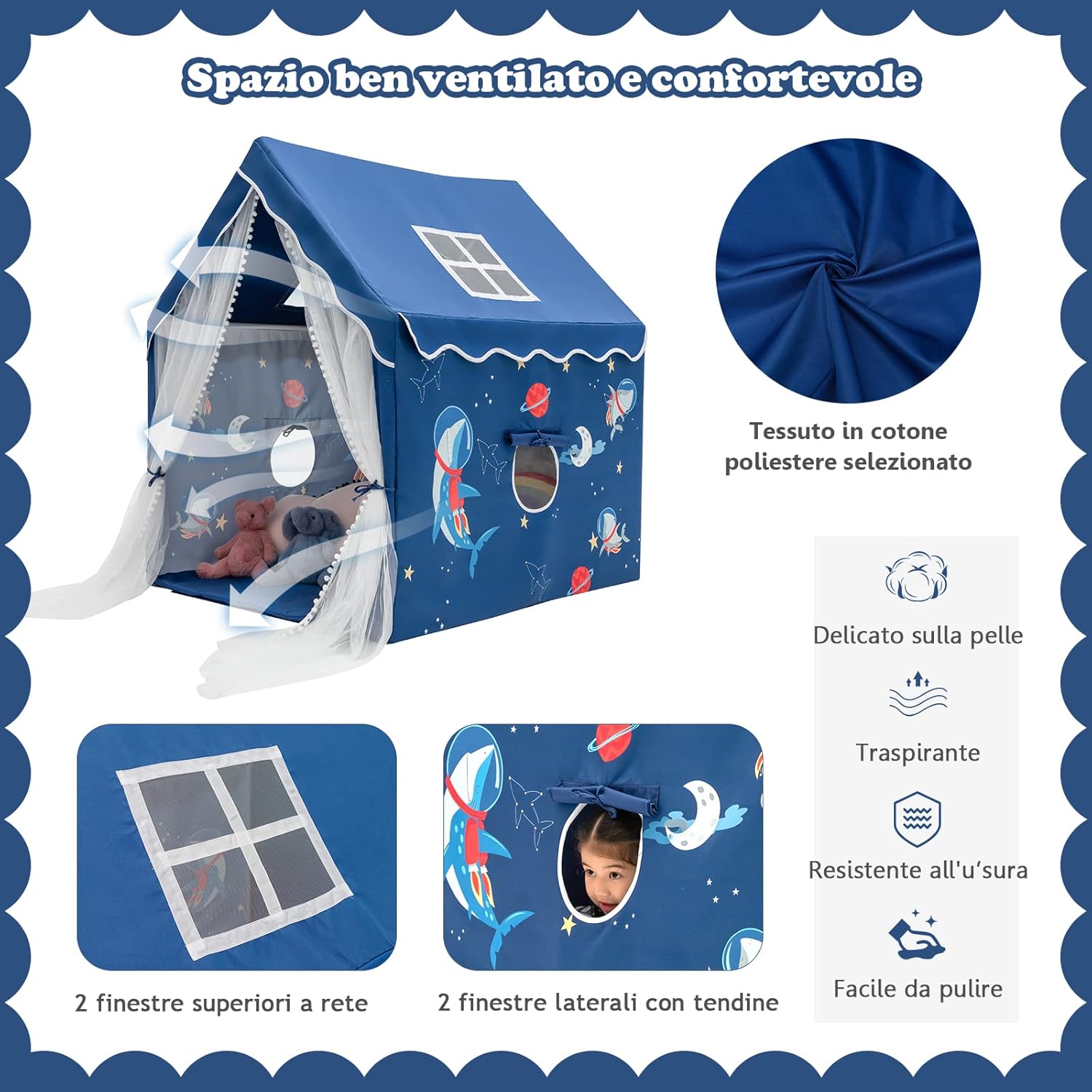 🏠★Piccolo Mondo dei Bambini★ La tenda per bambini con il suo aspetto carino e affascinante piacerà a tutti i bambini. È davvero il perfetto regalo di Natale o di compleanno. Ogni bambino desidera ardentemente il proprio spazio in cui nascondere i propri piccoli segreti. Questa tenda per bambini soddisferà il loro desiderio. 🏠★Finestra e Tappetino Lavabile★ Due finestre garantiscono una buona ventilazione all'interno di questa tenda per bambini. La tenda a rete può essere appesa su entrambi i lati per un facile accesso per il tuo bambino e può essere abbassata quando necessario per prevenire le punture di zanzara. Il morbido tappetino è lavabile, il che significa che rimane sempre pulito. 🏠★Struttura in tubo per un Migliore Supporto★ Questa tenda per bambini ha una struttura in tubo. È quindi molto forte e stabile. Contrariamente alle tende leggere convenzionali, questa tenda per bambini è estremamente stabile. I tuoi bambini possono giocare in sicurezza all'interno. 🏠★Centro Attività Multifunzionale★ Questa tenda per bambini è adatta a molti luoghi. Parchi giochi, asili nido o la propria casa sono tutte possibilità. Il tuo bambino può giocare, imparare e dormire in questa tenda per bambini o giocare insieme ai suoi amici. 🏠★Ampio Spazio per Più Amici e Bambole★ Questa tenda per bambini misura 105 x 120 x 140 cm, abbastanza grande per più bambini contemporaneamente. Naturalmente, c'è spazio anche per le tue bambole preferite o altri giocattoli.