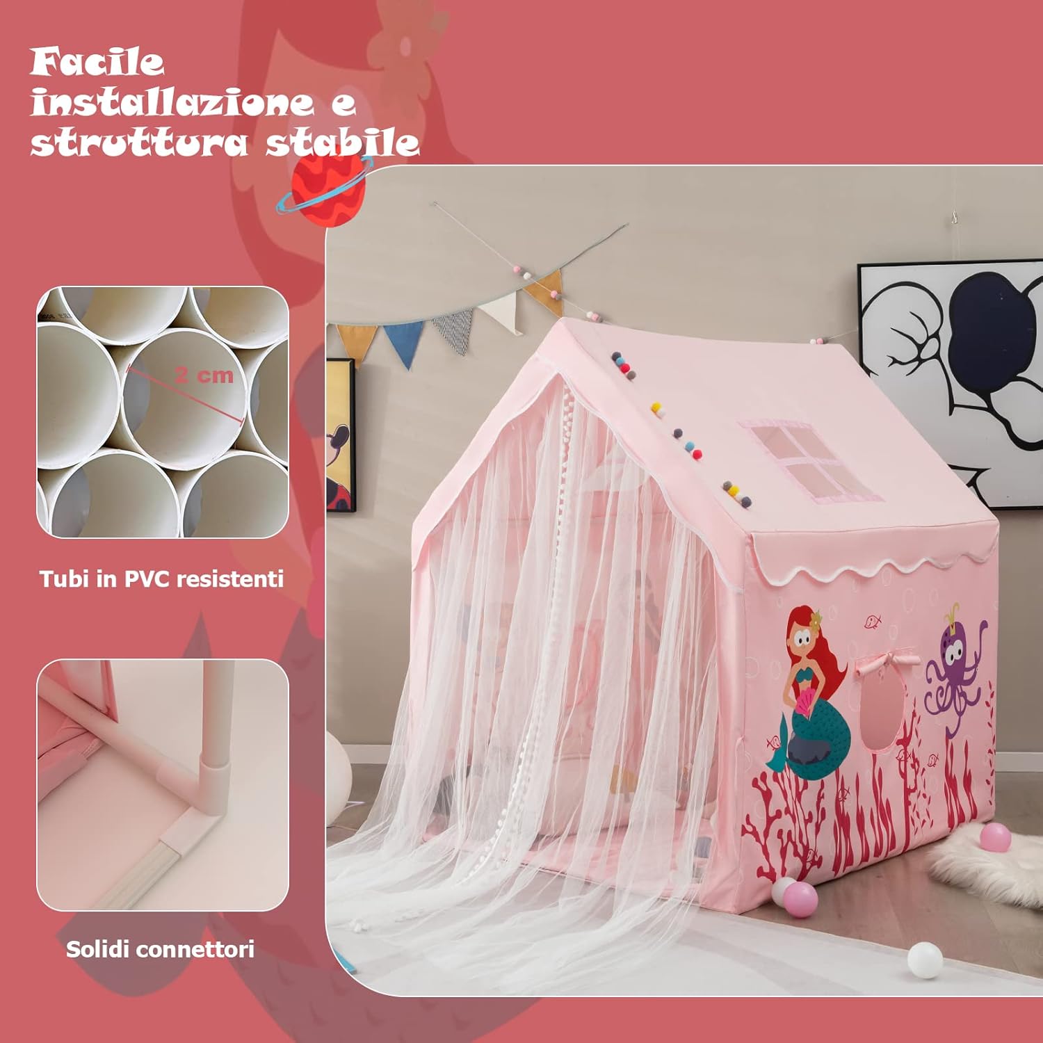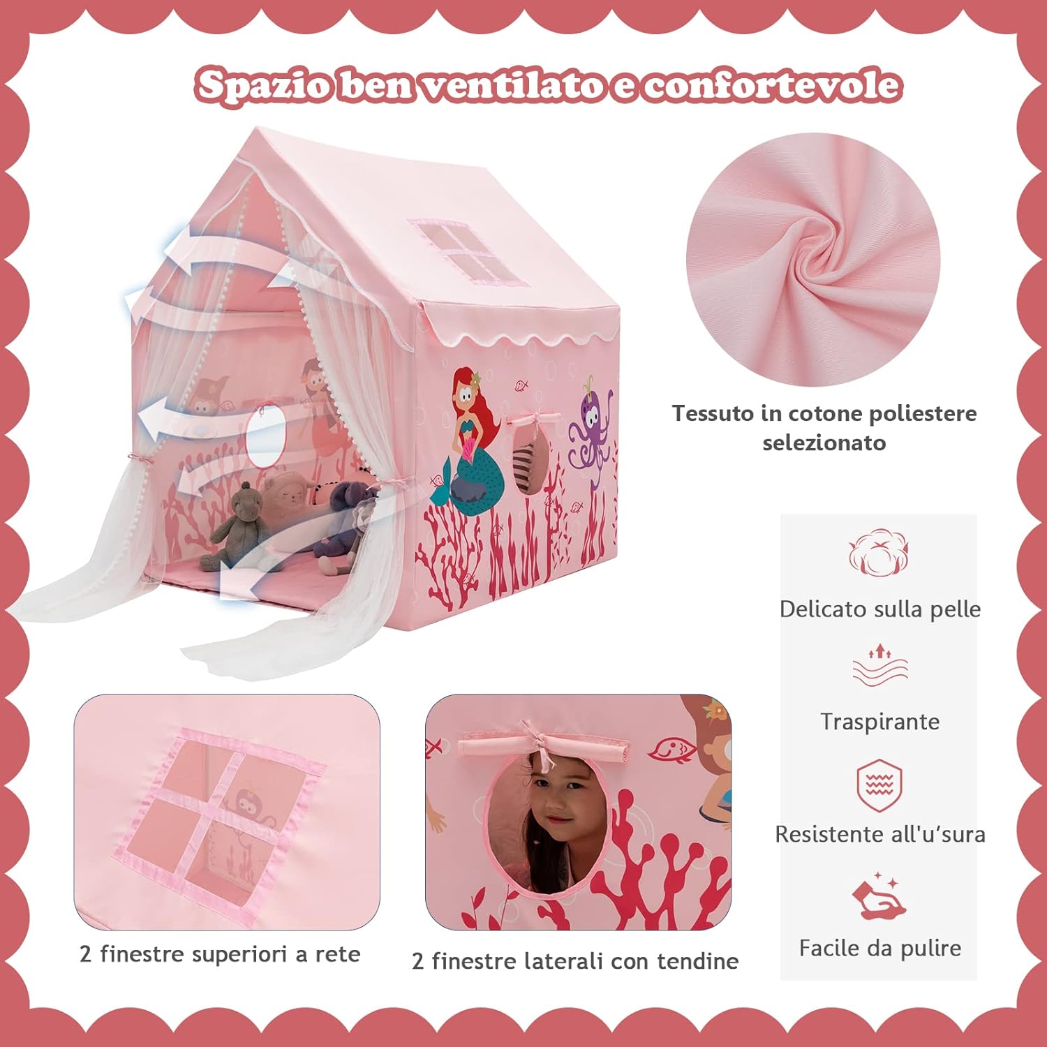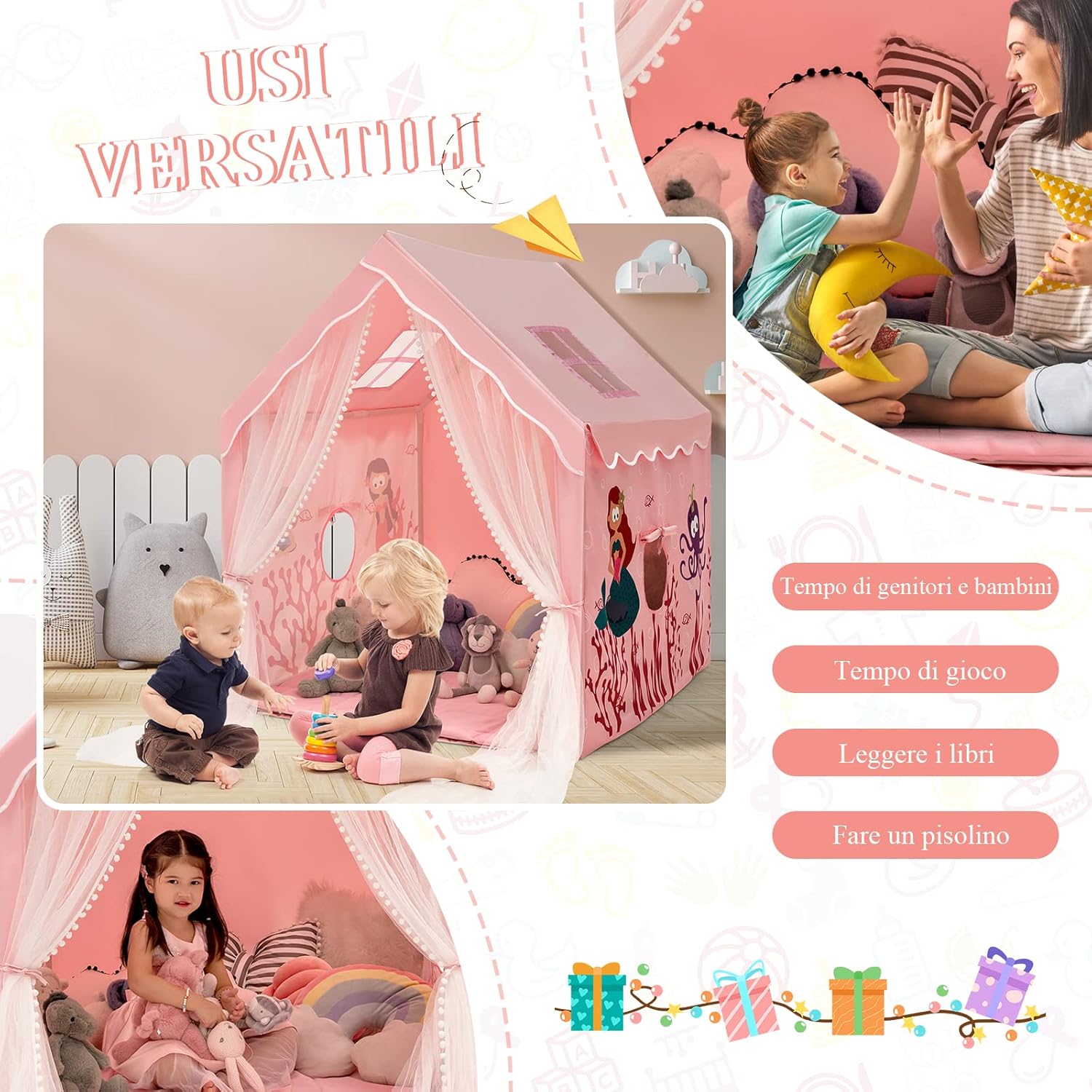 🏠★Piccolo Mondo dei Bambini★ La tenda per bambini con il suo aspetto carino e affascinante piacerà a tutti i bambini. È davvero il perfetto regalo di Natale o di compleanno. Ogni bambino desidera ardentemente il proprio spazio in cui nascondere i propri piccoli segreti. Questa tenda per bambini soddisferà il loro desiderio. 🏠★Finestra e Tappetino Lavabile★ Due finestre garantiscono una buona ventilazione all'interno di questa tenda per bambini. La tenda a rete può essere appesa su entrambi i lati per un facile accesso per il tuo bambino e può essere abbassata quando necessario per prevenire le punture di zanzara. Il morbido tappetino è lavabile, il che significa che rimane sempre pulito. 🏠★Struttura in tubo per un Migliore Supporto★ Questa tenda per bambini ha una struttura in tubo. È quindi molto forte e stabile. Contrariamente alle tende leggere convenzionali, questa tenda per bambini è estremamente stabile. I tuoi bambini possono giocare in sicurezza all'interno. 🏠★Centro Attività Multifunzionale★ Questa tenda per bambini è adatta a molti luoghi. Parchi giochi, asili nido o la propria casa sono tutte possibilità. Il tuo bambino può giocare, imparare e dormire in questa tenda per bambini o giocare insieme ai suoi amici. 🏠★Ampio Spazio per Più Amici e Bambole★ Questa tenda per bambini misura 105 x 120 x 140 cm, abbastanza grande per più bambini contemporaneamente. Naturalmente, c'è spazio anche per le tue bambole preferite o altri giocattoli.