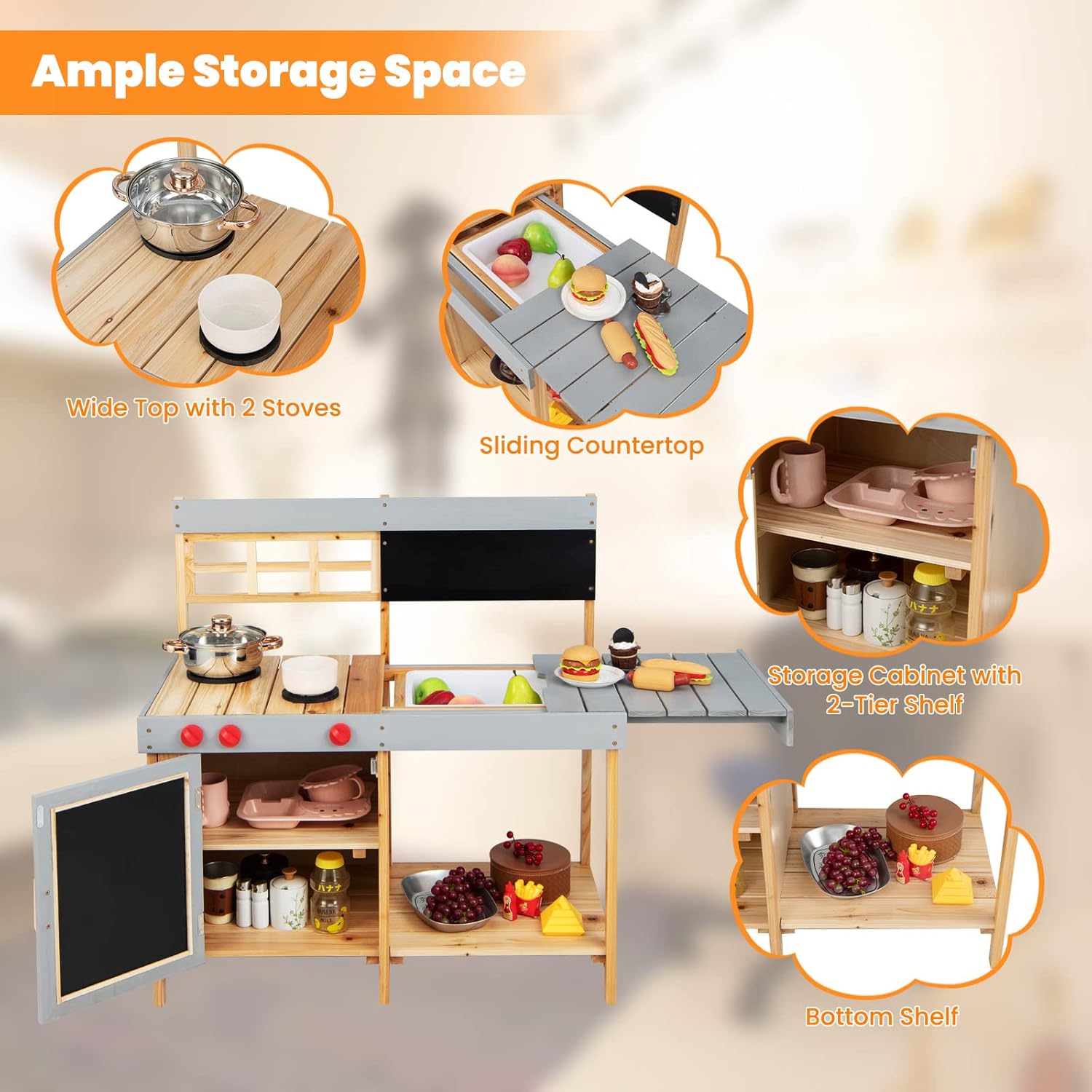 ★Tanto spazio per giocare★ Questa cucina in fango da esterno ha un'ampia superficie di lavoro con due piani cottura sul lato sinistro e tre pulsanti nella parte anteriore che emettono un suono. Il coperchio scorrevole a destra si apre così i bambini possono mescolare il fango con la scatola di plastica all'interno. ★Tanto spazio per riporre gli oggetti★ il mobiletto con 2 ripiani offre spazio organizzato per riporre gli oggetti dei bambini. Inoltre, i bambini possono anche riporre i loro giocattoli sugli scaffali aperti in modo da potervi accedere facilmente. Sugli scaffali si possono appendere gli utensili e la lavagna permette ai bambini di scrivere liberamente. ★Sicuro e durevole★ questo set da gioco da cucina da giardino è realizzato in legno di abete e compensato di alta qualità, stabile e durevole. ★Dettagli attenti★ la superficie liscia e senza sbavature evita urti o graffi accidentali. Il laminato a doghe garantisce una buona circolazione dell'aria. Le gambe robuste aiutano a tenere bene il giocattolo da cucina. ★Crescere attraverso il gioco★ questa cucina di fango per bambini non solo farà divertire molto il tuo bambino, ma eserciterà anche la sua immaginazione e abilità artigianali, promuoverà la coordinazione occhio-mano e molto altro ancora.
