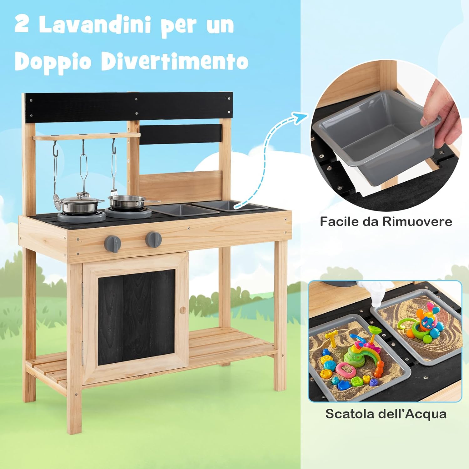 ★Numerosi Accessori★ Il nostro set di giocattolo da cucina per bambini offre numerosi accessori, tra cui 2 lavandini rimovibili, 3 ganci di sospensione, 1 pentola, 1 padella e 3 utensili in acciaio inossidabile, portando così maggiore divertimento ai bambini. ★Ampio Spazio di Stoccaggio★ Questo giocattolo da cucina è progettato con 1 ampia superficie di cottura, 1 scaffale superiore per lo stoccaggio, 1 armadietto a una porta e 1 scaffale aperto inferiore, offrendo abbondante spazio di stoccaggio per ingredienti, piatti semipronti e utensili da cucina. ★Costruzione in Legno Massiccio★ Questo gioco di imitazione da cucina è realizzato in legno di abete selezionato per garantire una buona resistenza a crepe e deformazioni. I robusti supporti in legno offrono un utilizzo sicuro e le venature naturali del legno aggiungono un tocco di eleganza. ★Esperienza Culinaria Realistica★ Il nostro gioco di ruolo da cucina per bambini adotta un aspetto autentico di una cucina reale. Le lavagne creative sono ideali per visualizzare ricette e il menu del giorno, e i 2 lavandini rimovibili permettono ai bambini di giocare con acqua o sabbia. ★Regalo Educativo e Divertente★ Il nostro set di giocattolo da cucina consente a più bambini di giocare insieme. È adatto per bambini di oltre 3 anni, aiutando a coltivare la capacità pratica, migliorare la risoluzione di problemi, sviluppare il senso del tempo e promuovere le abilità sociali.