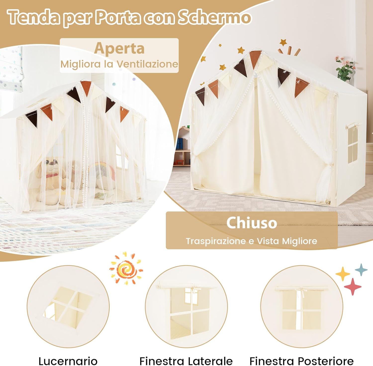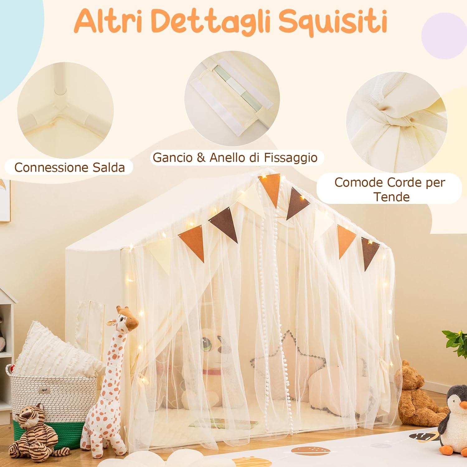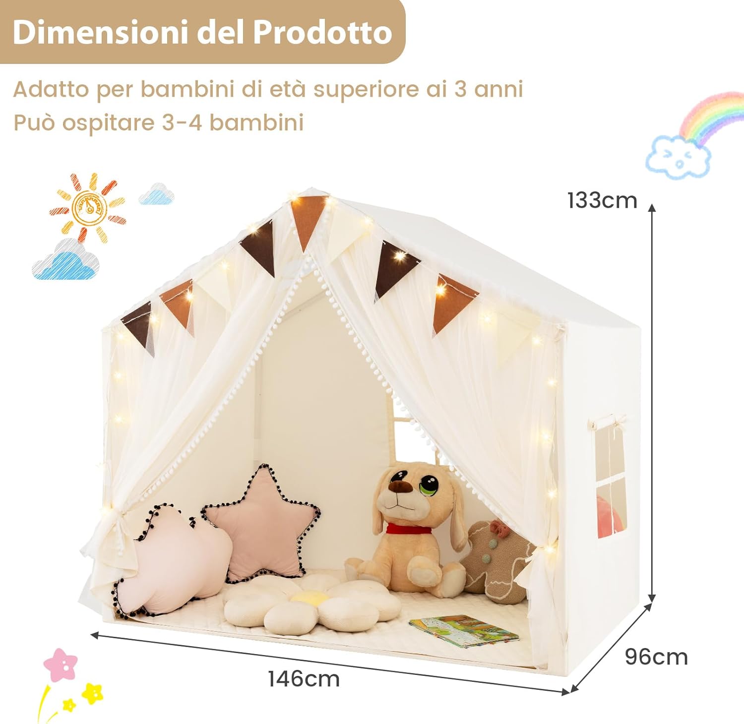 ★Area di Gioco Ampia★ Queata tenda da gioco misura 146 cm (L) x 96 cm (P) x 133 cm (A) e può ospitare 2- 3 bambini. Anche gli adulti possono partecipare il divertimento e condividere gioia con i piccoli. ★Materiali di Qualità★ Dotato di un tappeto in cotone morbido, la tenda crea uno spazio versatile in cui i tuoi bambini possono giocare, leggere e fare un pisolino. Inoltre, il tappeto è lavabile in lavatrice. ★Design Accattivante★ Le luci a stella forniscono una illuminazione soffusa, rendendo più accogliente la tenda nel buio. (richiedono 2 batterie AA (non incluse)). La decorazione a bandierine porta un tocco di allegria nella tenda giocattolo. ★Tenda Doppio Strato★ Le tende a rete sottili lasciano filtrare la luce del giorno. La finestra è progettata per favorire la circolazione dell'aria. ★Regalo Speciale★ I genitori possono invitare i bambini a partecipare all'allestimento della tenda per migliorare le loro abilità pratiche. Sarà un regalo migliore per il compleanno, il Natale o la Giornata dei bambini.