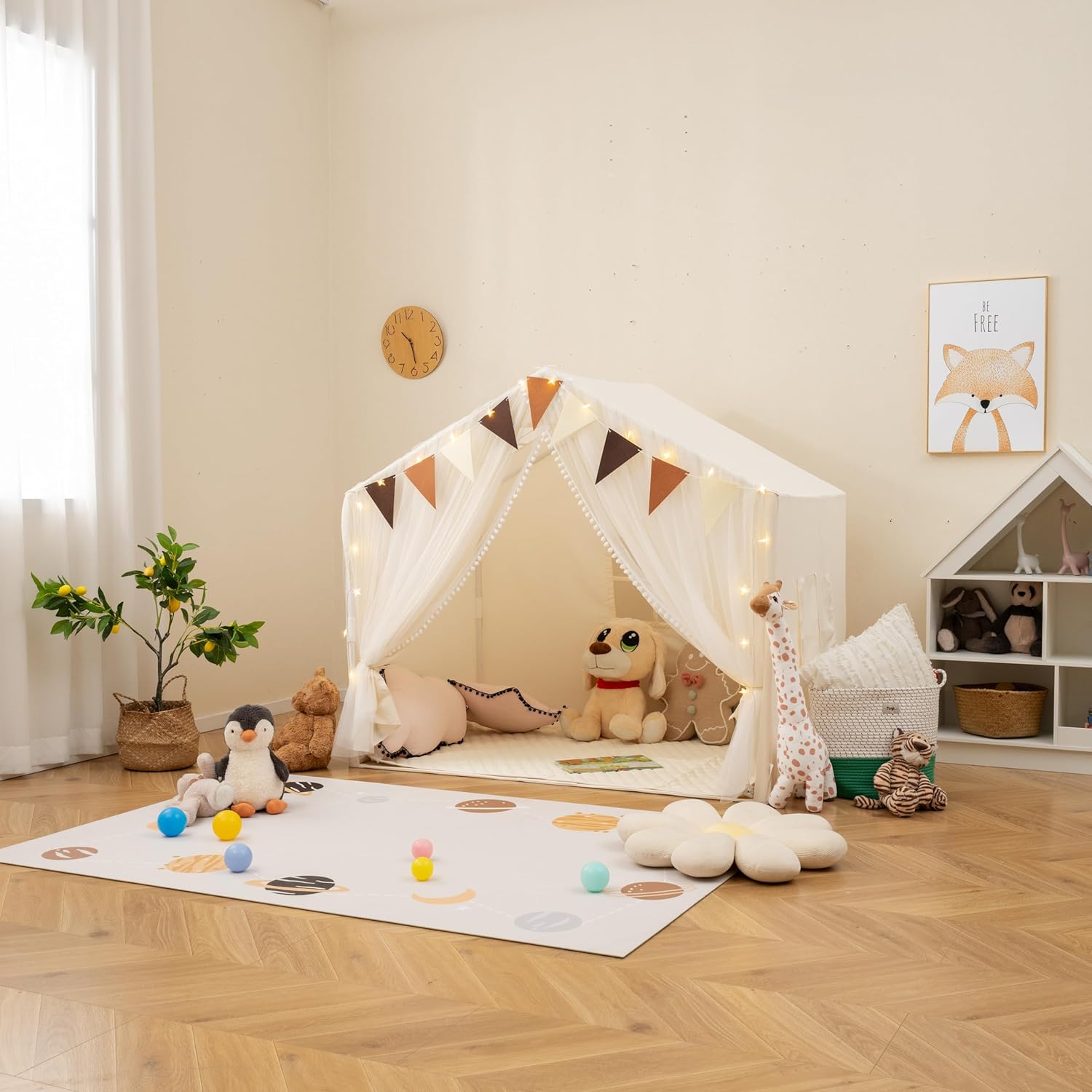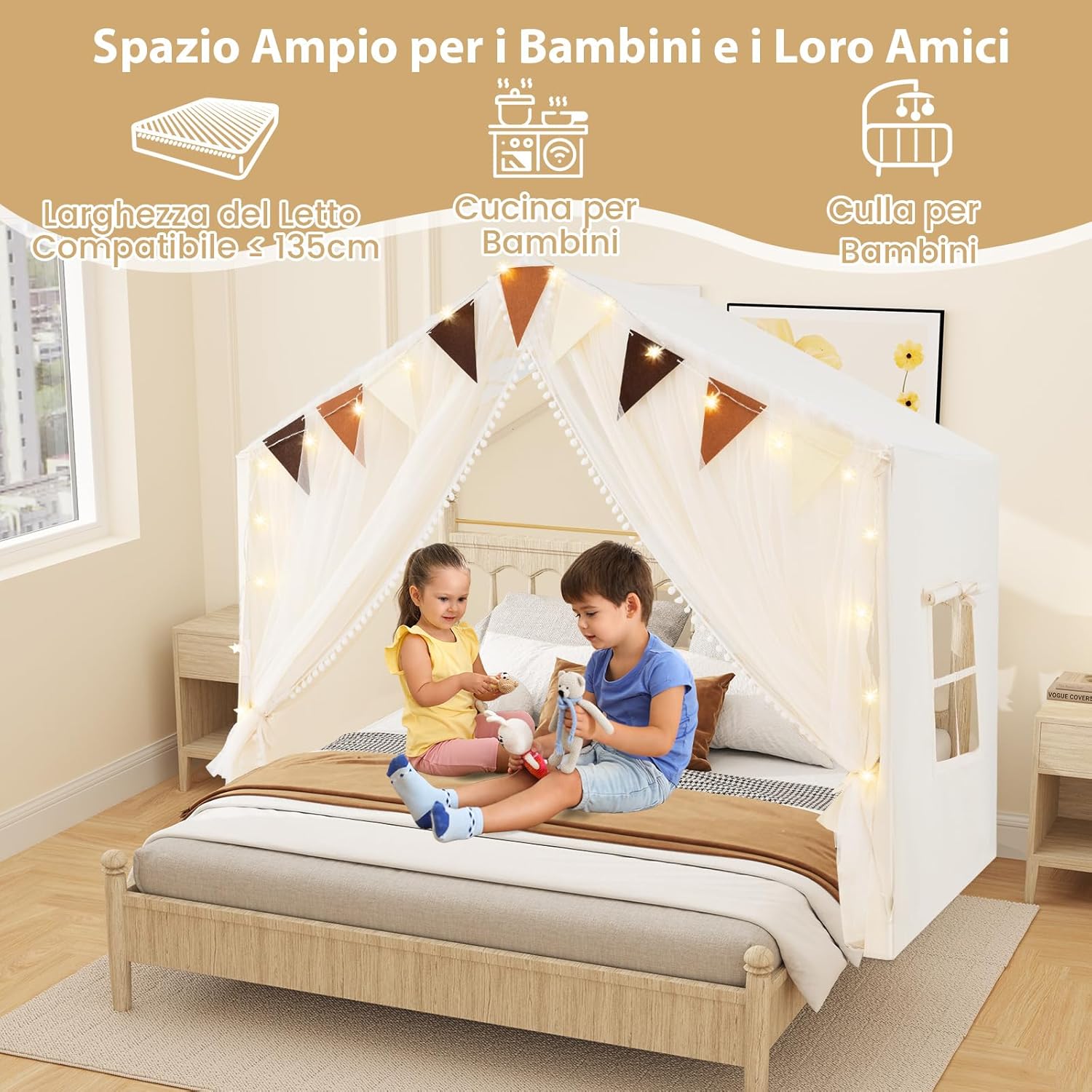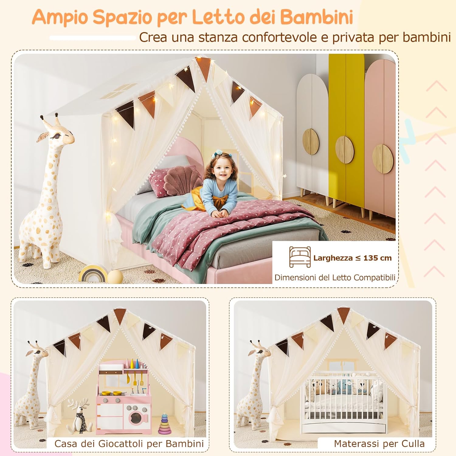 ★Area di Gioco Ampia★ Queata tenda da gioco misura 146 cm (L) x 96 cm (P) x 133 cm (A) e può ospitare 2- 3 bambini. Anche gli adulti possono partecipare il divertimento e condividere gioia con i piccoli. ★Materiali di Qualità★ Dotato di un tappeto in cotone morbido, la tenda crea uno spazio versatile in cui i tuoi bambini possono giocare, leggere e fare un pisolino. Inoltre, il tappeto è lavabile in lavatrice. ★Design Accattivante★ Le luci a stella forniscono una illuminazione soffusa, rendendo più accogliente la tenda nel buio. (richiedono 2 batterie AA (non incluse)). La decorazione a bandierine porta un tocco di allegria nella tenda giocattolo. ★Tenda Doppio Strato★ Le tende a rete sottili lasciano filtrare la luce del giorno. La finestra è progettata per favorire la circolazione dell'aria. ★Regalo Speciale★ I genitori possono invitare i bambini a partecipare all'allestimento della tenda per migliorare le loro abilità pratiche. Sarà un regalo migliore per il compleanno, il Natale o la Giornata dei bambini.