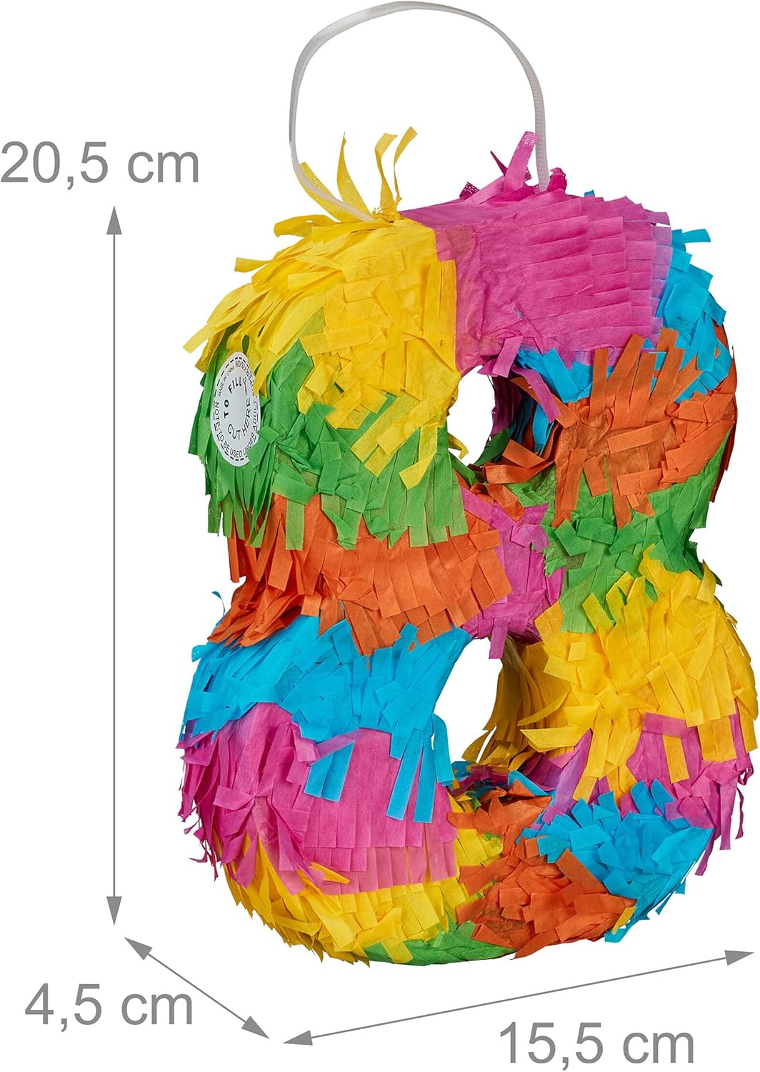 Pinata con numeri: accessorio ideale per il prossimo compleanno - Per intrattenere bambini e adulti Design: Mini pignatta nei colori dell'arcobaleno - Numero 8 per il compleanno di un bambino, ecc. Senza riempimento: Pinata decorativa da riempire - Ideale per dolci, giocattoli o coriandoli Gioco di società: Colpisci la pignatta con gli occhi bendati finché non si apre Informazioni: Dimensioni della pignatta: A x L x P: ca. 20,5 x 15,5 x 4,5 cm - Carta e cartone