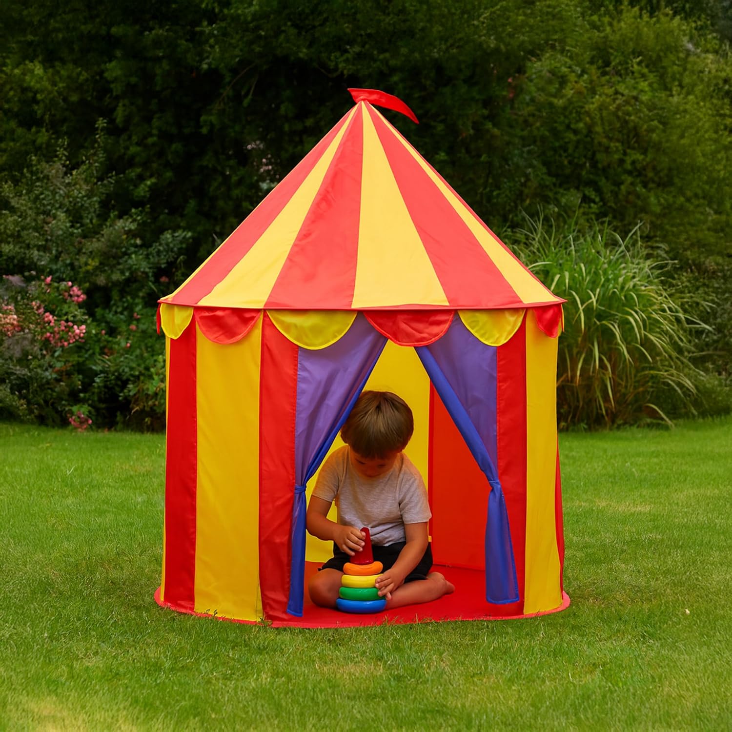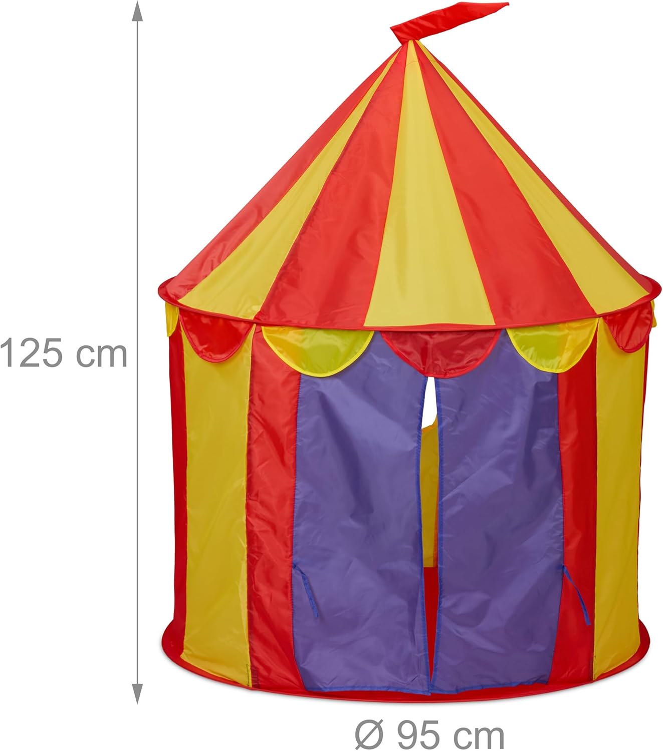 Divertimento assivurato: tenda circo multicolore per bambini – tendine d’entrata – HxD ca. 125x95 cm Montaggio rapido: castello giocattolo che si monta in pochi minuti - facile da smontare e metter via Da interno: tenda leggera per bambine e bambini, gioco per la cameretta o la stanza dei giochi Adatta all'uso esterno: tenda leggera con pali in fibra di vetro, ideale in giardino con bel tempo Colorato: tendone da circo variopinto con bandiera, finestre e design per un'esperienza autentica