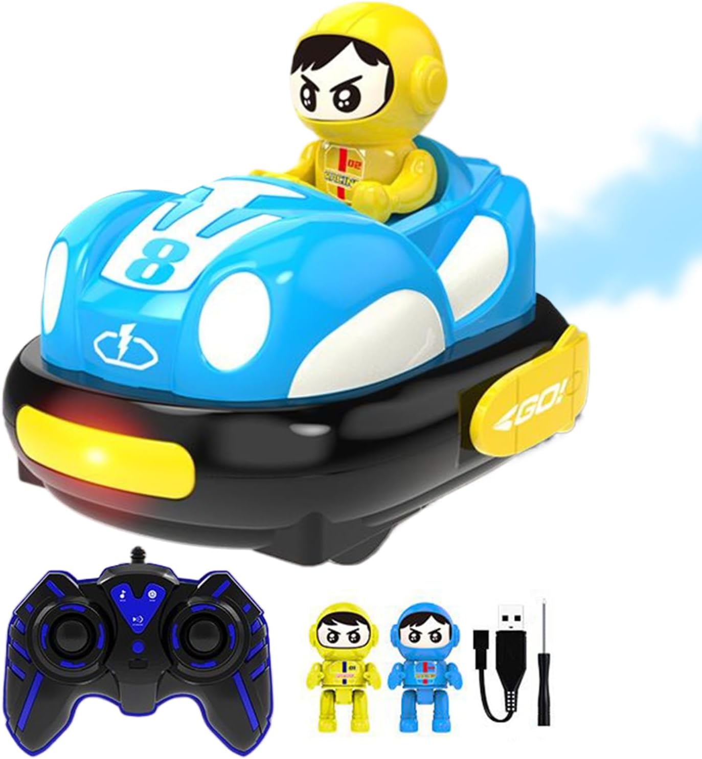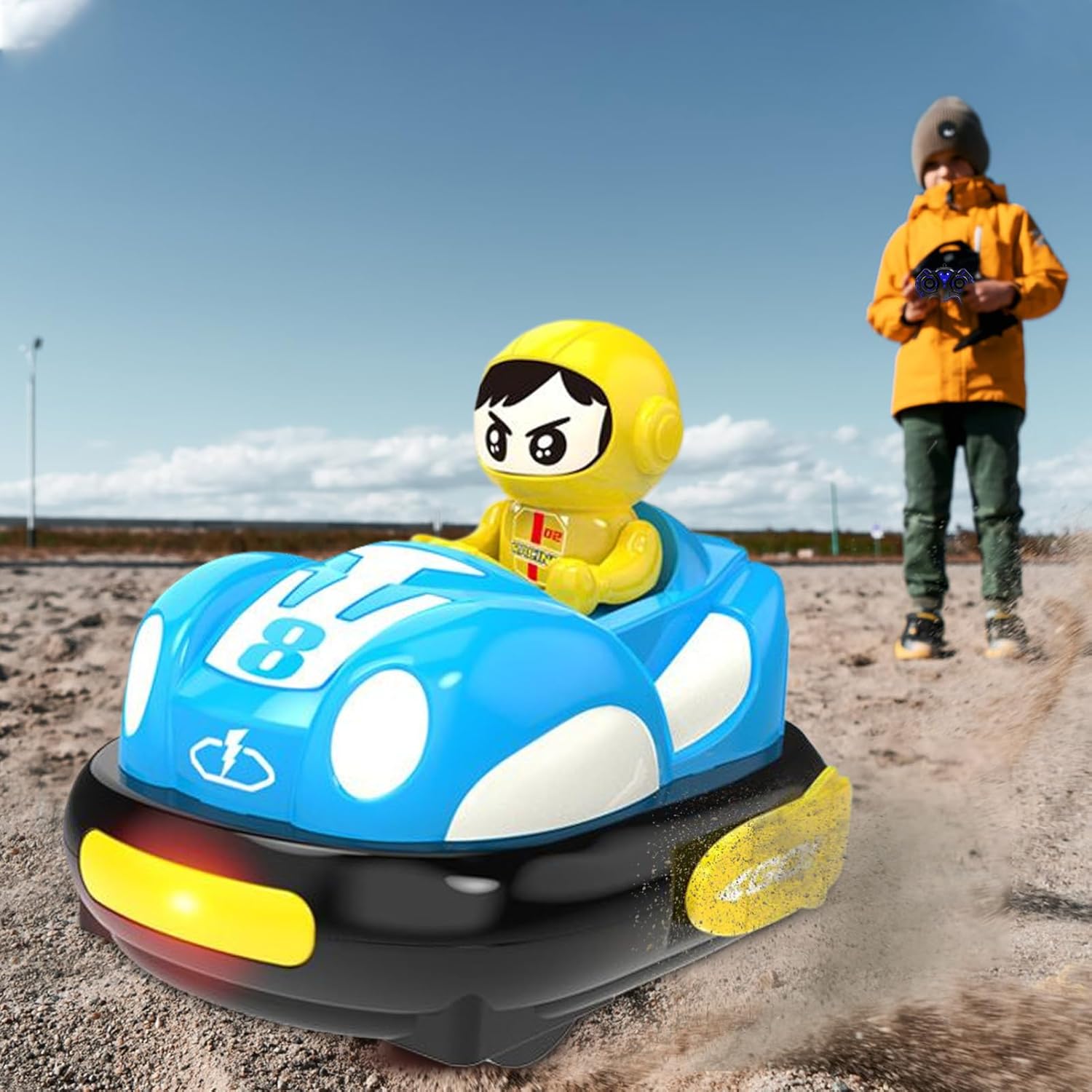 2.4GHz frequency supports smooth play without interference: Enjoy competitive races or bumper battles with multiple players as the stable remote signal prevents lag or overlap, perfect for active playdates, parties, or siblings sharing Soft bumper ring protects walls and furniture from damage: The round edge design absorbs shock during fast turns and bumps, offering peace of mind for indoor use while letting kids go full speed ahead in their mini driving adventures Cartoon-style design appeals to young kids and preschoolers: Bright colors and a cheerful driver character make the toy visually engaging and fun to watch, encouraging pretend play, imagination, and storytelling during every ride Rechargeable vehicle reduces battery waste and downtime: Equipped with a built-in USB rechargeable battery, the car provides extended fun with fewer battery changes, making it eco-friendly and convenient for daily use Kid-friendly controller built for small hands with easy buttons: Simple controls make it easy for and young children to steer and race independently, boosting their hand-eye coordination and confidence during solo or group play