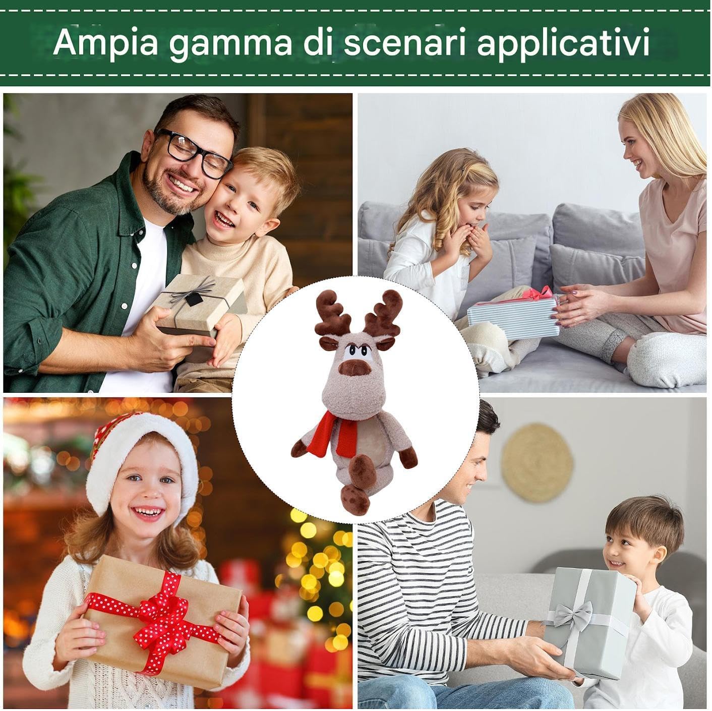 Decorazione della Renna: Questa renna natalizia unisce un aspetto visivo a una presenza rassicurante, garantendo che i bambini si sentano sicuri mentre le famiglie celebrano durante i raduni di Natale o decorano la casa per la stagione . Ideale per creare un'atmosfera e accogliente con questa decorazione per renna natalizia. Stile Stagionale Classico: Le decorazioni natalizie con renna uniscono l'arte tradizionale della renna ad accenti vivaci di sciarpa rossa, elevando il tema natalizio della casa e promuovendo un'atmosfera allegra durante i festeggiamenti invernali. Questo stile intramontabile si adatta a qualsiasi spazio, valorizzando la decorazione con un look festoso e accattivante per tutta la stagione. Prop fotografico creativo: Questi peluche decorativi servono come prop fotografico per molteplici scenari, esaltando l'atmosfera mentre aggiungono charme ad allestimenti natalizi come soggiorni, feste o eventi all'aperto, ideali per fotografie creative e display stagionali. Renna in Peluche per Tutte le Età: Prodotta con tessuto in peluche soffice e materiali di riempimento ecologici, questa renna natalizia fornisce un tocco gentile sulla pelle, migliorando l'atmosfera e il relax personale. È adatta per occasioni speciali come la mattina di Natale o le serate tranquille al , offrendo comfort e gioia. La sua morbidezza la rende un regalo per ogni età, contribuendo a creare ricordi indimenticabili con stile e sicurezza. Idea Regalo Perfetta: La decorazione della renna di Natale rappresenta un regalo natalizio ideale per bambini e amici, arricchendo l'atmosfera con la sua presenza incantevole e promuovendo felicità e serenità durante le occasioni festive o gli incontri stagionali informali, contribuendo a creare momenti indimenticabili per tutta la famiglia con il suo design accattivante e spirito gioioso.
