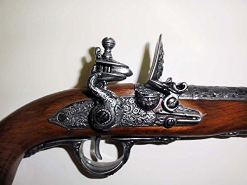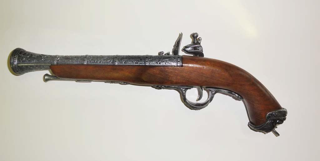 Arma decorativa di alta qualità - pistola ad avancarica con pietra focaia / Italia XVIII secolo. - Lunghezza: 39 cm - Colore: argento e marrone - Materiale: metallo e legno